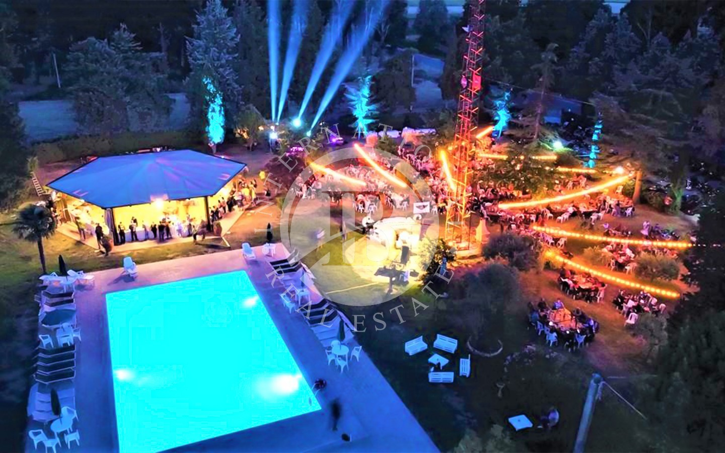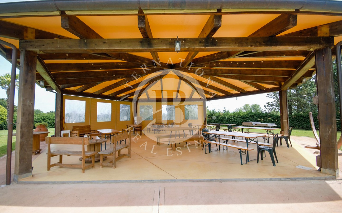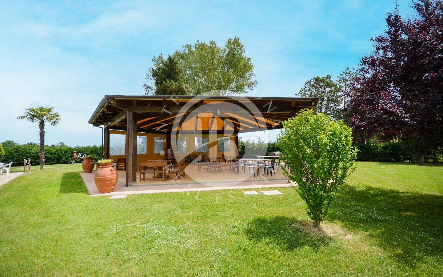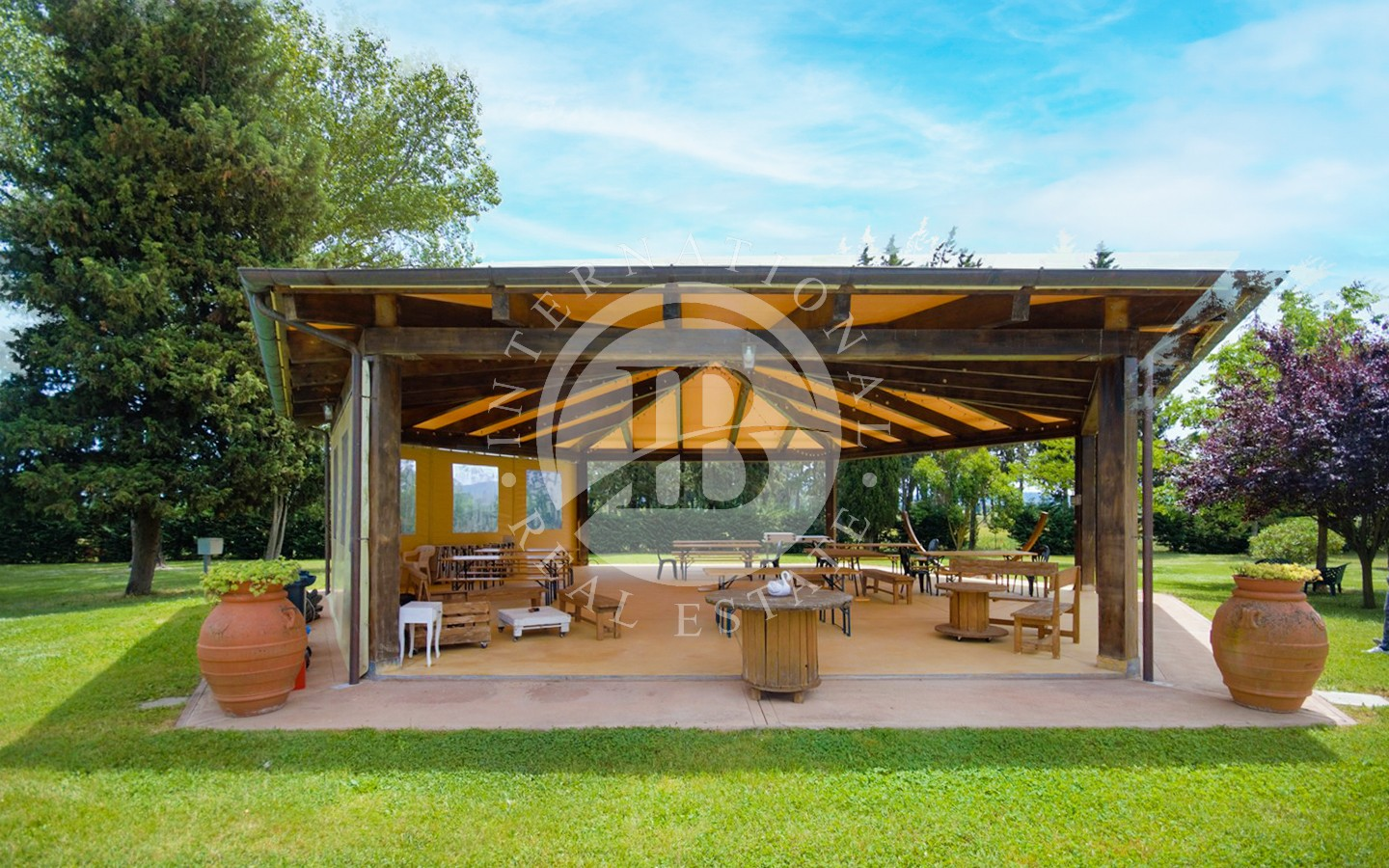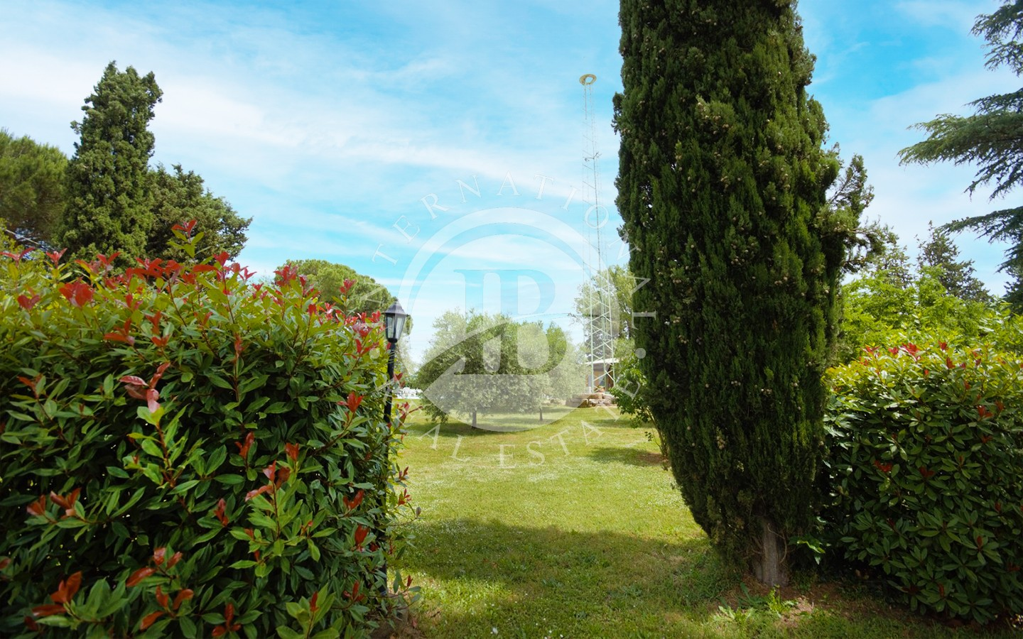 Ejendommen strækker sig over en velholdt park på ca. 9.600 kvadratmeter, beriget med prydtræer og høje planter, som garanterer privatlivets fred og en reserveret atmosfære. Udenfor er der en panoramisk swimmingpool med solarium og et stort lysthus på ca. 160 kvadratmeter, perfekt til arrangementer, ceremonier, tilbagetrækninger eller øjeblikke med afslapning omgivet af grønne områder.