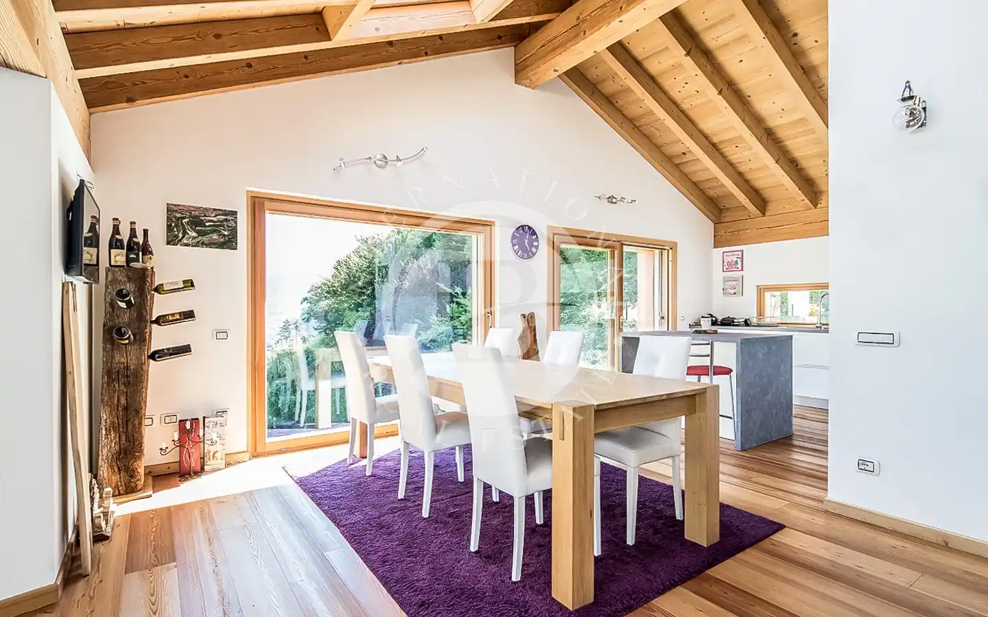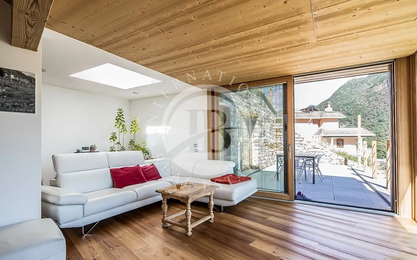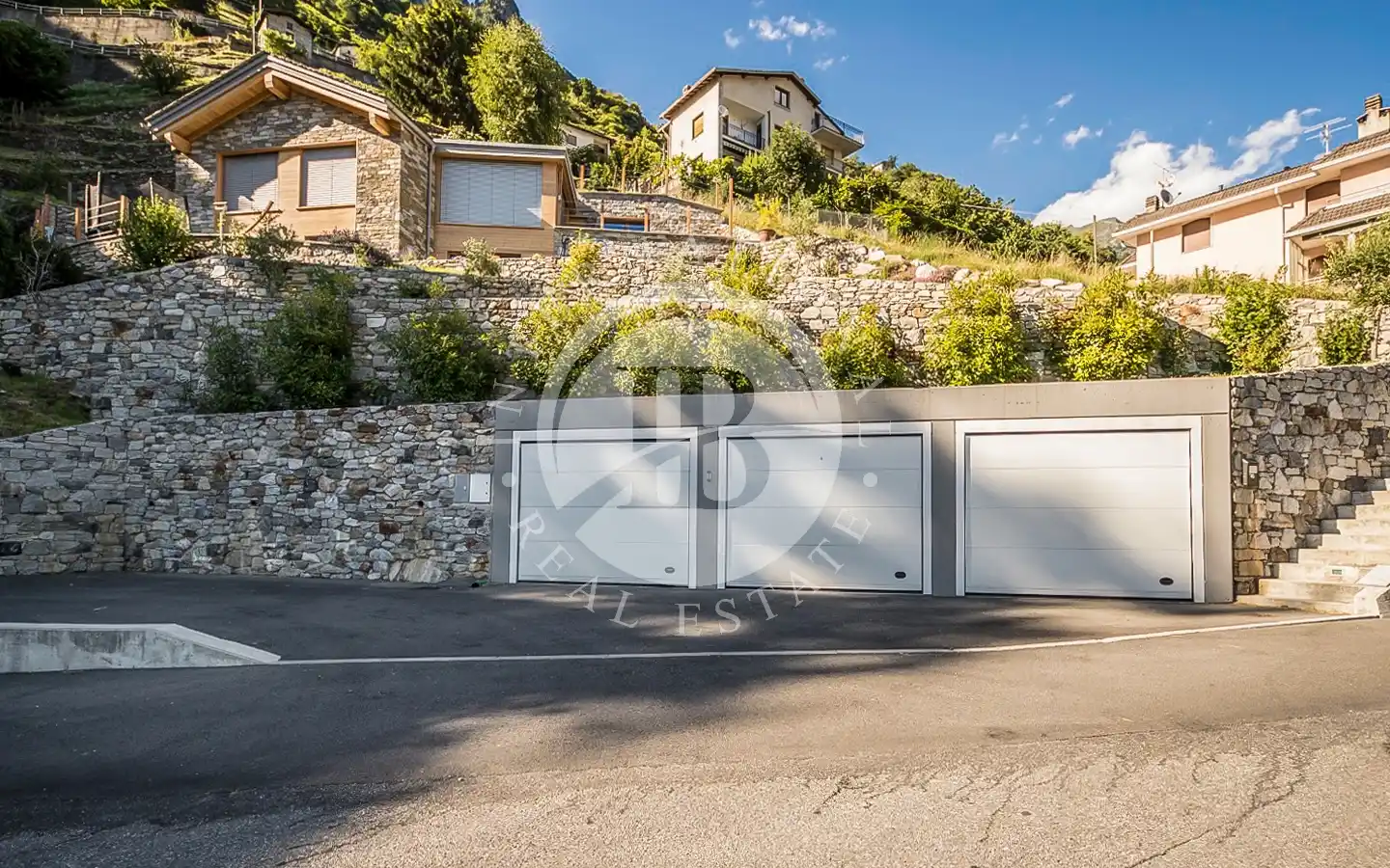 Udendørsområderne strækker sig over cirka 2.000 kvadratmeter privat område og tilbyder en reserveret og velplejet grøn ramme, perfekt til afslapning og udendørsliv. Haven omgiver villaen på harmonisk vis og garanterer privatliv og visuel kontinuitet med det omgivende landskab. Ejendommen har også tre enkeltstående garager og en carport, der sikrer maksimal bekvemmelighed og komfort.