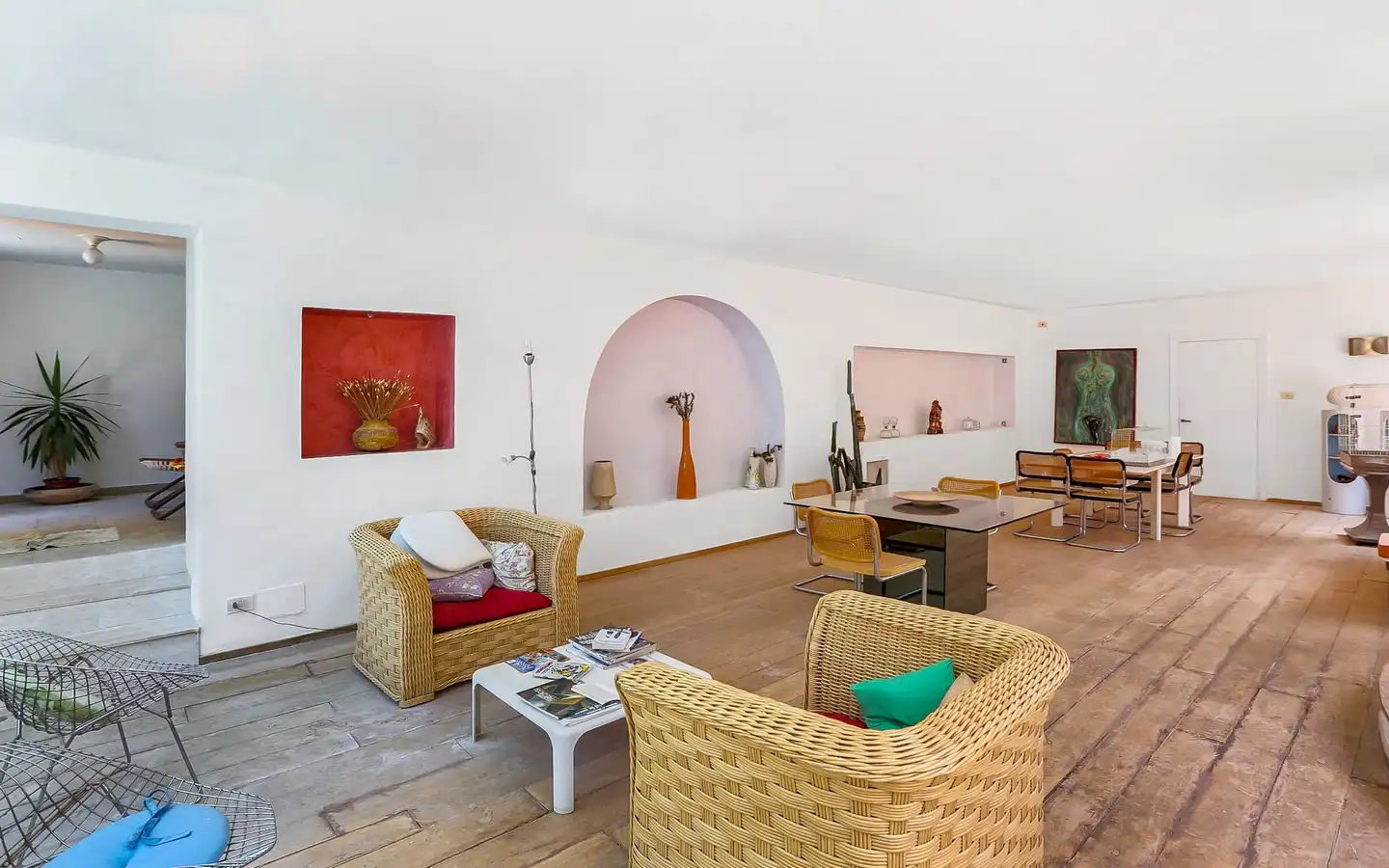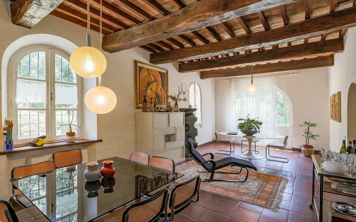 I stueetagen åbner hovedboligen sig op med et køkken med spisestue, et badeværelse, en spisestue og en stue domineret af en imponerende stenpejs: ideelle rammer for hyggelige stunder eller intim afslapning.