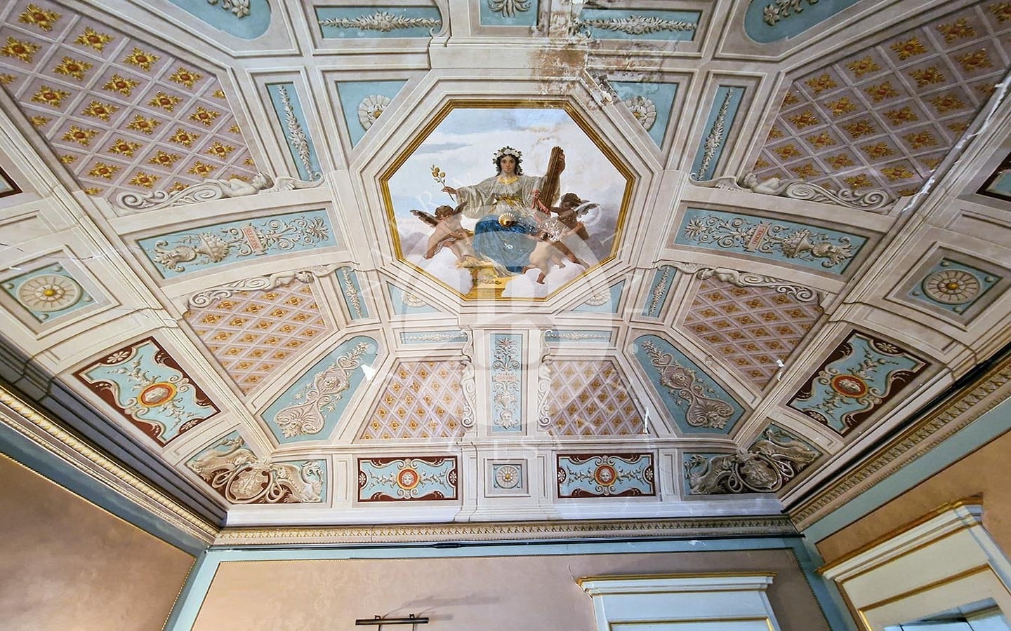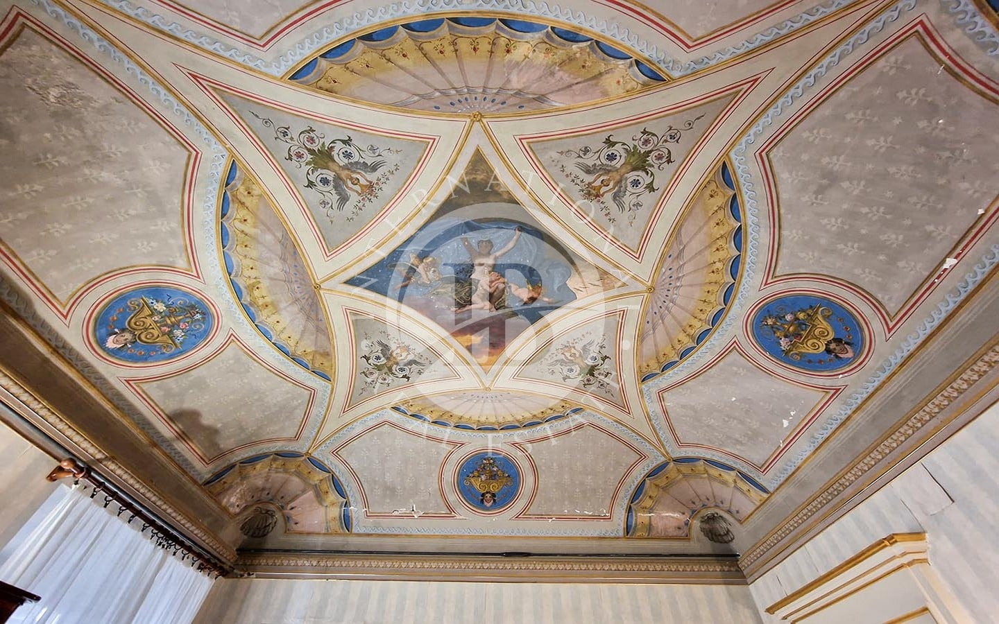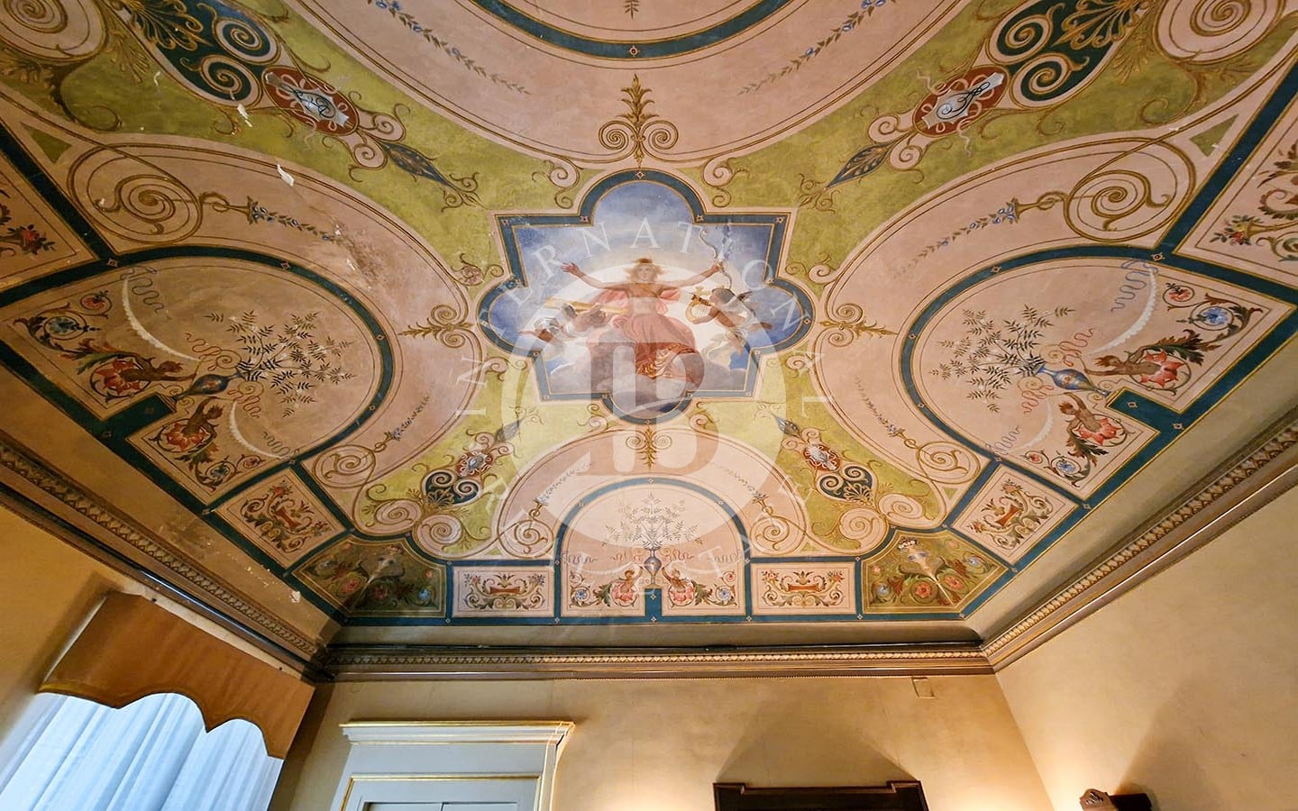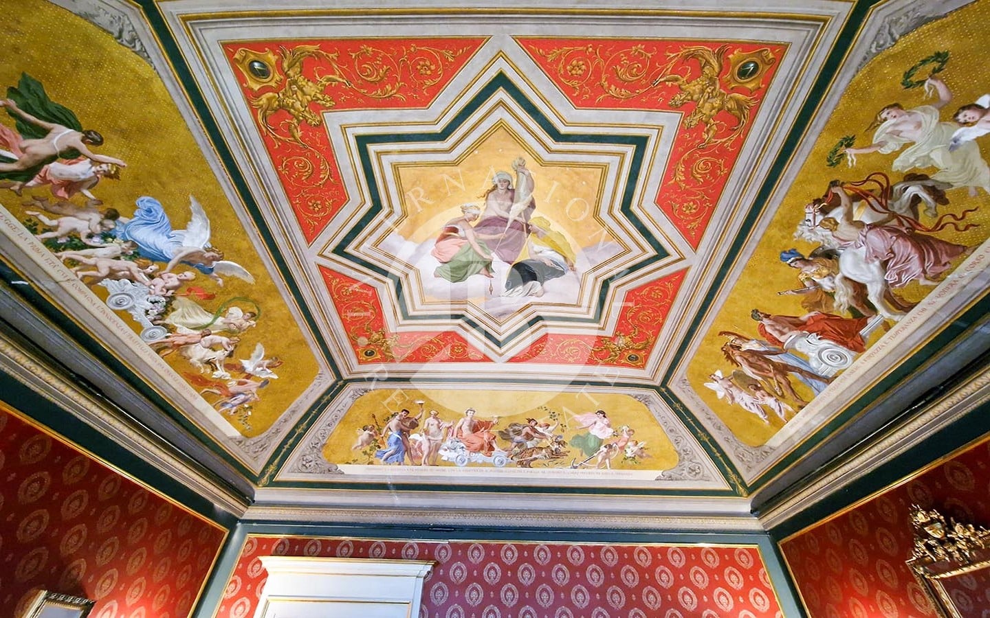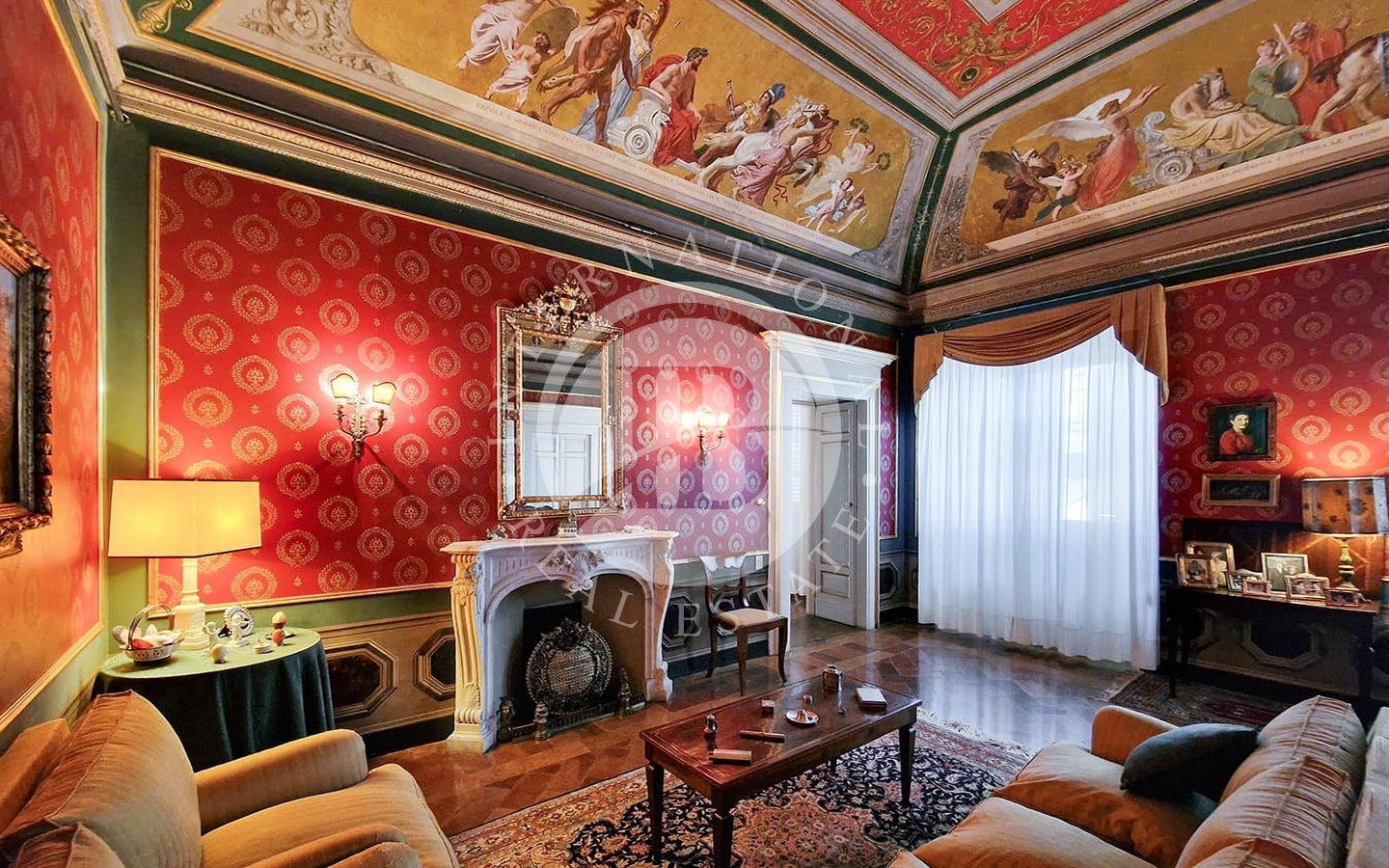 Gli interni sono rifiniti con pavimenti in cotto antico, soffitti affrescati, tra cui alcuni realizzati dal pittore Domenico Bruschi, e pregiati rivestimenti murali. Gli infissi in legno e le porte decorate con dettagli dorati completano il design raffinato. Il palazzo ha recentemente subito una ristrutturazione dell'esterno.
