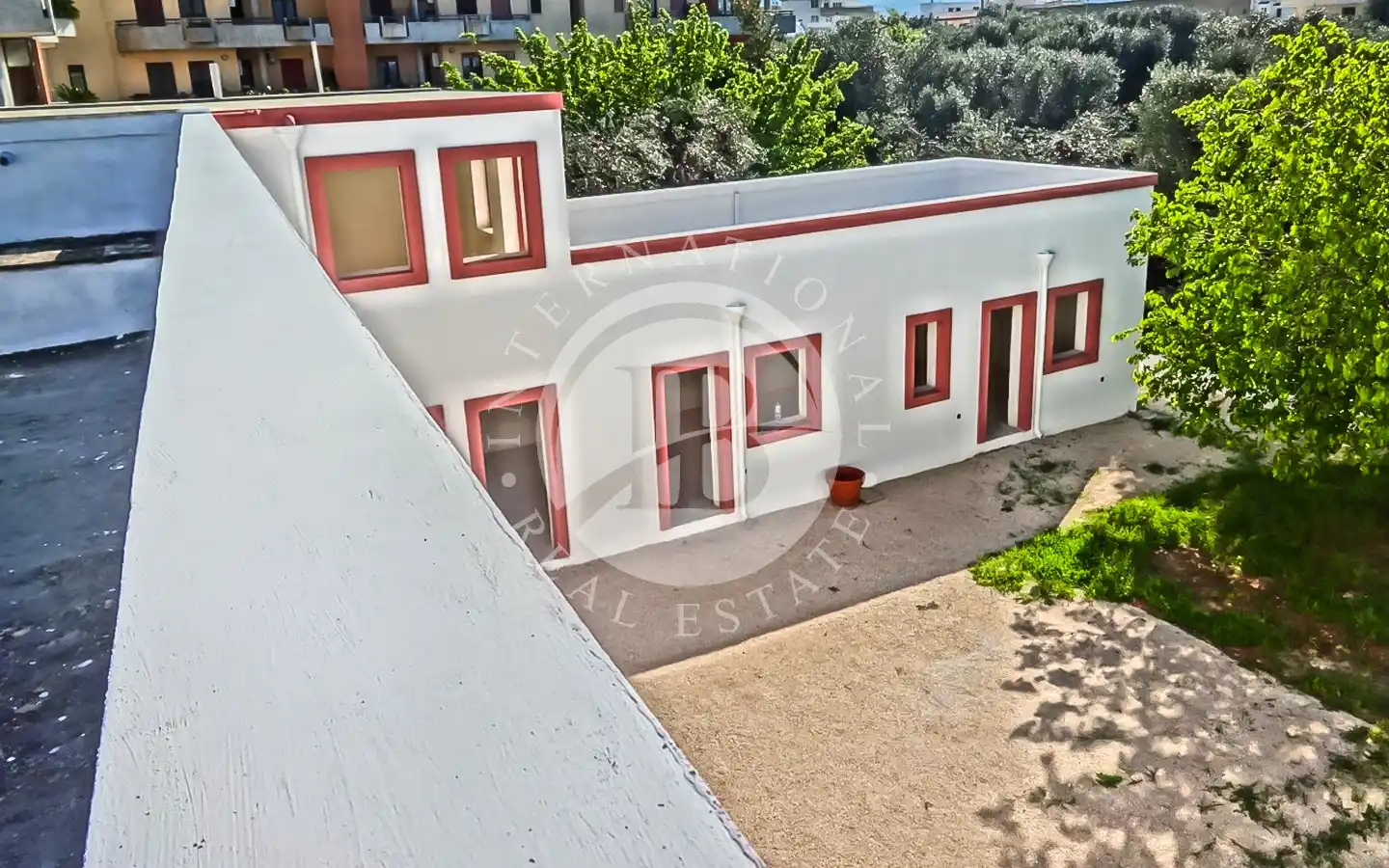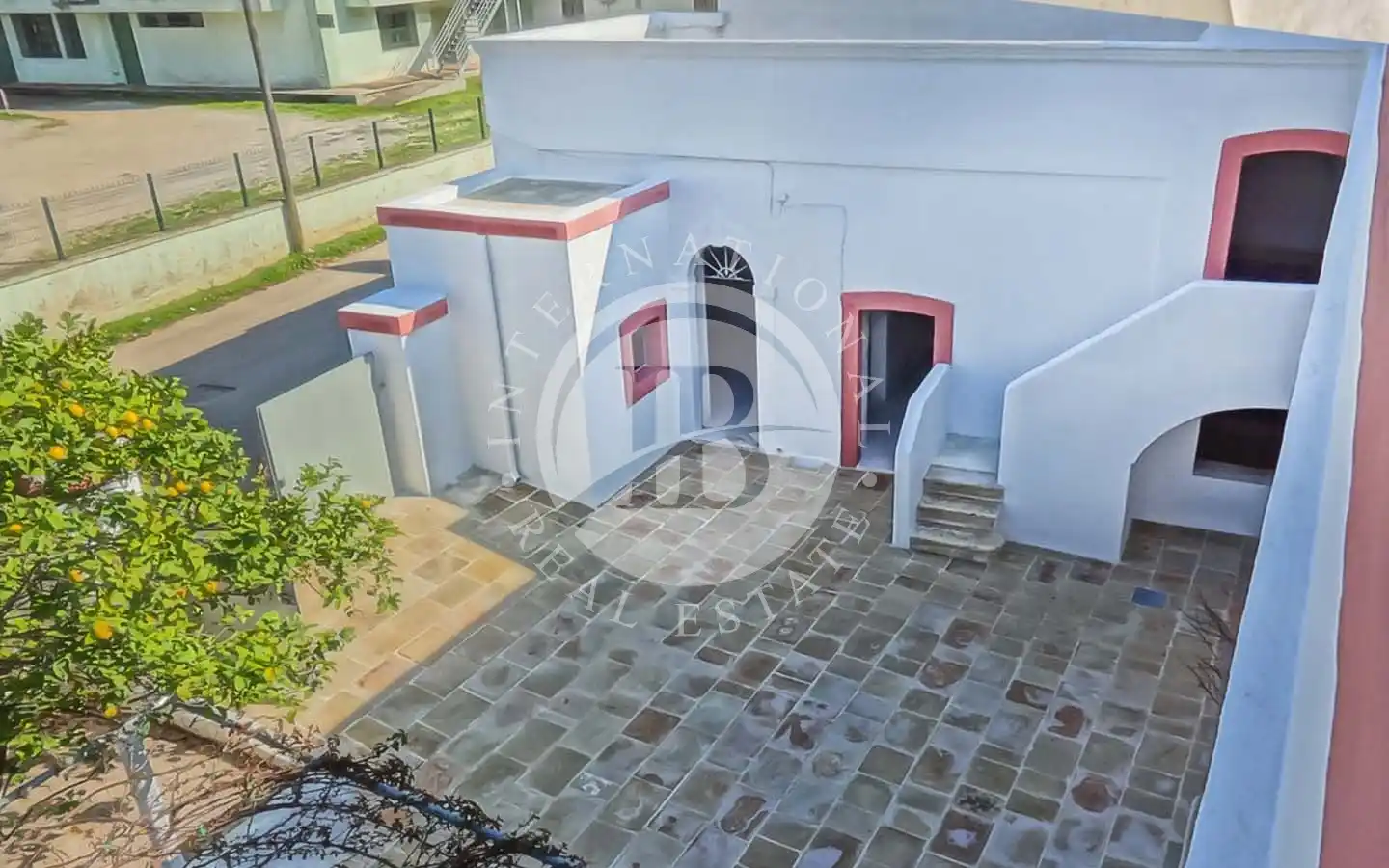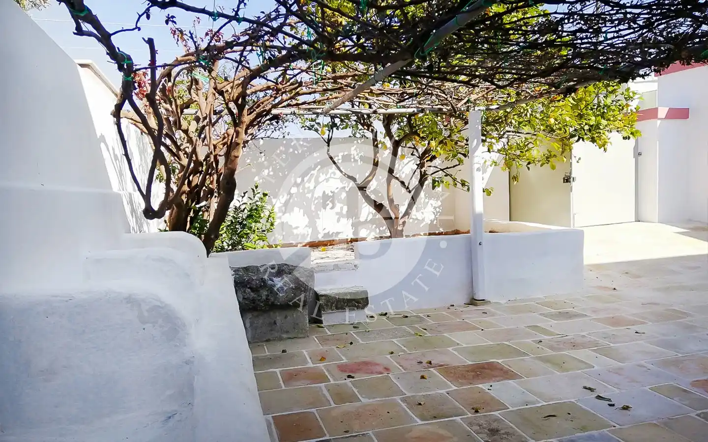 Il piazzale retrostante ospita un maestoso albero di gelsi neri e un giardino di pertinenza con ulivi secolari. È presente una cisterna per la raccolta delle acque piovane, perfettamente stagna e funzionante, oltre a un sistema di smaltimento per le acque meteoriche. L’immobile è dotato di elettricità, acquedotto e fognatura. Data la posizione all’interno della maglia urbana, esiste inoltre la possibilità di ampliamento e la realizzazione di una piscina fino a 40 mq.