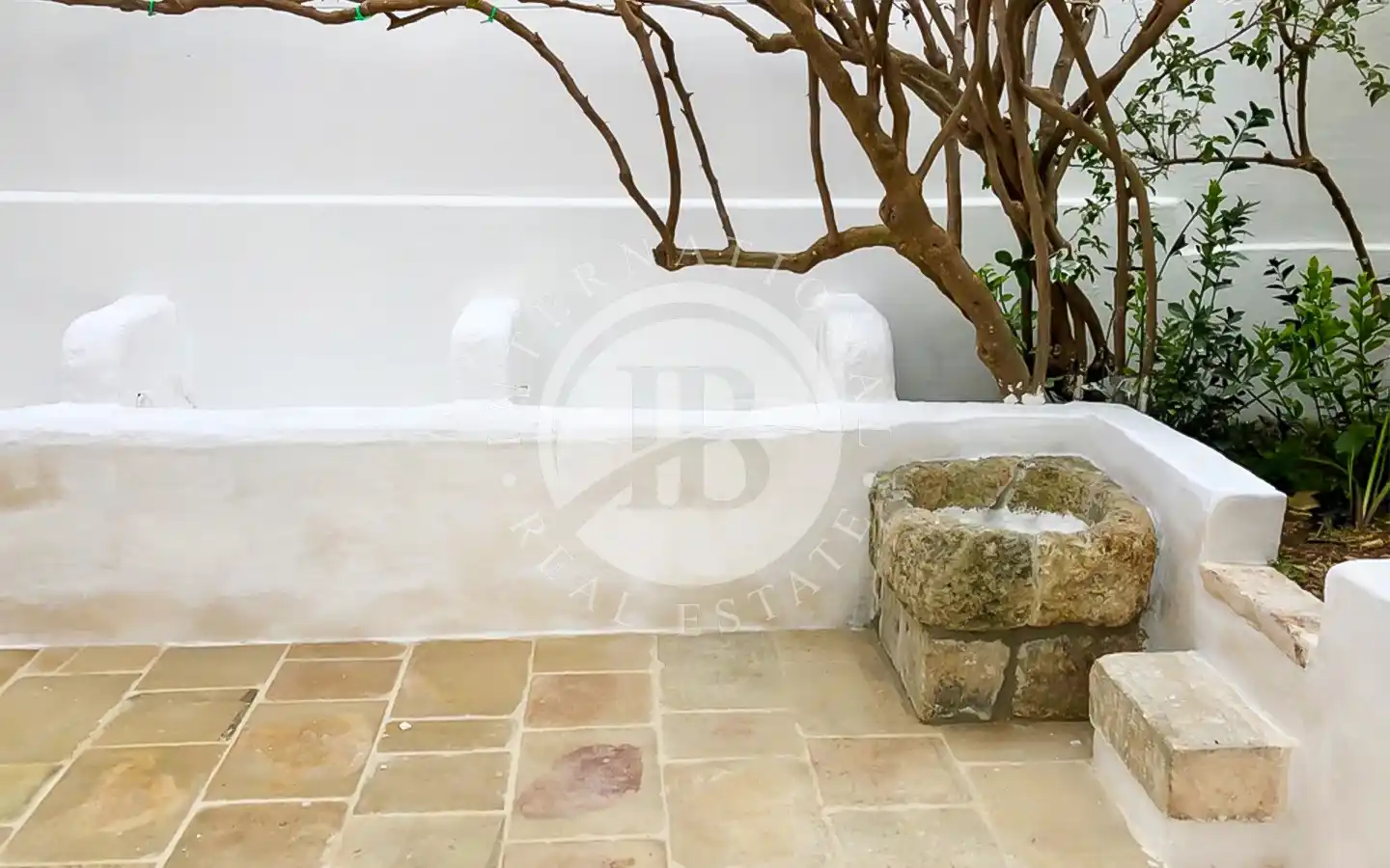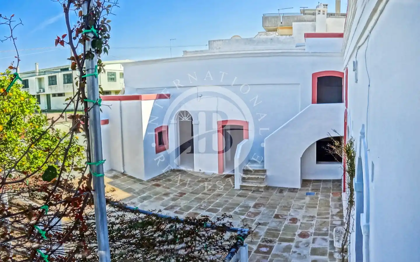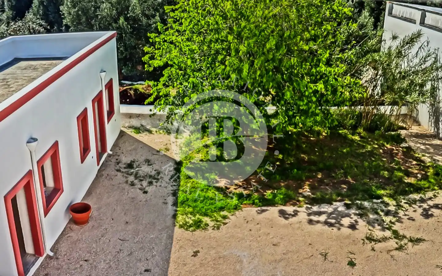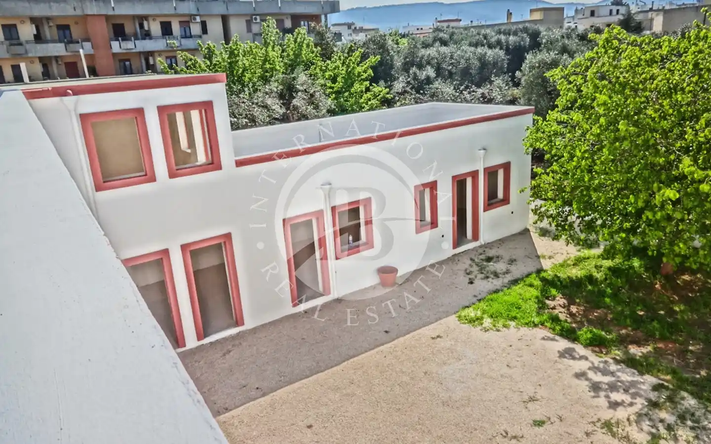 Il piazzale retrostante ospita un maestoso albero di gelsi neri e un giardino di pertinenza con ulivi secolari. È presente una cisterna per la raccolta delle acque piovane, perfettamente stagna e funzionante, oltre a un sistema di smaltimento per le acque meteoriche. L’immobile è dotato di elettricità, acquedotto e fognatura. Data la posizione all’interno della maglia urbana, esiste inoltre la possibilità di ampliamento e la realizzazione di una piscina fino a 40 mq.