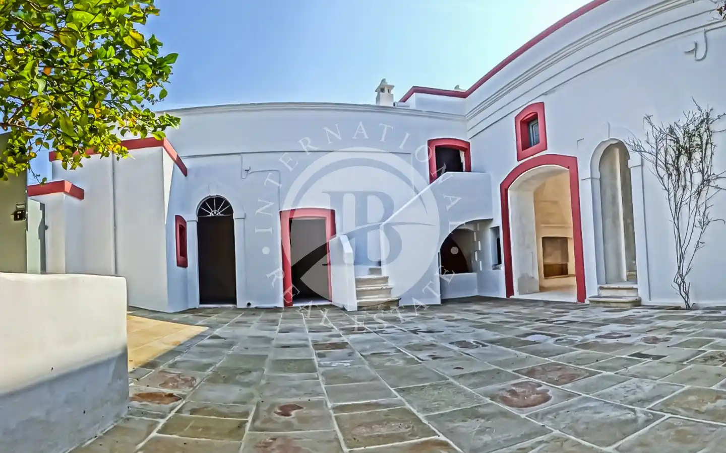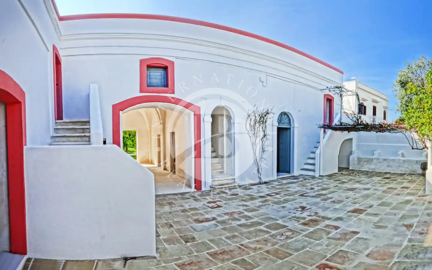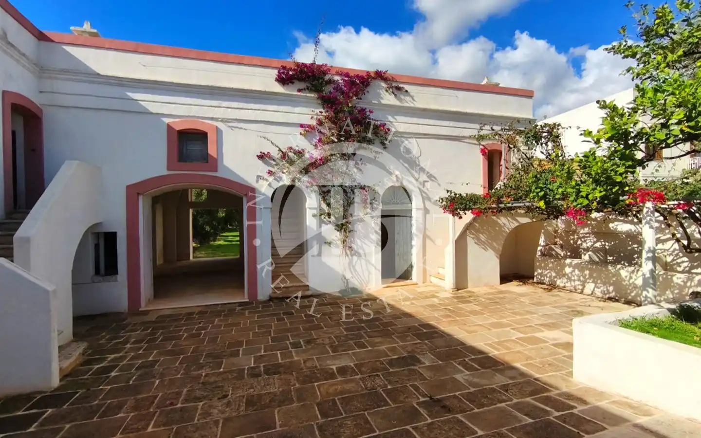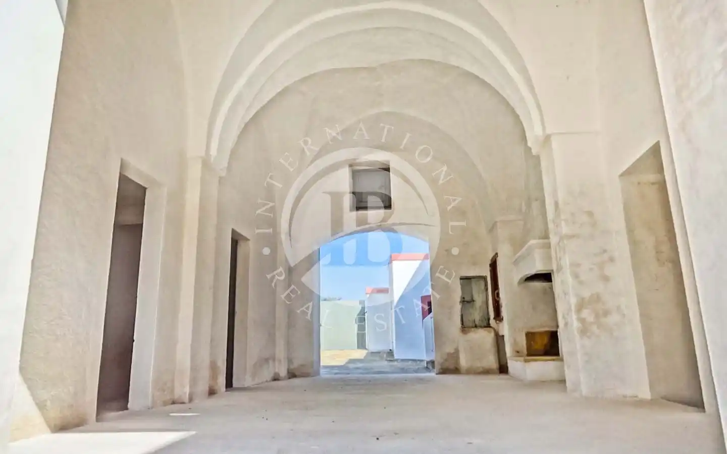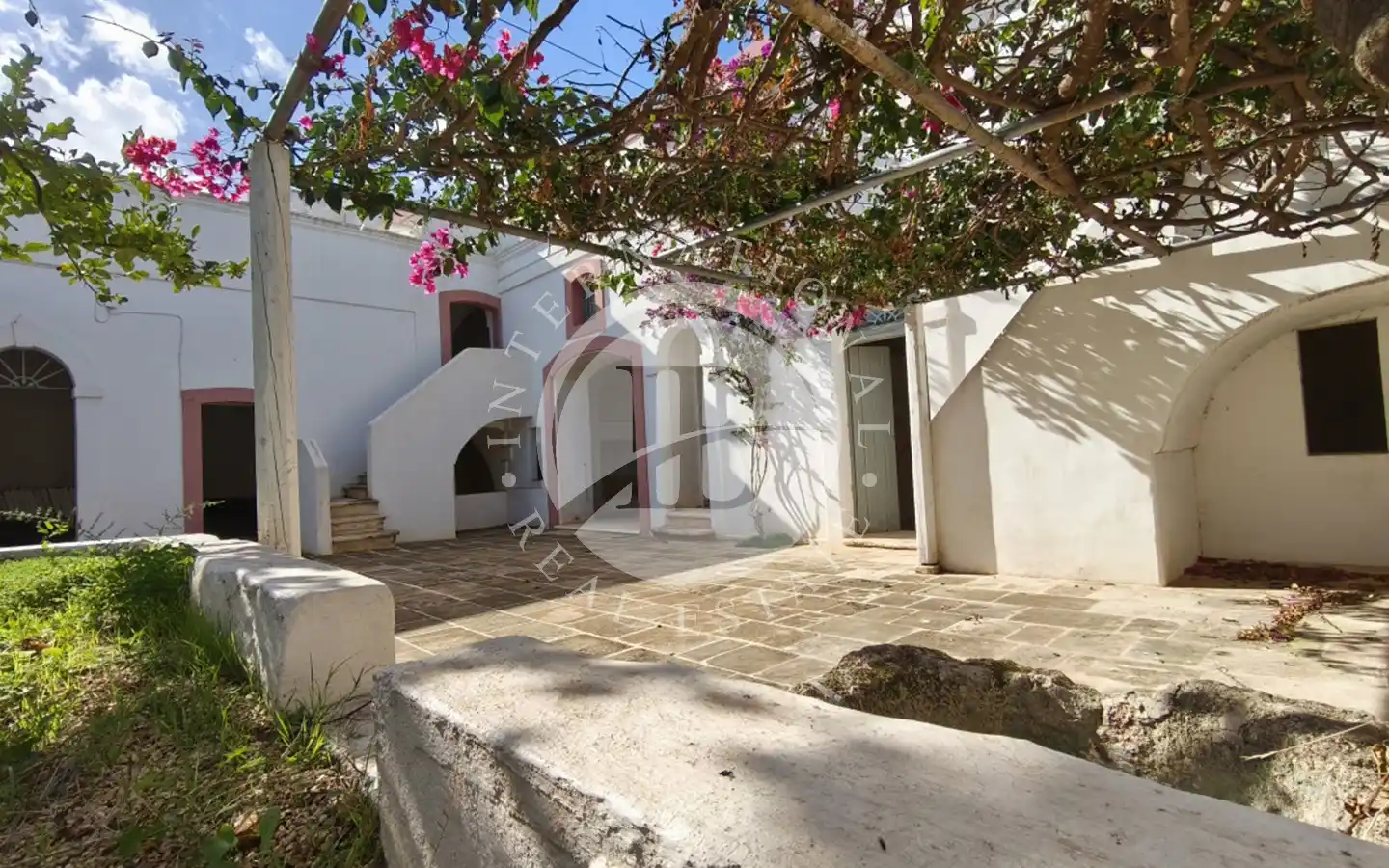 All’esterno si apre un ampio piazzale in pietra naturale antica, impreziosito da una pergola di bouganville che ombreggia le vecchie mangiatoie un tempo destinate agli animali. Numerosi camini originali, tutti funzionanti, conferiscono all’abitazione un’atmosfera calda e accogliente. Il casale è stato costruito a più riprese, come di consueto per le antiche masserie: il primo corpo, risalente ai primi anni dell’Ottocento, era originariamente una stalla, cui si sono aggiunte nel tempo altre stanze con volte tipiche, fino a formare un piccolo borgo abitato da più famiglie.