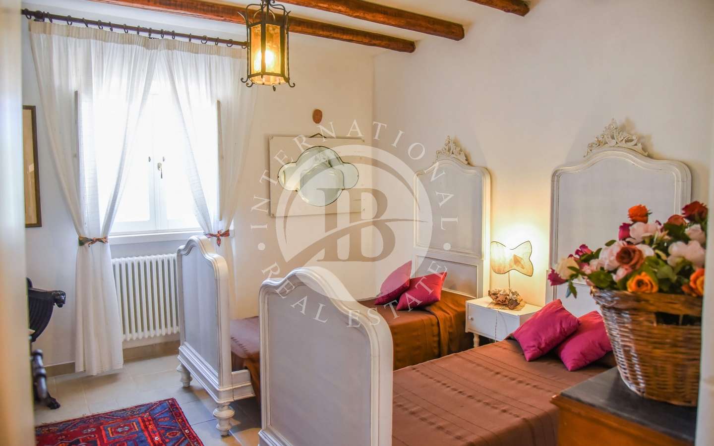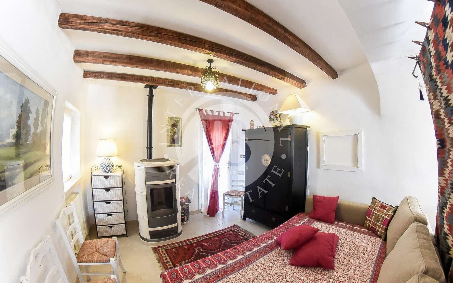 mino, una cucina abitabile, un bagno con doccia e uno studio con zona lavoro. Il grande porticato, recentemente chiuso da eleganti vetrate scorrevoli, è suddiviso in una zona living e una zona pranzo, consentendo di godere degli spazi esterni anche durante le giornate più calde, riparandosi all'ombra della natura.