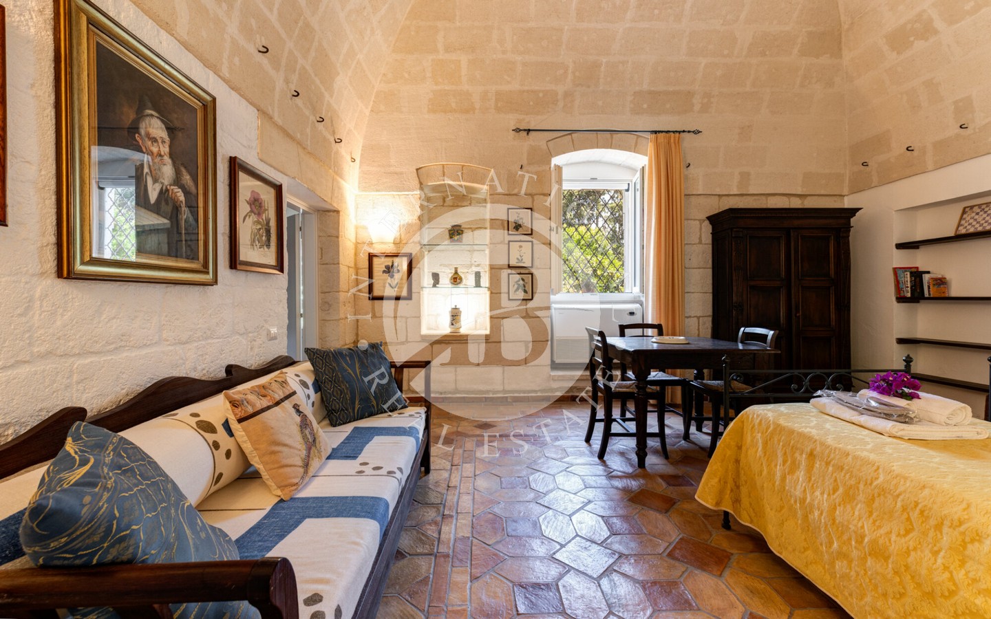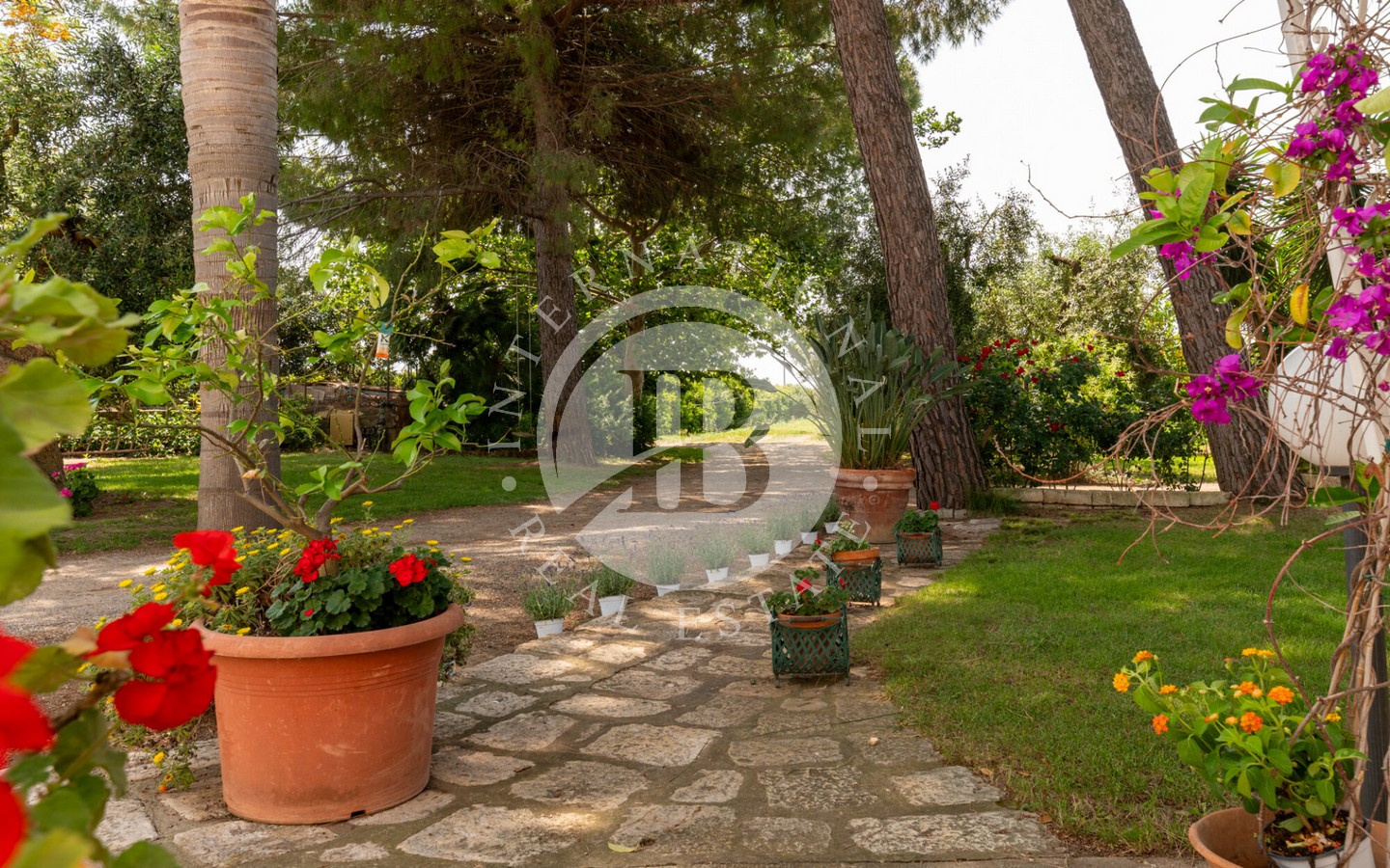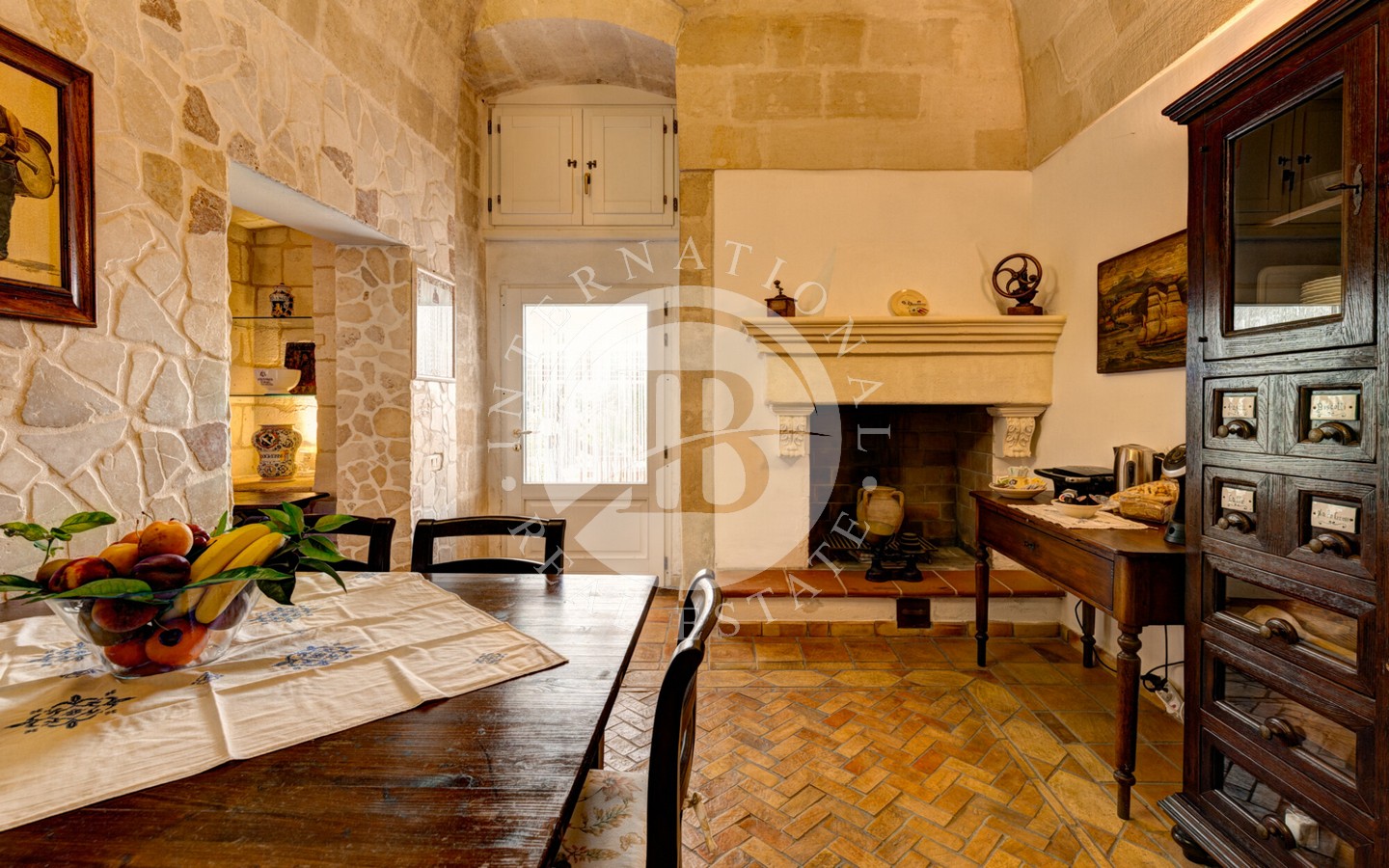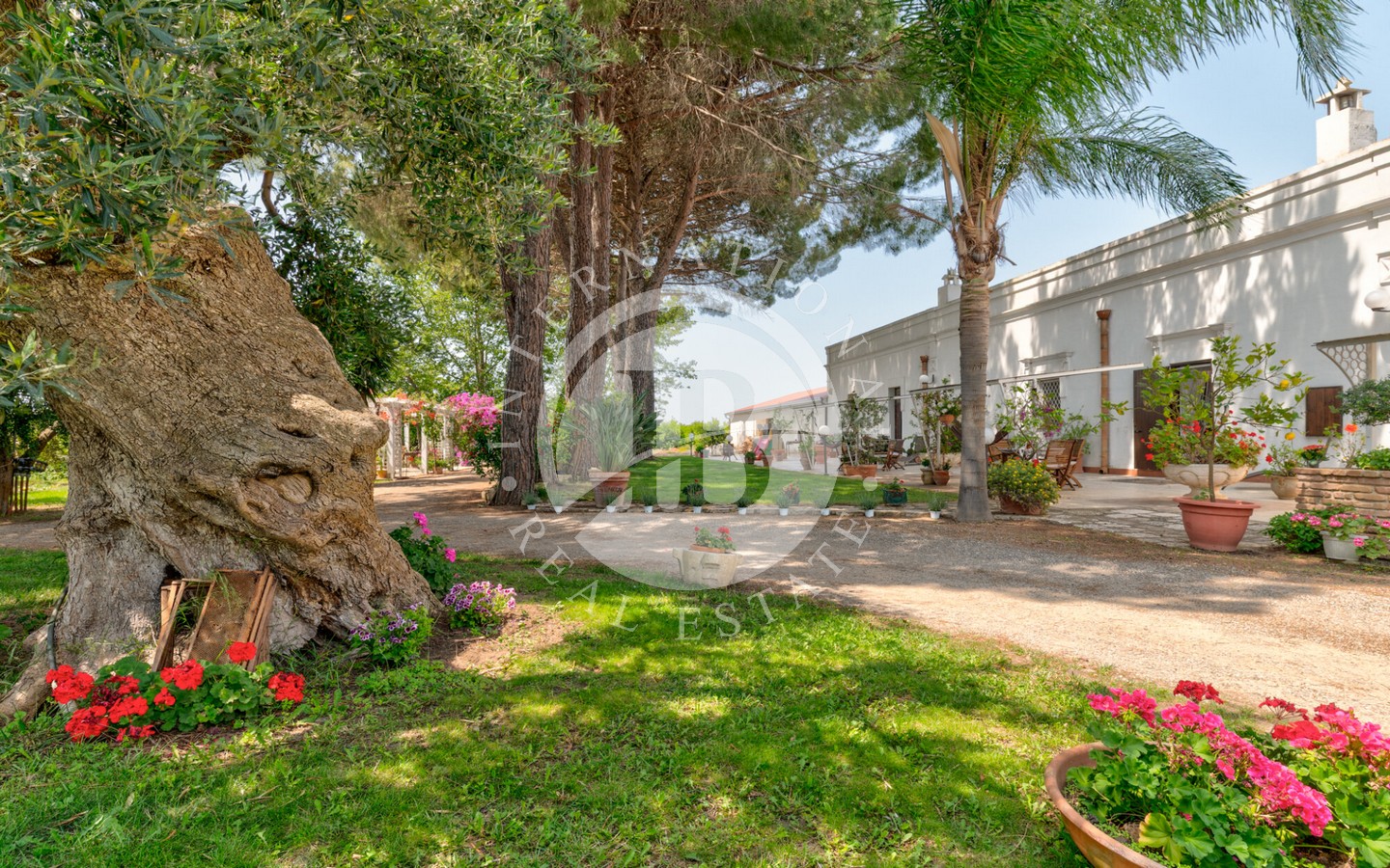 senza semi, un oliveto destinato alla produzione di olio extravergine e un vigneto a spalliera di 4 ettari, capace di produrre fino a 20.000 bottiglie annue. Il paesaggio agricolo, curato e produttivo, incornicia la masseria principale, un edificio storico recentemente ristrutturato con cura, che conserva tutti i dettagli architettonici originali: pavimenti in cotto antico, alte volte a croce in pietra di tufo e maestosi camini in pietra.
