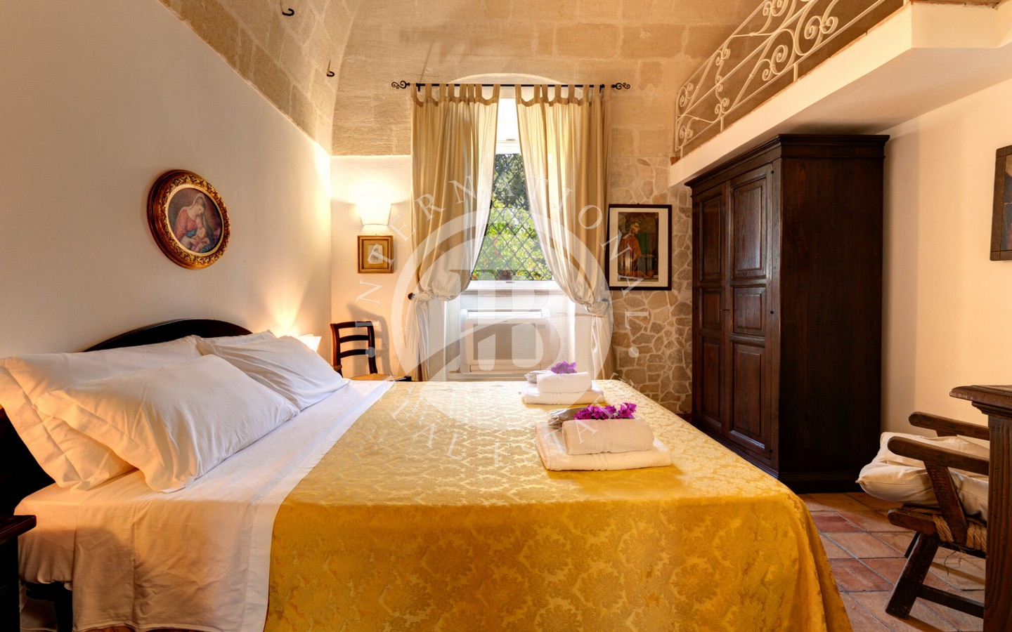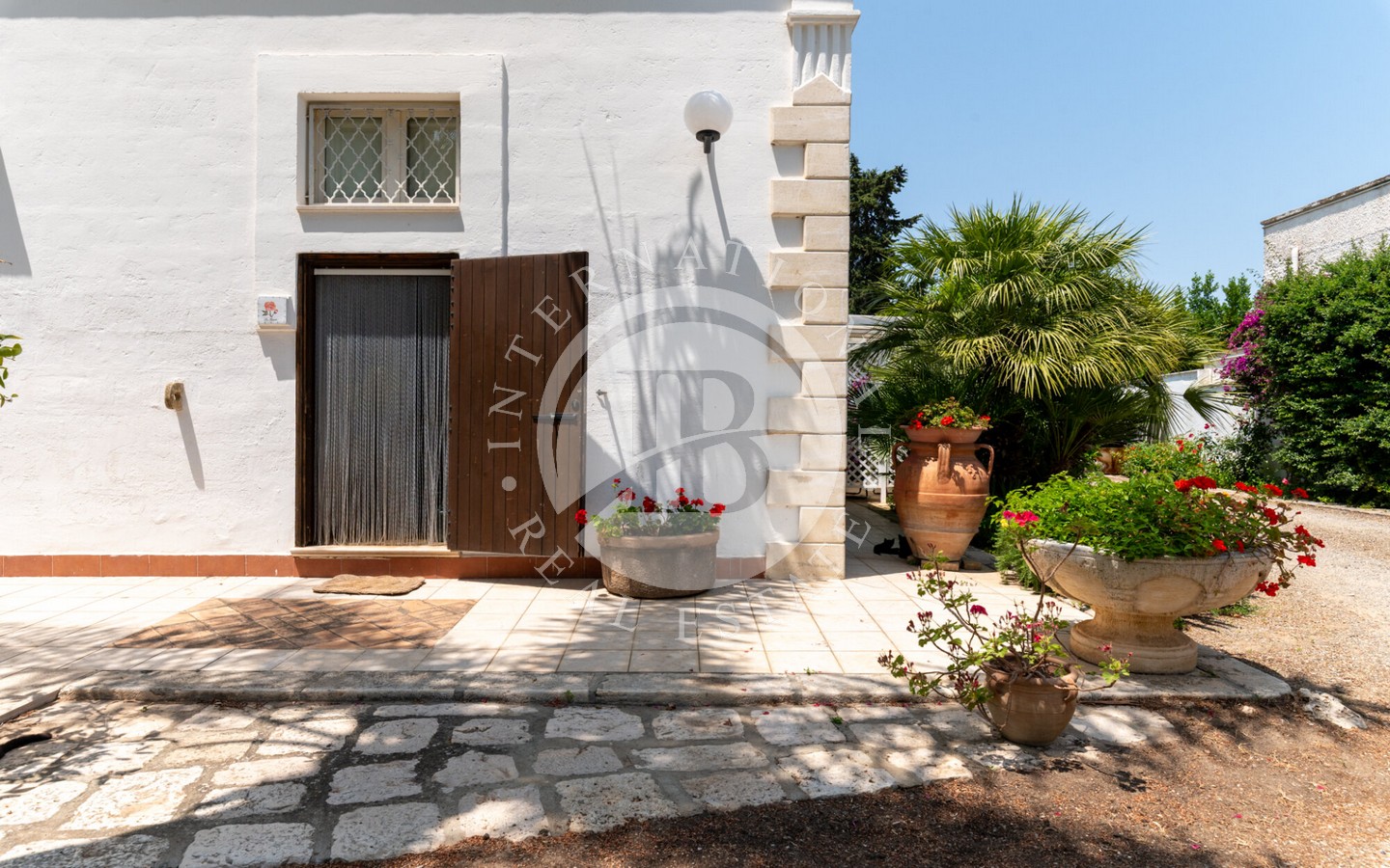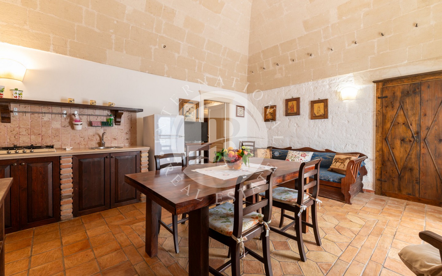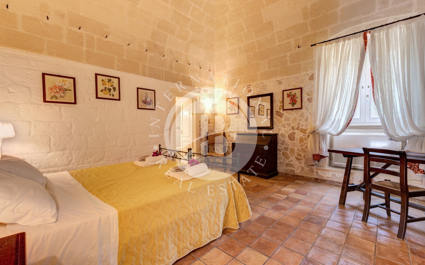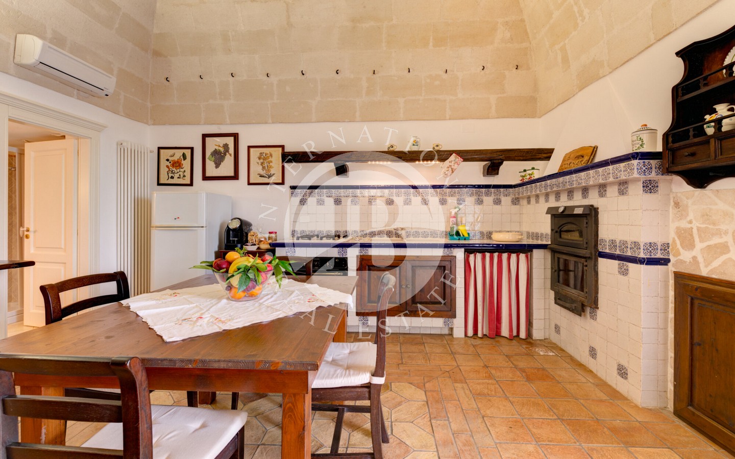 senza semi, un oliveto destinato alla produzione di olio extravergine e un vigneto a spalliera di 4 ettari, capace di produrre fino a 20.000 bottiglie annue. Il paesaggio agricolo, curato e produttivo, incornicia la masseria principale, un edificio storico recentemente ristrutturato con cura, che conserva tutti i dettagli architettonici originali: pavimenti in cotto antico, alte volte a croce in pietra di tufo e maestosi camini in pietra.