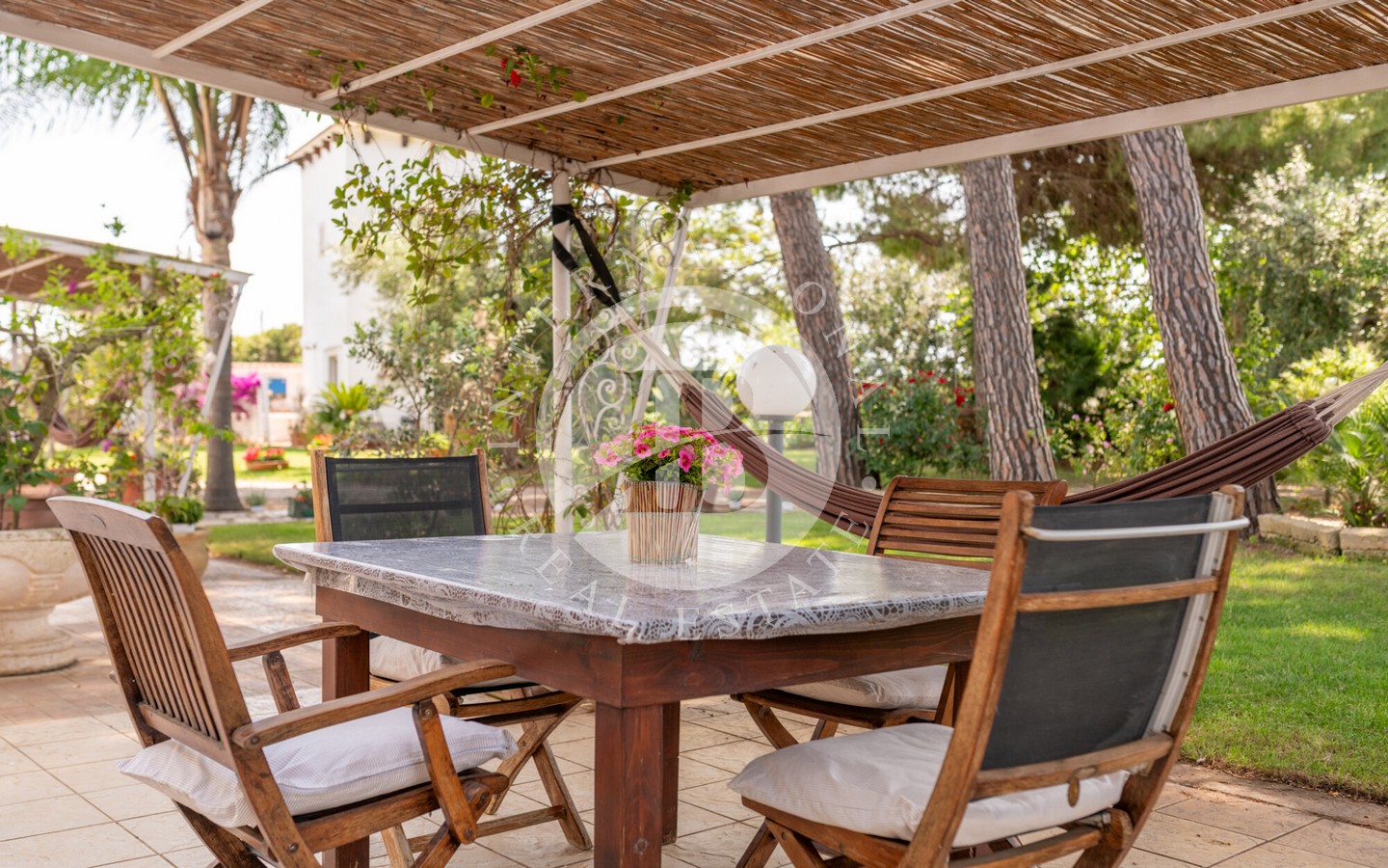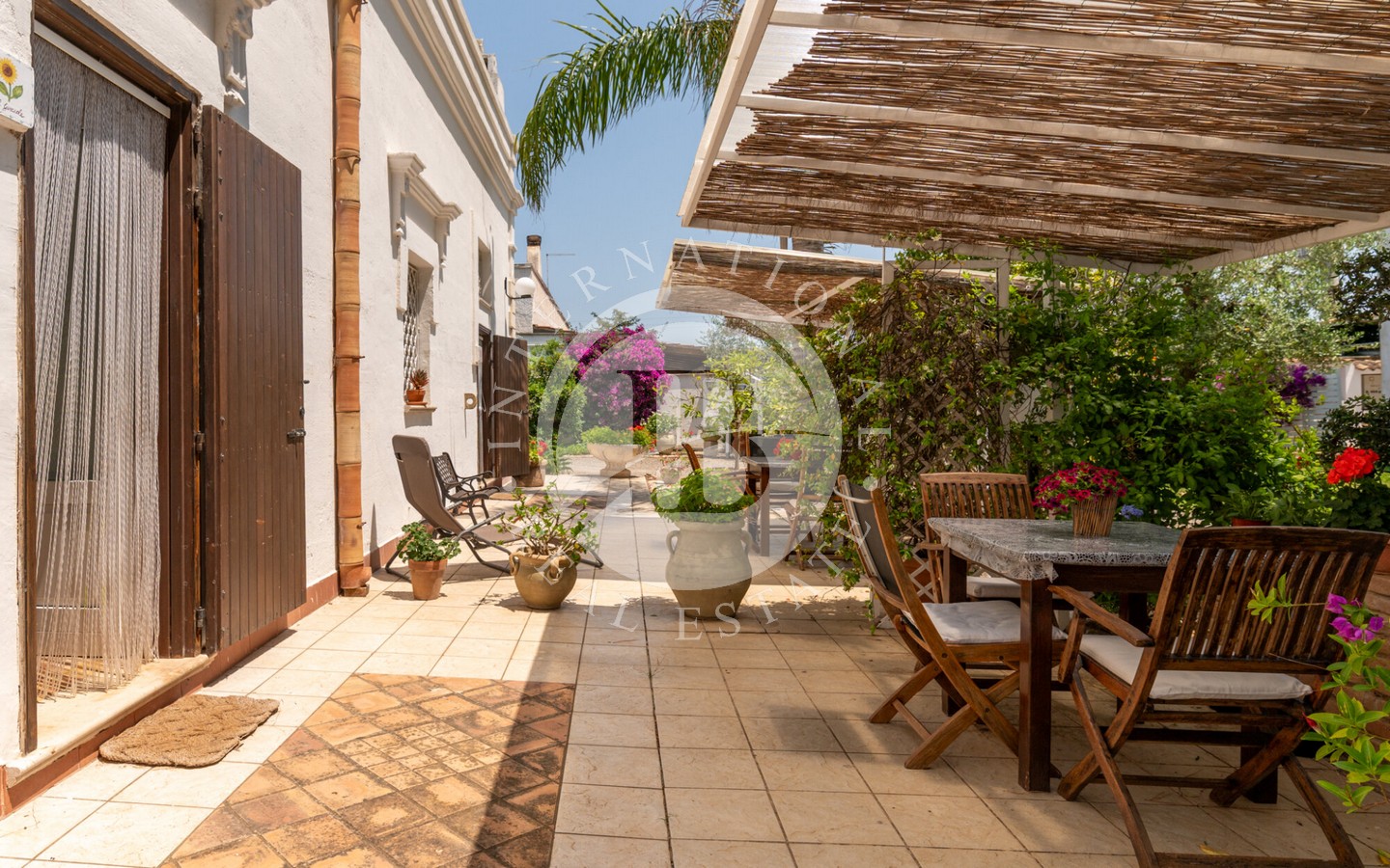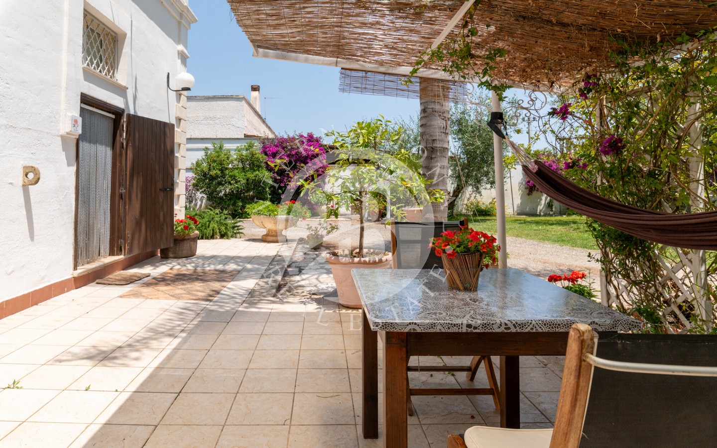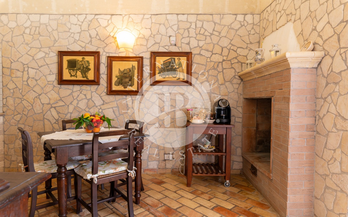 senza semi, un oliveto destinato alla produzione di olio extravergine e un vigneto a spalliera di 4 ettari, capace di produrre fino a 20.000 bottiglie annue. Il paesaggio agricolo, curato e produttivo, incornicia la masseria principale, un edificio storico recentemente ristrutturato con cura, che conserva tutti i dettagli architettonici originali: pavimenti in cotto antico, alte volte a croce in pietra di tufo e maestosi camini in pietra.