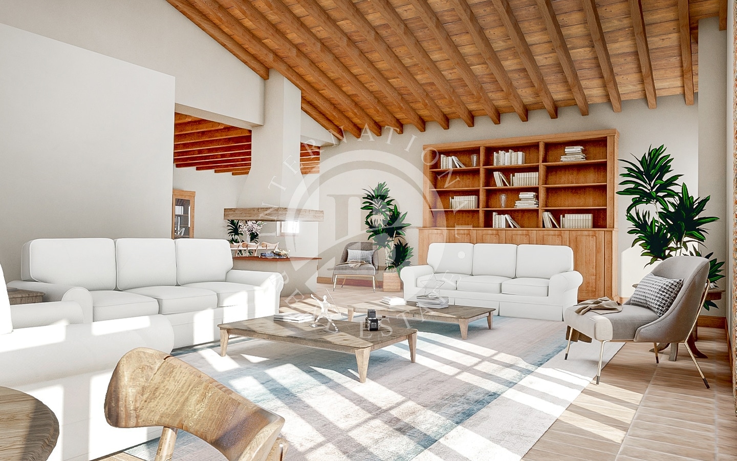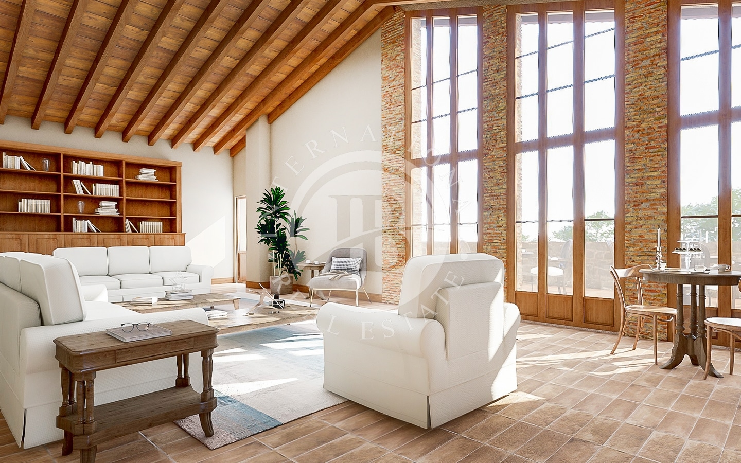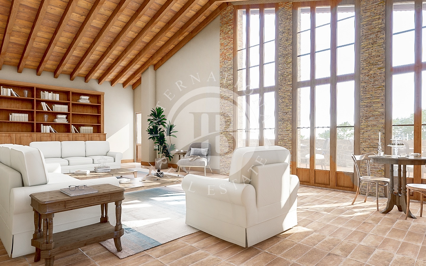 La seconda struttura offre un ampio soggiorno/cucina con camino e forno a legna che si affaccia su un grande terrazzo con vista panoramica sull'intera proprietà.