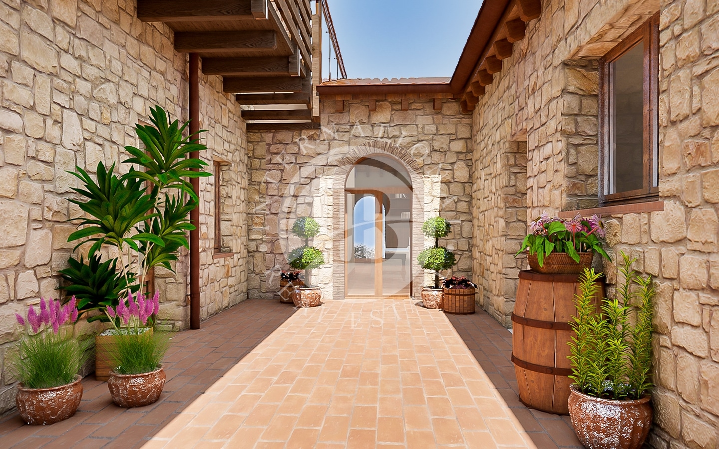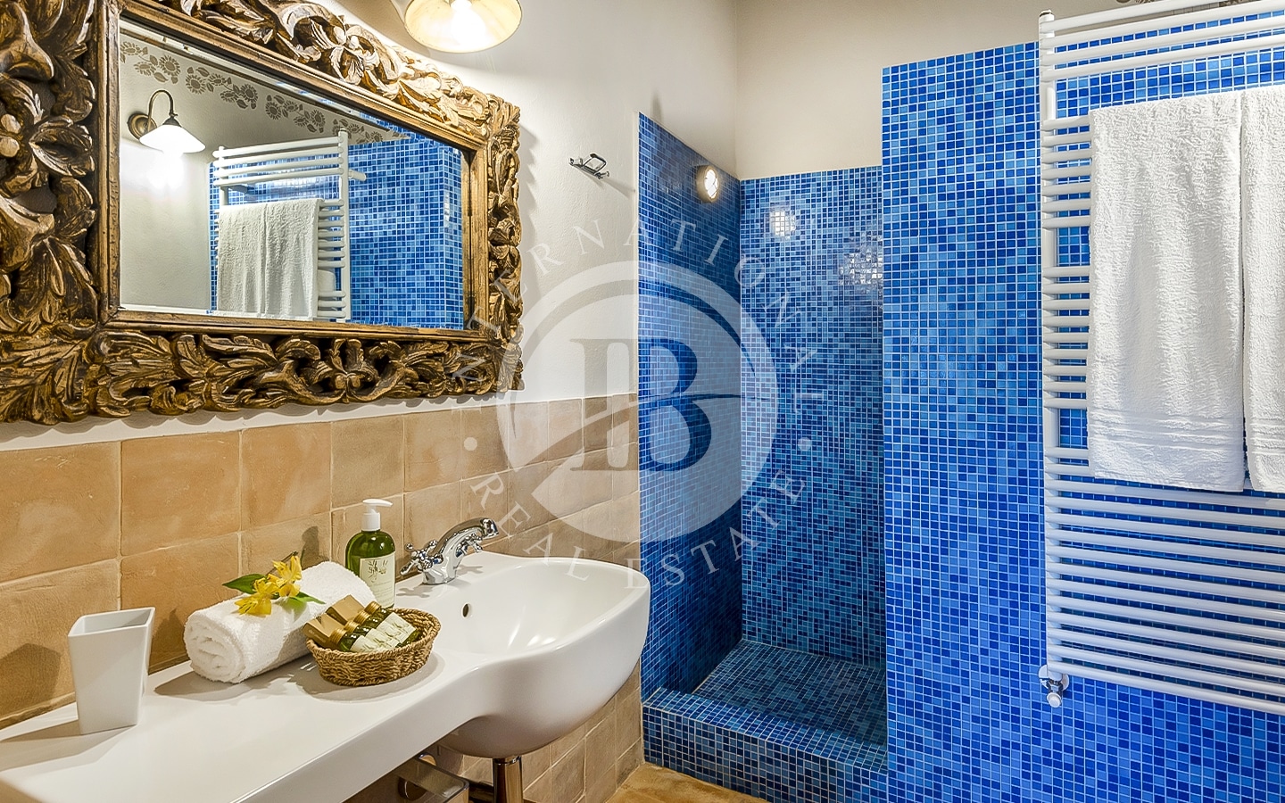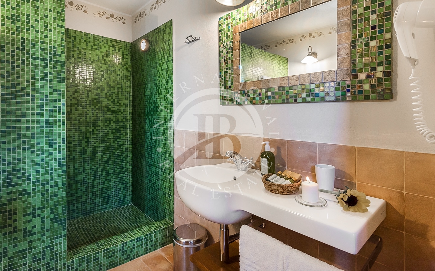 a, vanta un salone elegante con camino che si affaccia su un terrazzo panoramico, una cucina spaziosa e attrezzata, una zona relax con bagno adiacente e 10 camere da letto con bagno privato, caratterizzate da finiture in terracotta e mosaici Bisazza. Completano questa parte della proprietà una dispensa, un magazzino e una spaziosa lavanderia indipendente.
