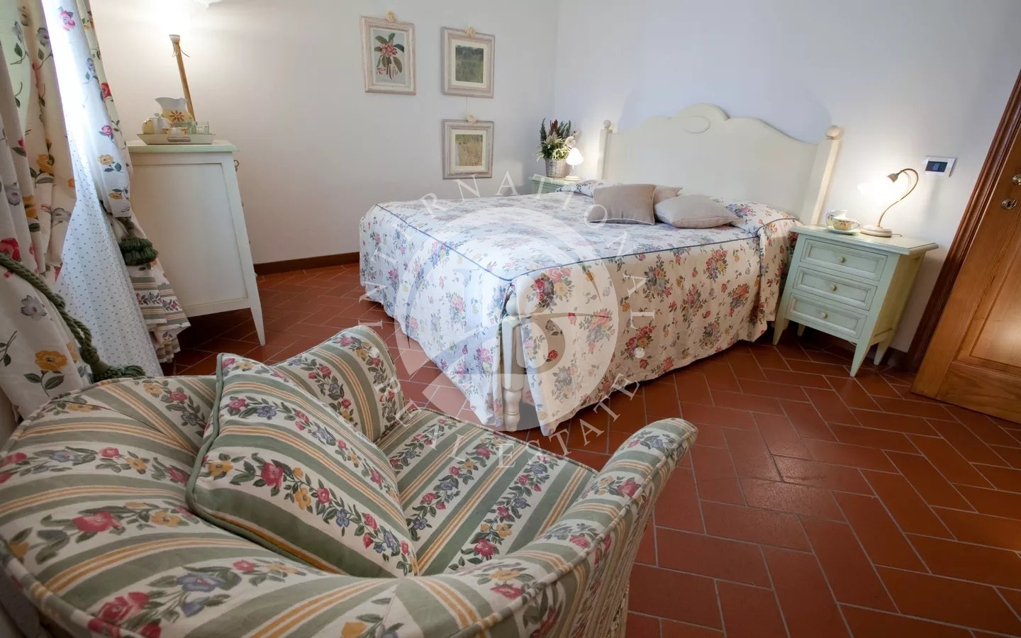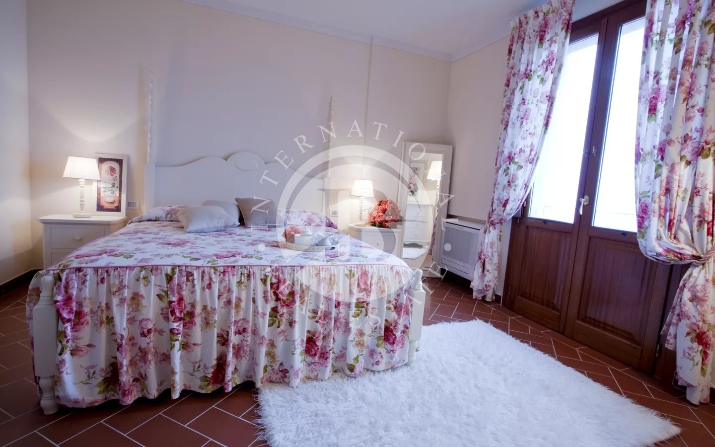Una scalinata in cotto conduce al primo piano dove si trovano cinque camere da letto, ognuna con bagno en-suite, una sesta cameretta con bagno adibita ad ufficio, una settima con bagno adibita a camera per il personale e un ripostiglio.