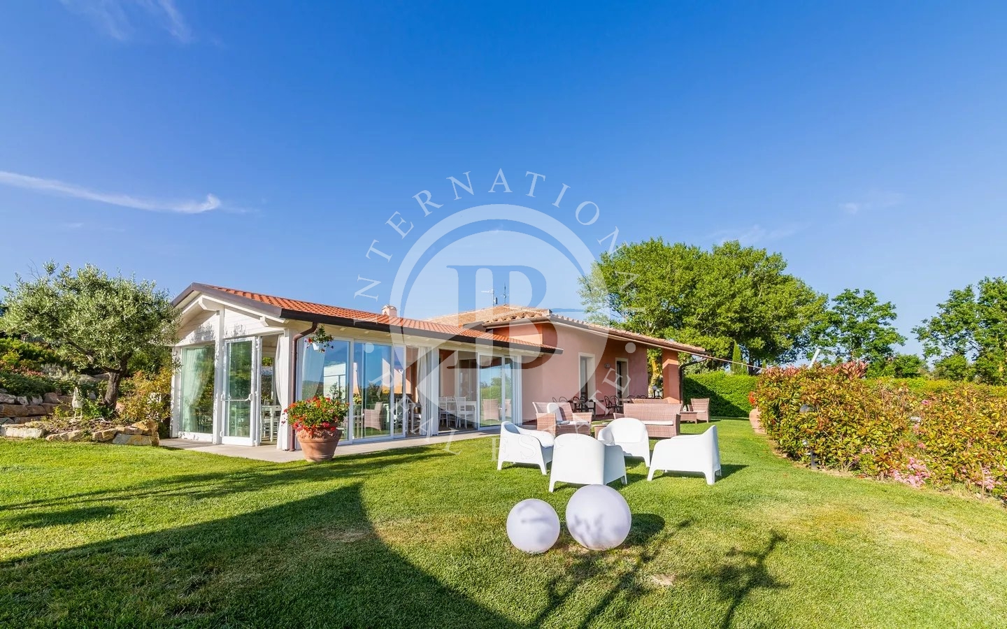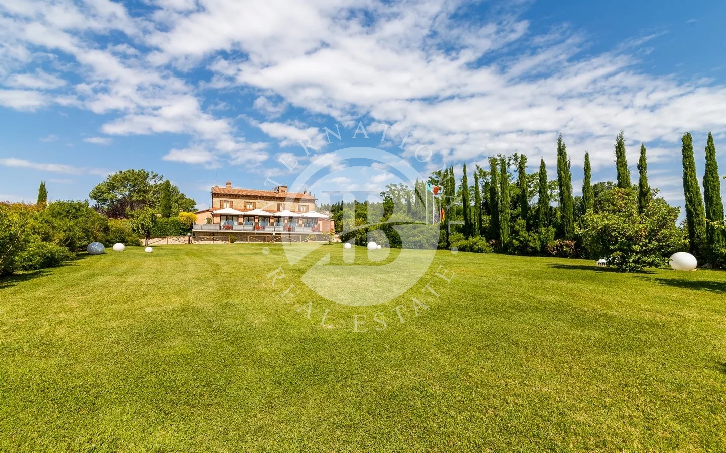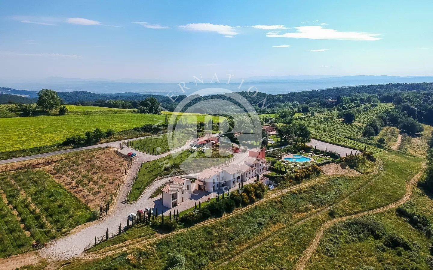 A completamento della proprietà un terreno di 73.3 ha suddiviso in vigneto (2.5ha), uliveto (4.1ha), giardino all’inglese(16.6ha) con rigogliose siepi e zona boschiva(50.1ha), una piscina con vista aperta sulle colline antistanti la proprietà e un ampio parcheggio.