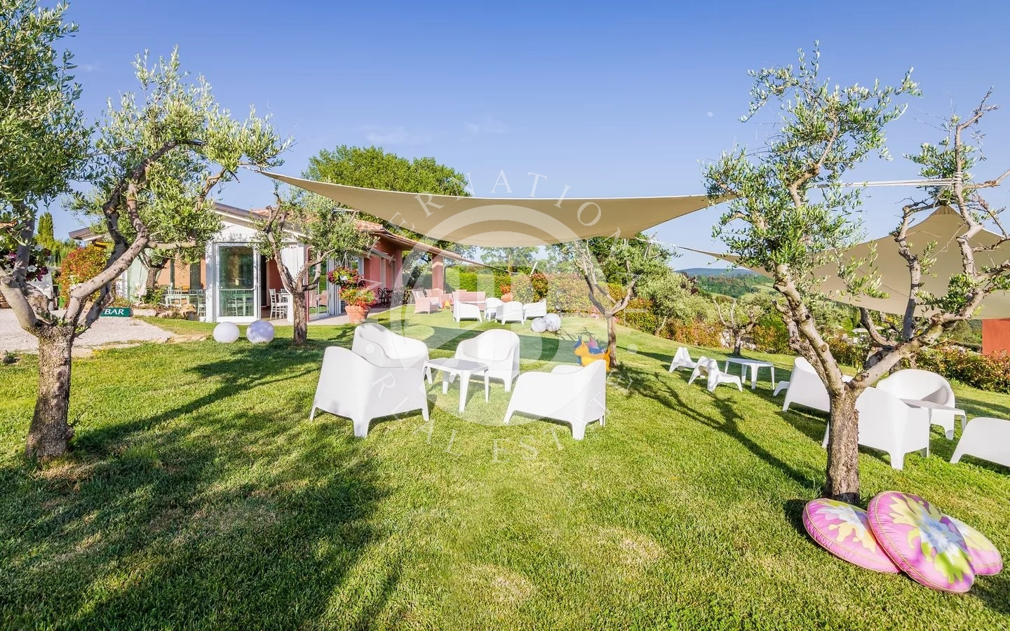 Sviluppato su due piani, i suoi interni sono così composti: ingresso su disimpegno che conduce al grande salone per pranzi ed eventi, al bagno per gli ospiti, alla cucina professionale e al pergolato affacciato sulla campagna e adibito a zona relax.
