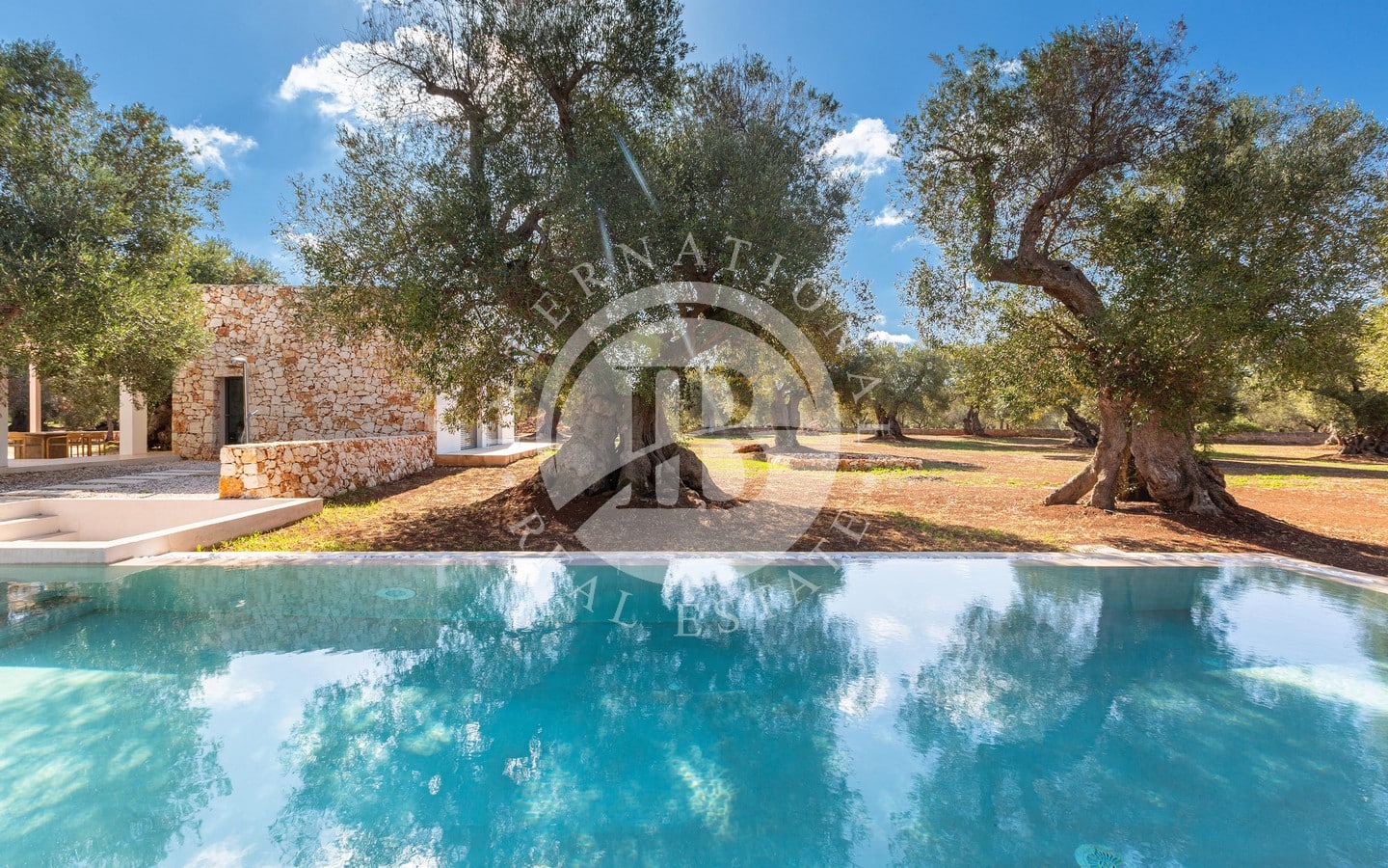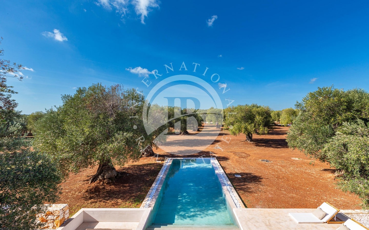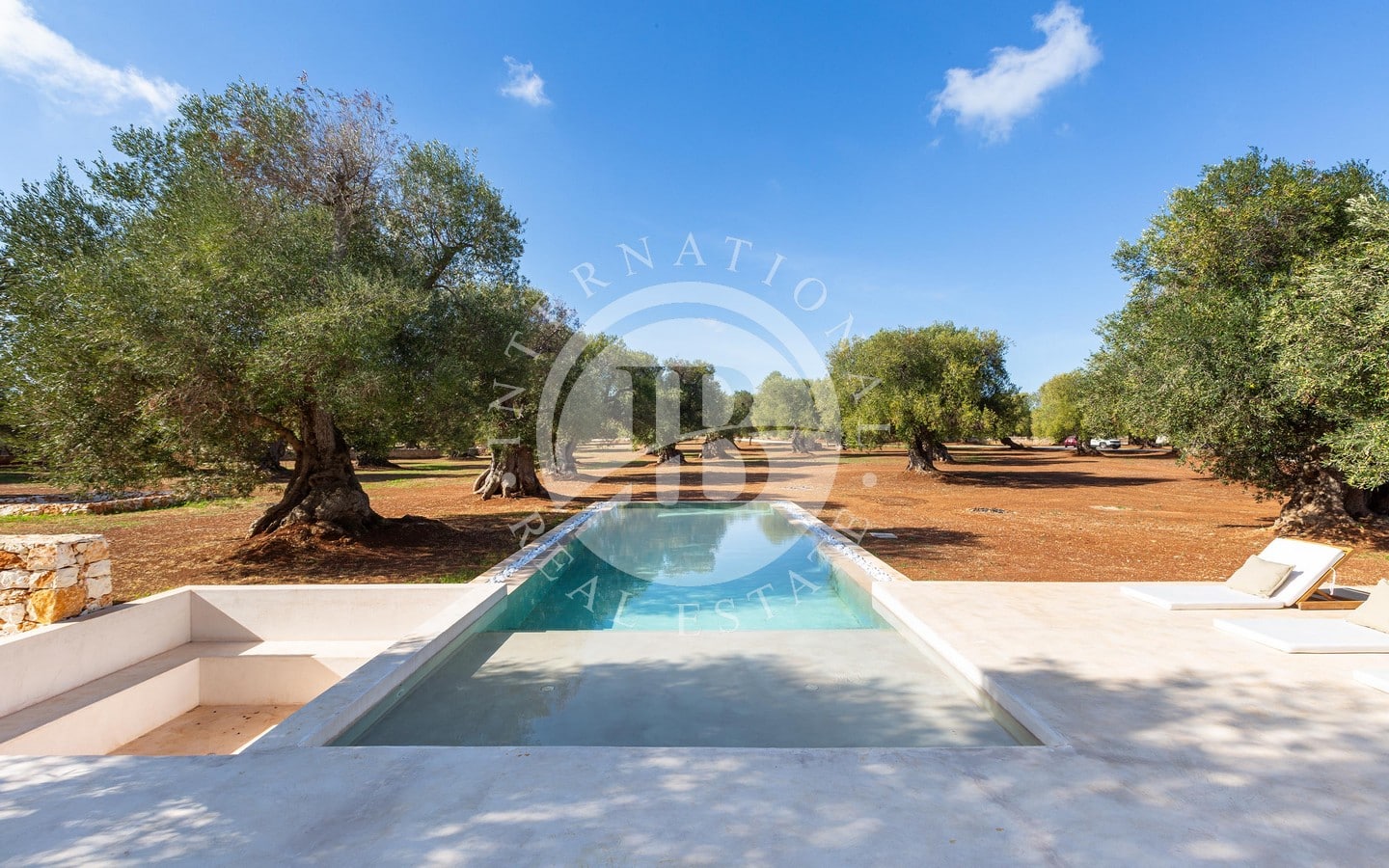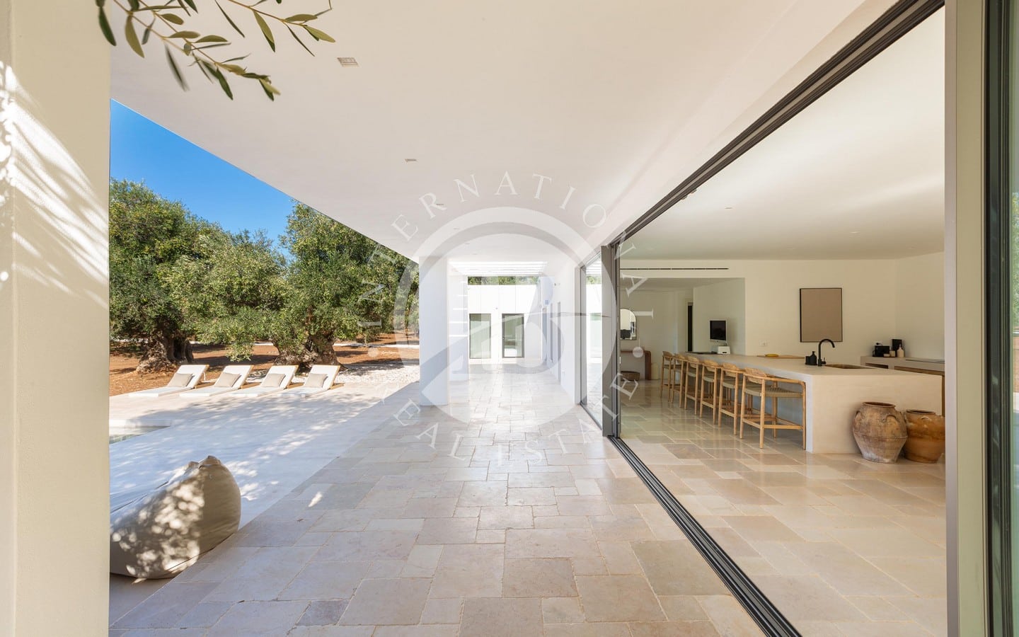 A ridosso della piscina, un’area solarium e un privè outdoor con sofà in pietra e braciere centrale offrono un angolo esclusivo per godere di momenti di relax in ogni stagione. Completano la proprietà una terrazza panoramica con vista sulla tenuta e sulla piana degli ulivi, un’area fitness immersa nel verde e raffinati spazi ombreggiati dedicati alla convivialità, tra cui un living esterno con cucina in muratura e un ampio tavolo.