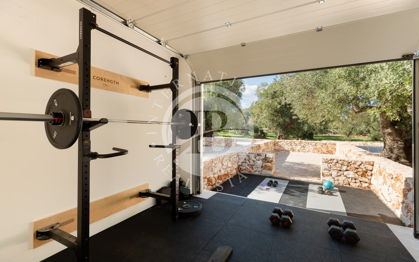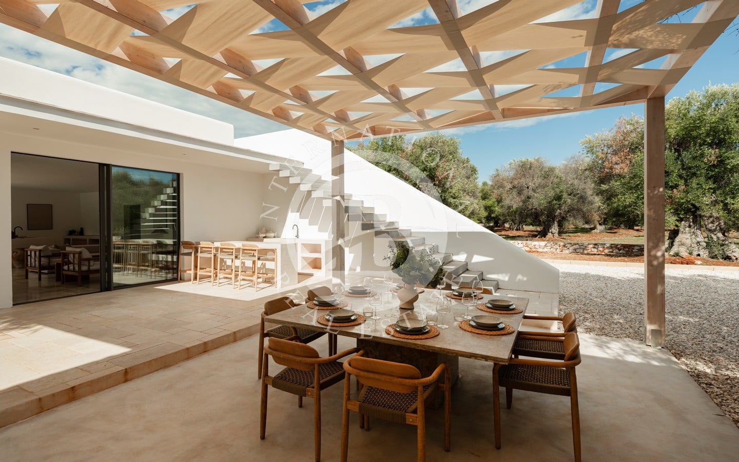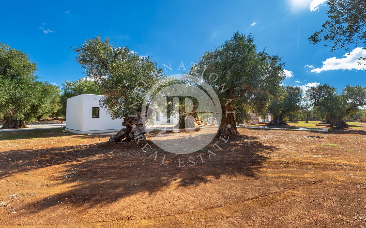 A ridosso della piscina, un’area solarium e un privè outdoor con sofà in pietra e braciere centrale offrono un angolo esclusivo per godere di momenti di relax in ogni stagione. Completano la proprietà una terrazza panoramica con vista sulla tenuta e sulla piana degli ulivi, un’area fitness immersa nel verde e raffinati spazi ombreggiati dedicati alla convivialità, tra cui un living esterno con cucina in muratura e un ampio tavolo.