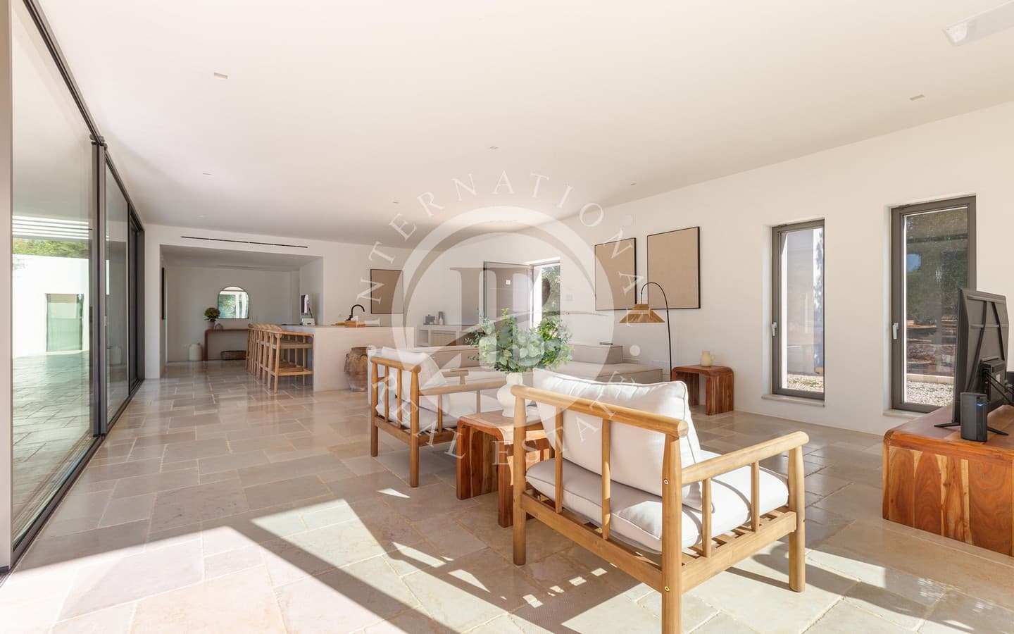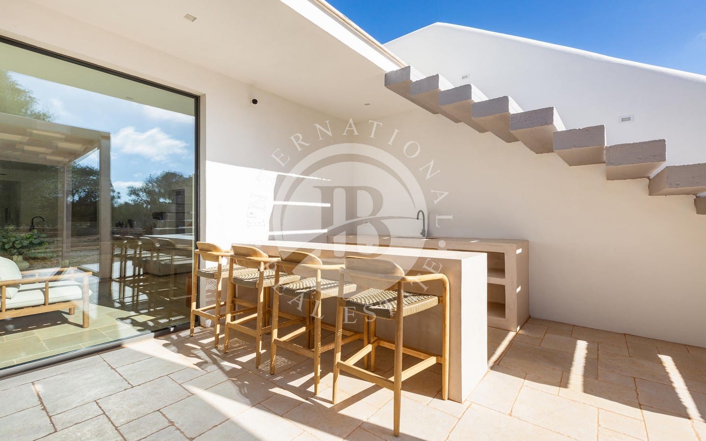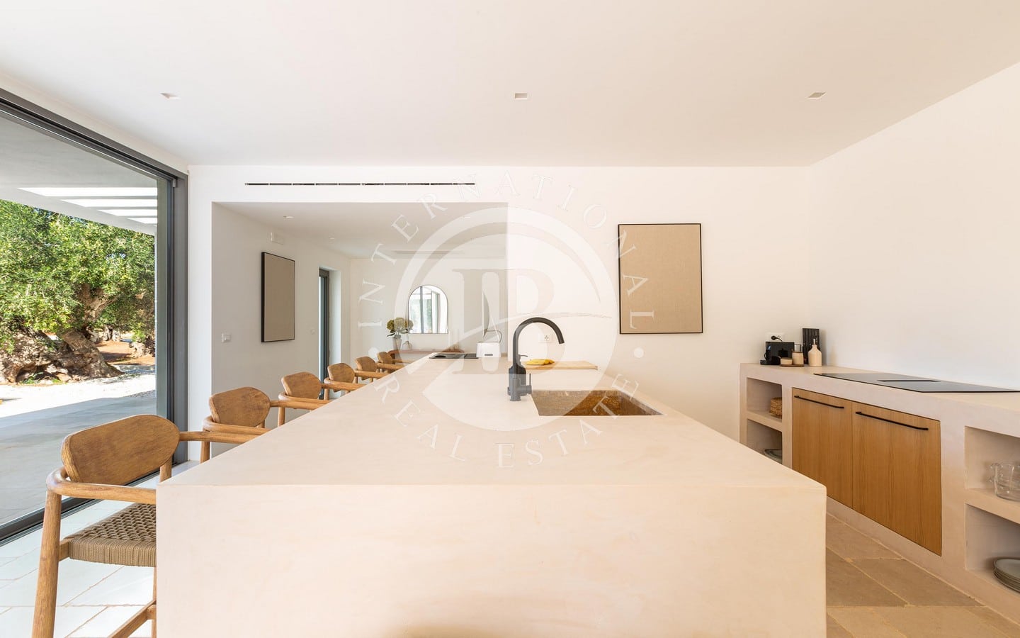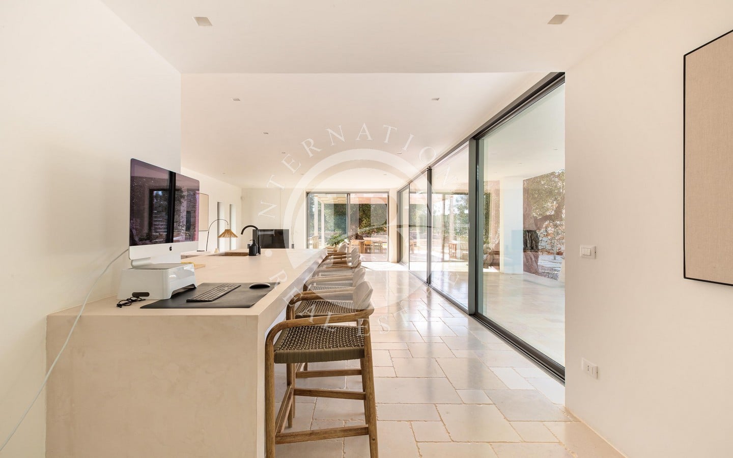 A ridosso della piscina, un’area solarium e un privè outdoor con sofà in pietra e braciere centrale offrono un angolo esclusivo per godere di momenti di relax in ogni stagione. Completano la proprietà una terrazza panoramica con vista sulla tenuta e sulla piana degli ulivi, un’area fitness immersa nel verde e raffinati spazi ombreggiati dedicati alla convivialità, tra cui un living esterno con cucina in muratura e un ampio tavolo.