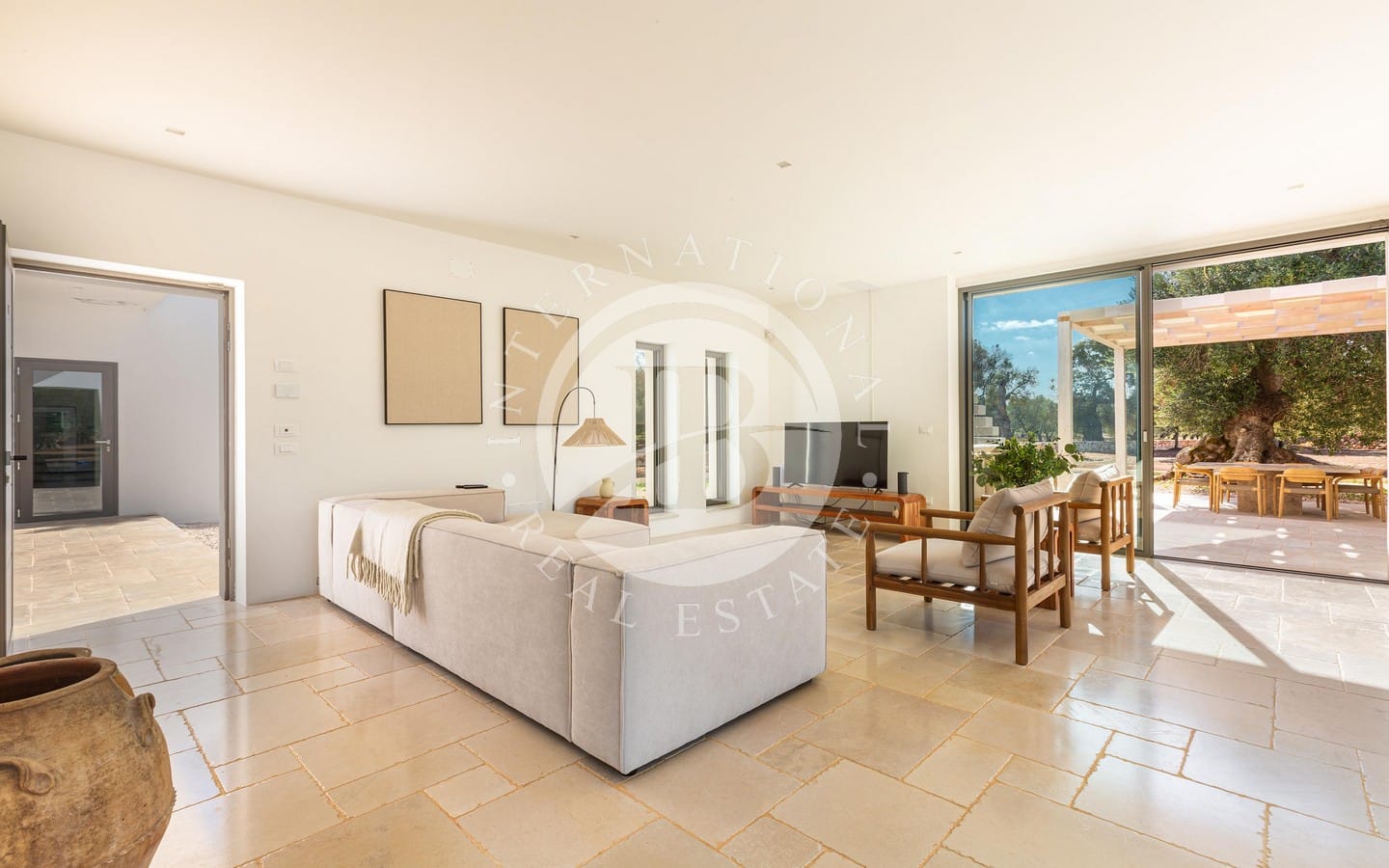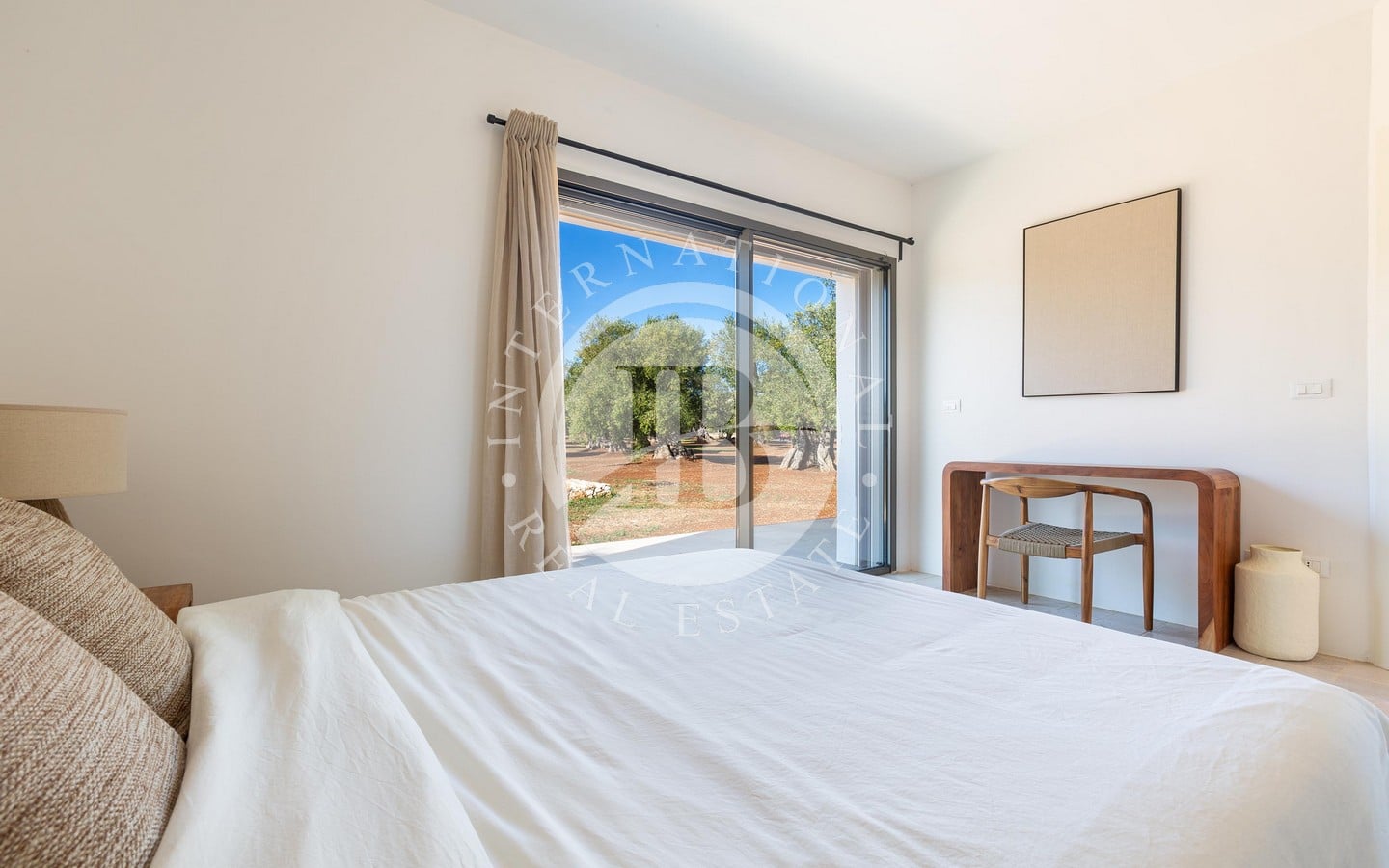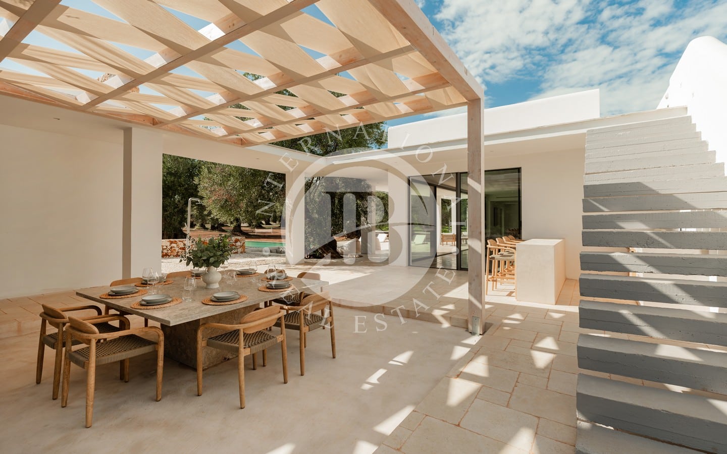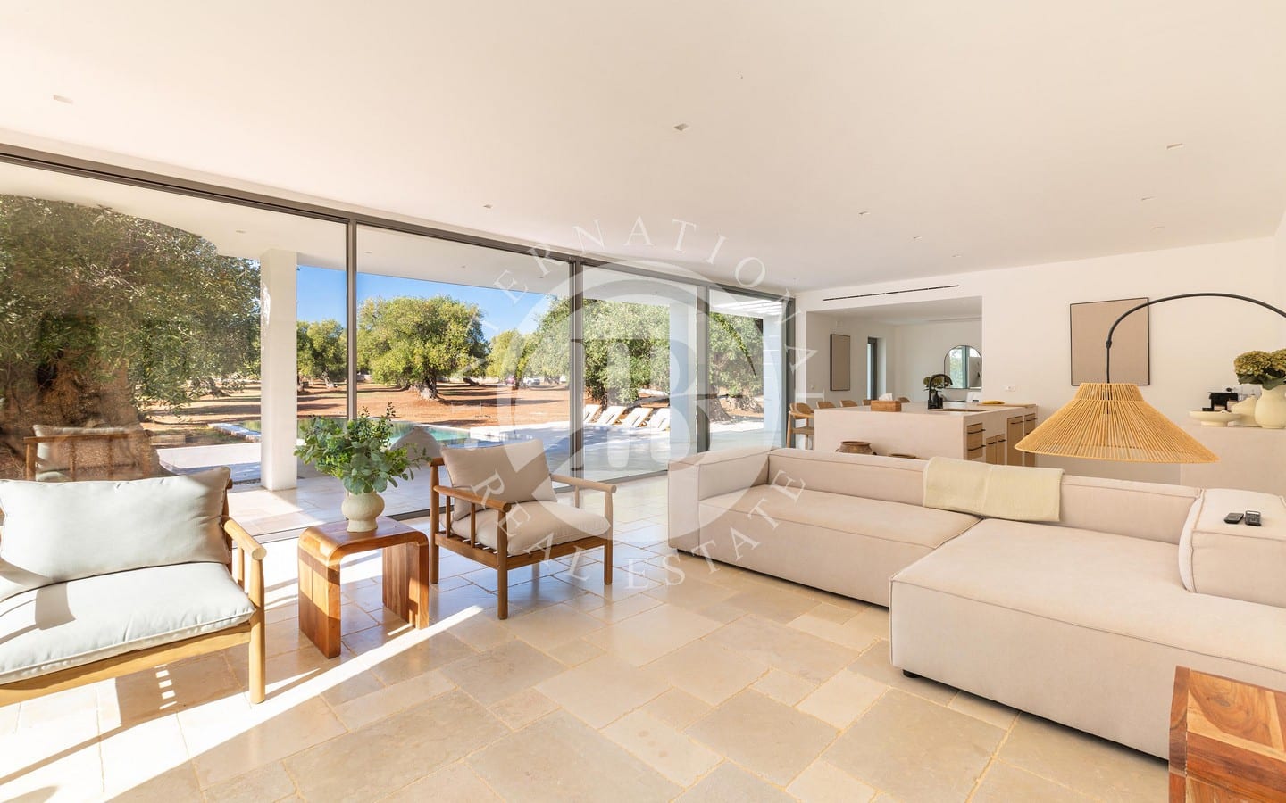 nte con il paesaggio circostante. Il luminoso living open space è arricchito da ampie vetrate scorrevoli che si affacciano sul giardino e sulla piscina, una cucina a isola in muratura e travertino, pavimenti in pietra di Trani levigata e mobili artigianali in legno. La zona notte comprende una camera padronale con bagno privato, impreziosita da arredi in vimini e legno.