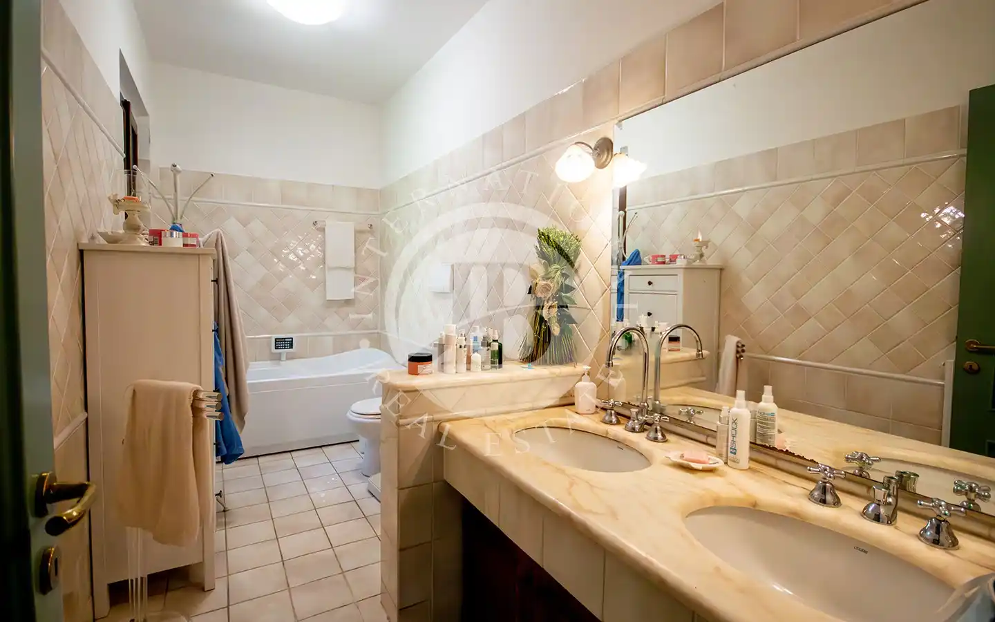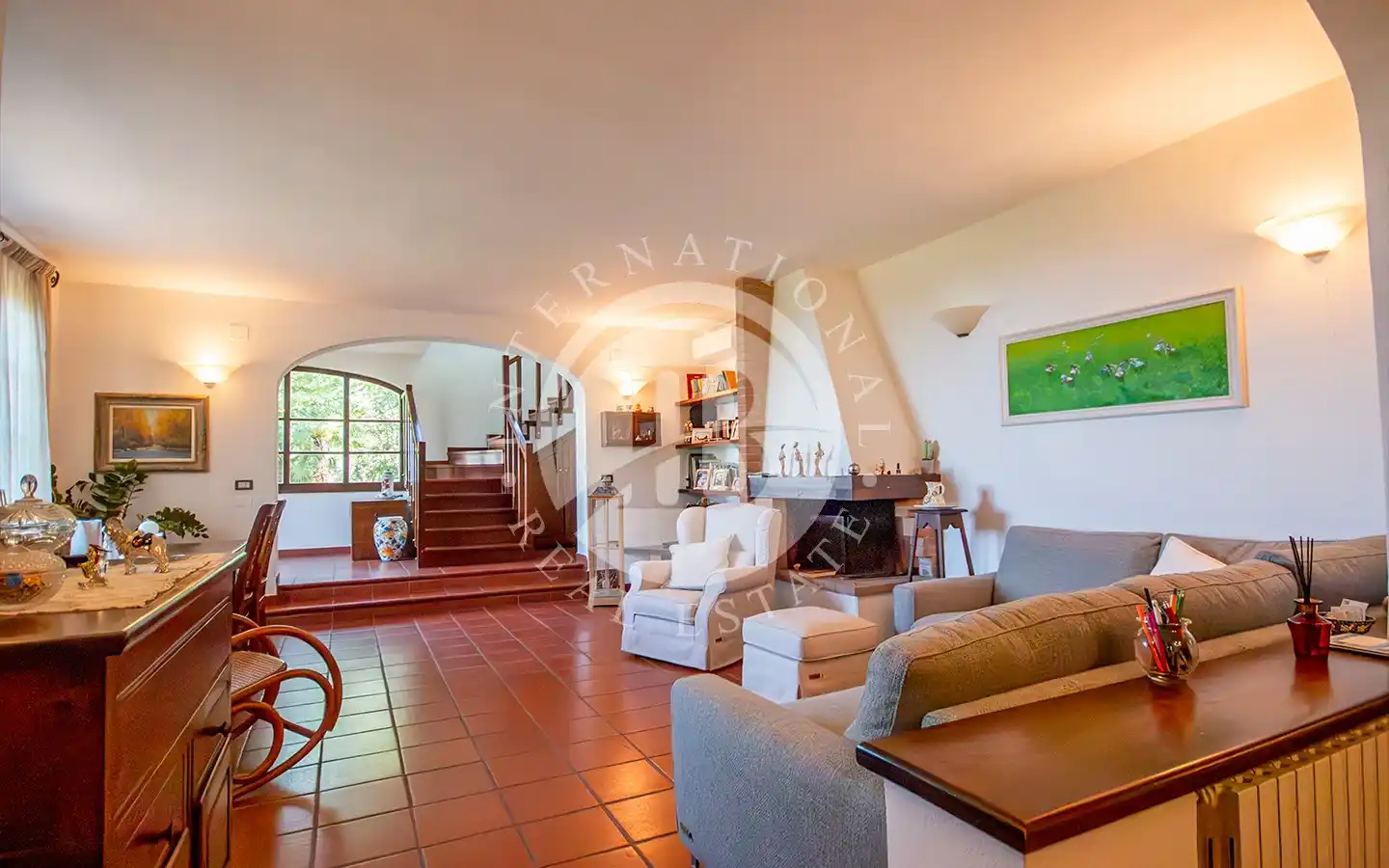 miche, pavimenti in cotto e cucina in stile classico. Al piano superiore si trovano tre camere da letto (due matrimoniali), un elegante bagno di ampie dimensioni, uno studio con vista mare e un ripostiglio.