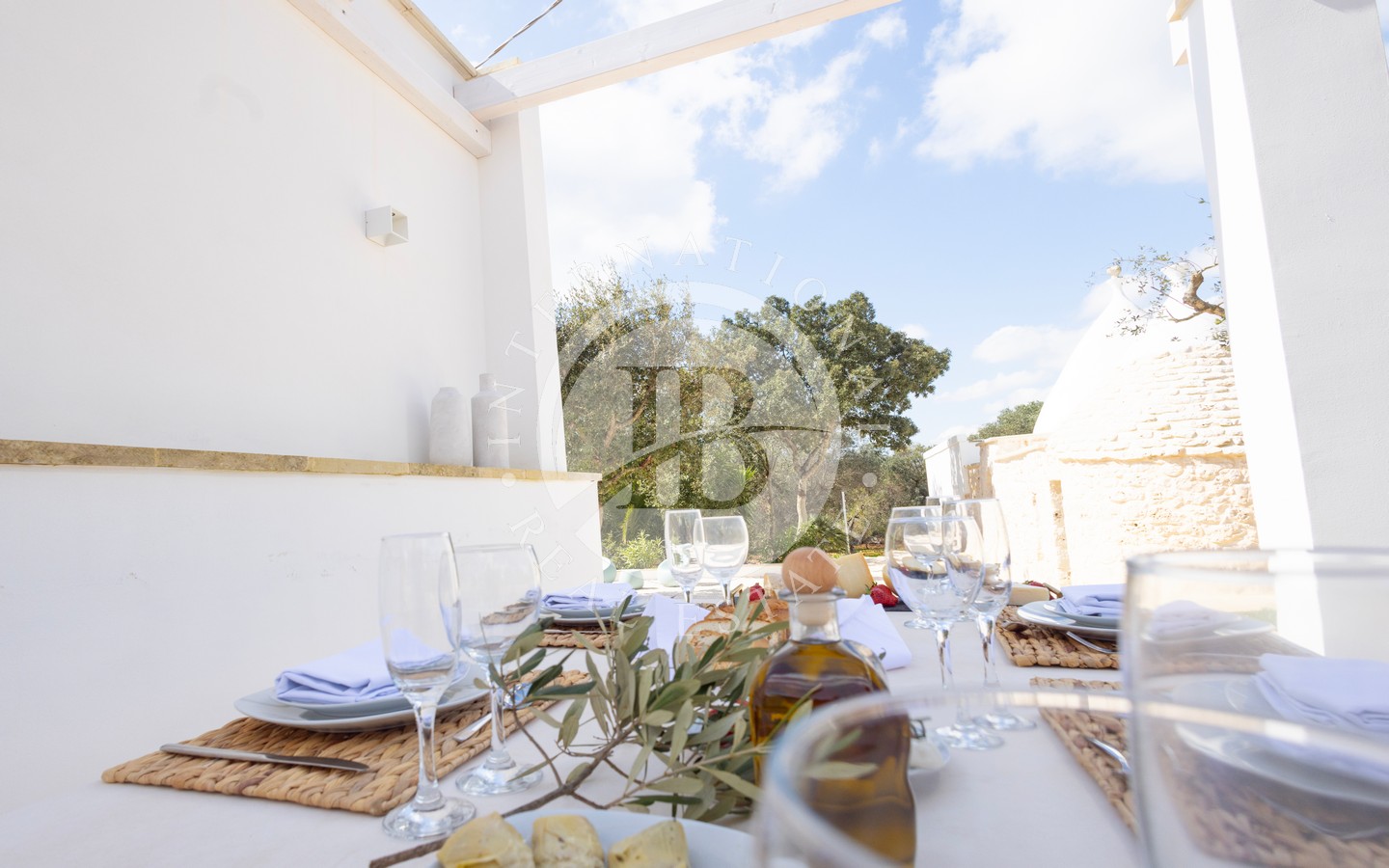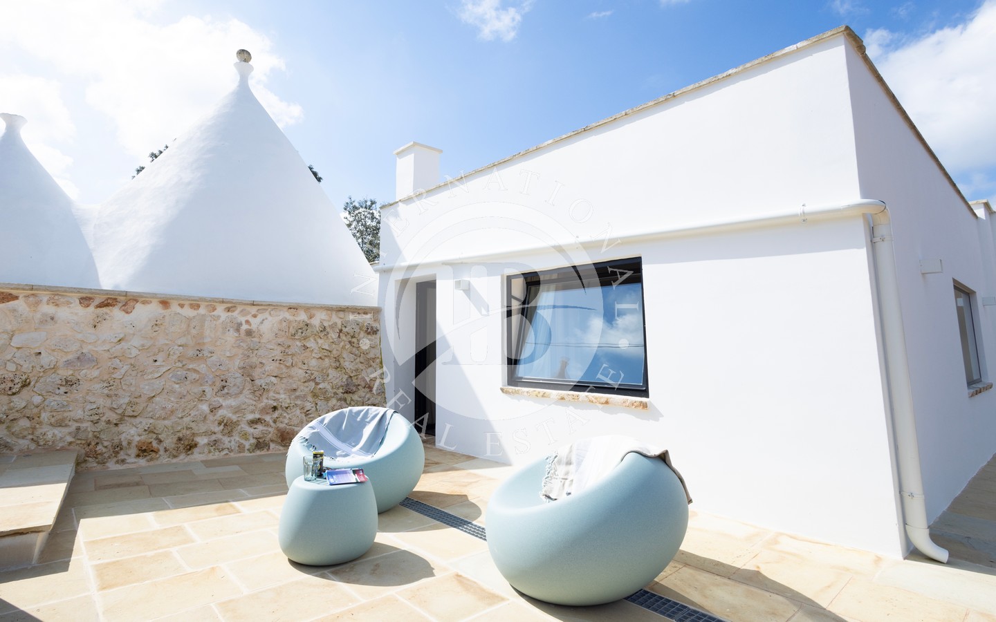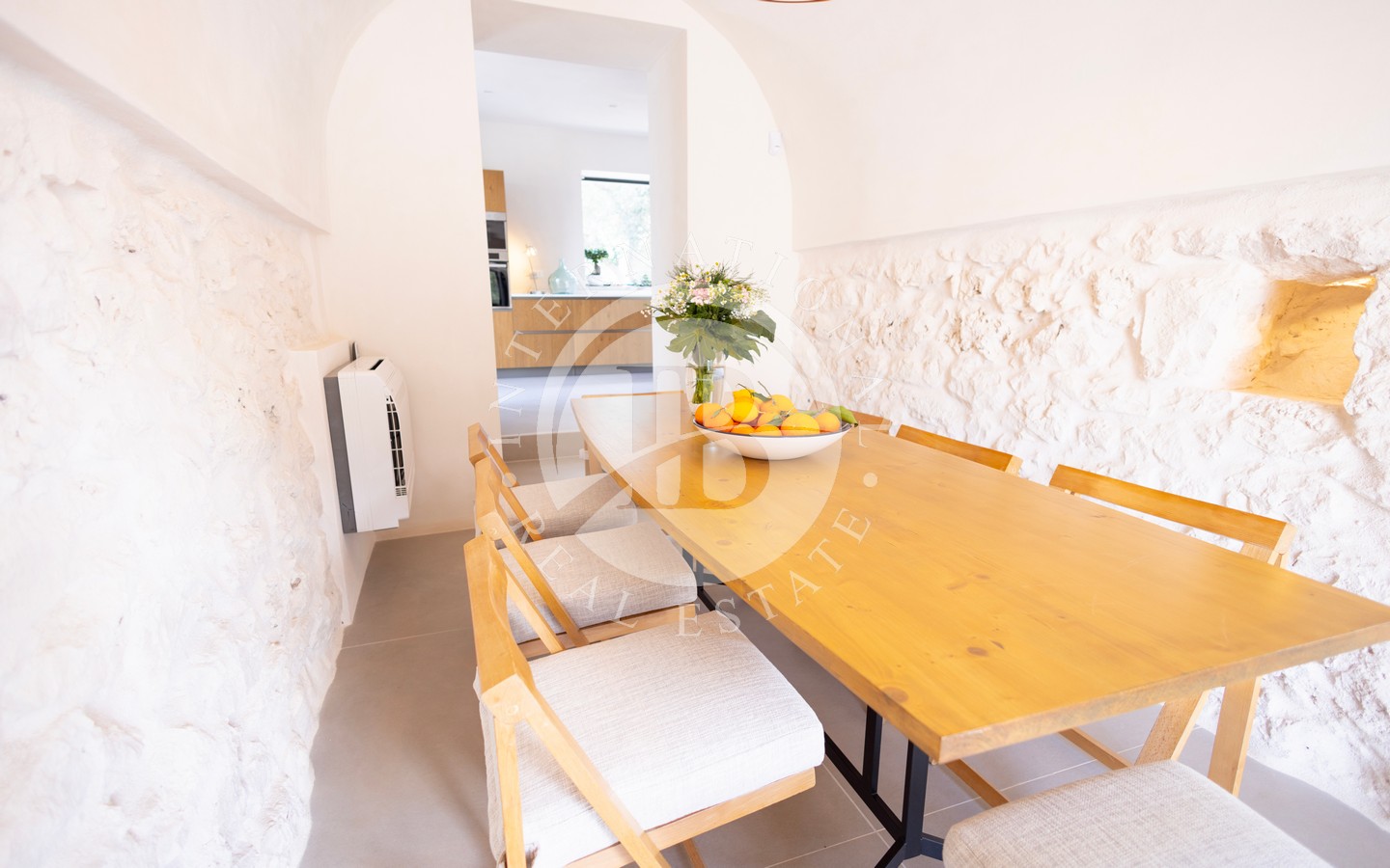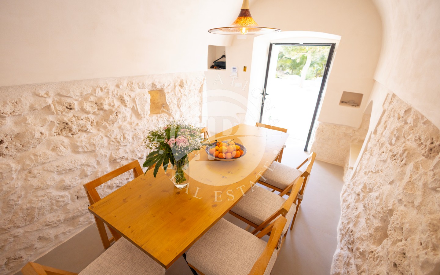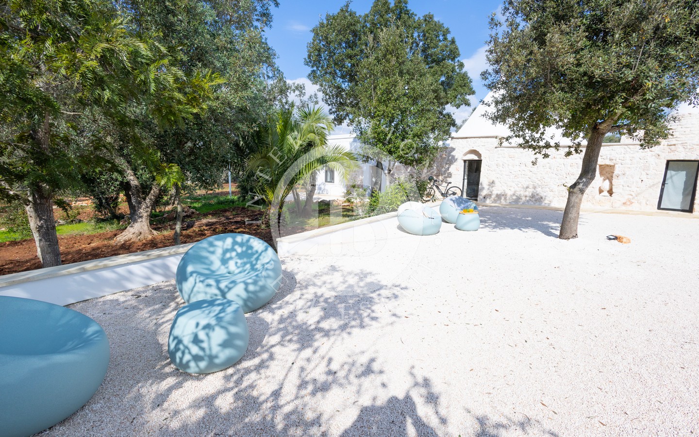 The large outdoor area is enriched by a ten-by-four metre swimming pool with a stone sunbathing area, immersed in the tranquillity of the olive trees, and a practical outdoor laundry room. A small trullo, restored and left in its authentic simplicity, is now used as a wood-burning oven, adding further charm to the property.