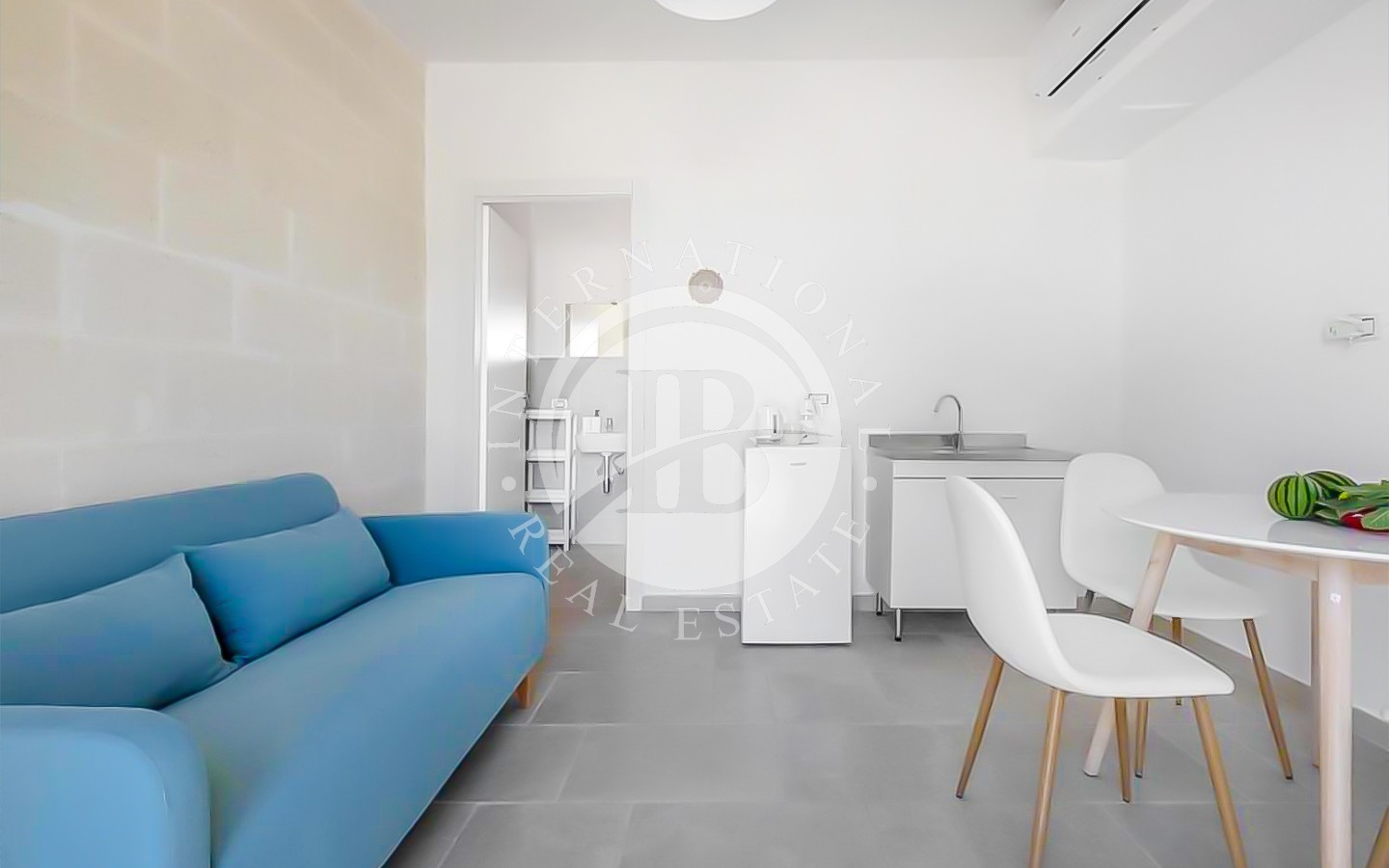 soggiorno con divano letto, angolo cottura, biancheria in cotone egiziano e stoviglie.