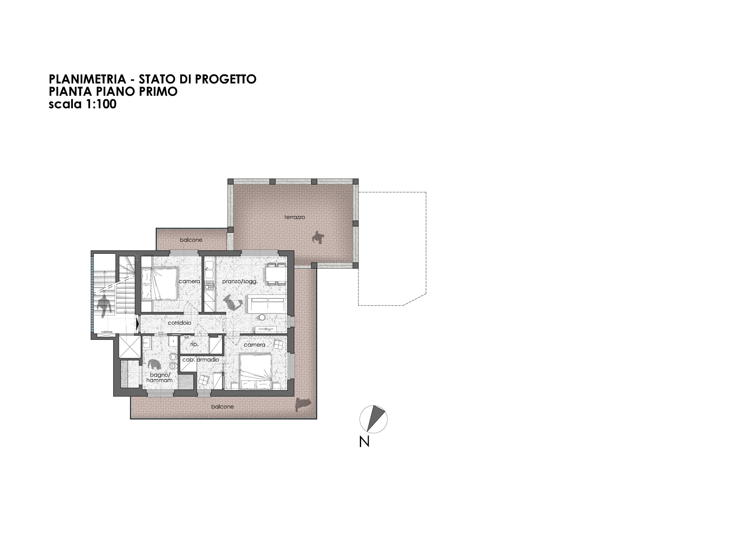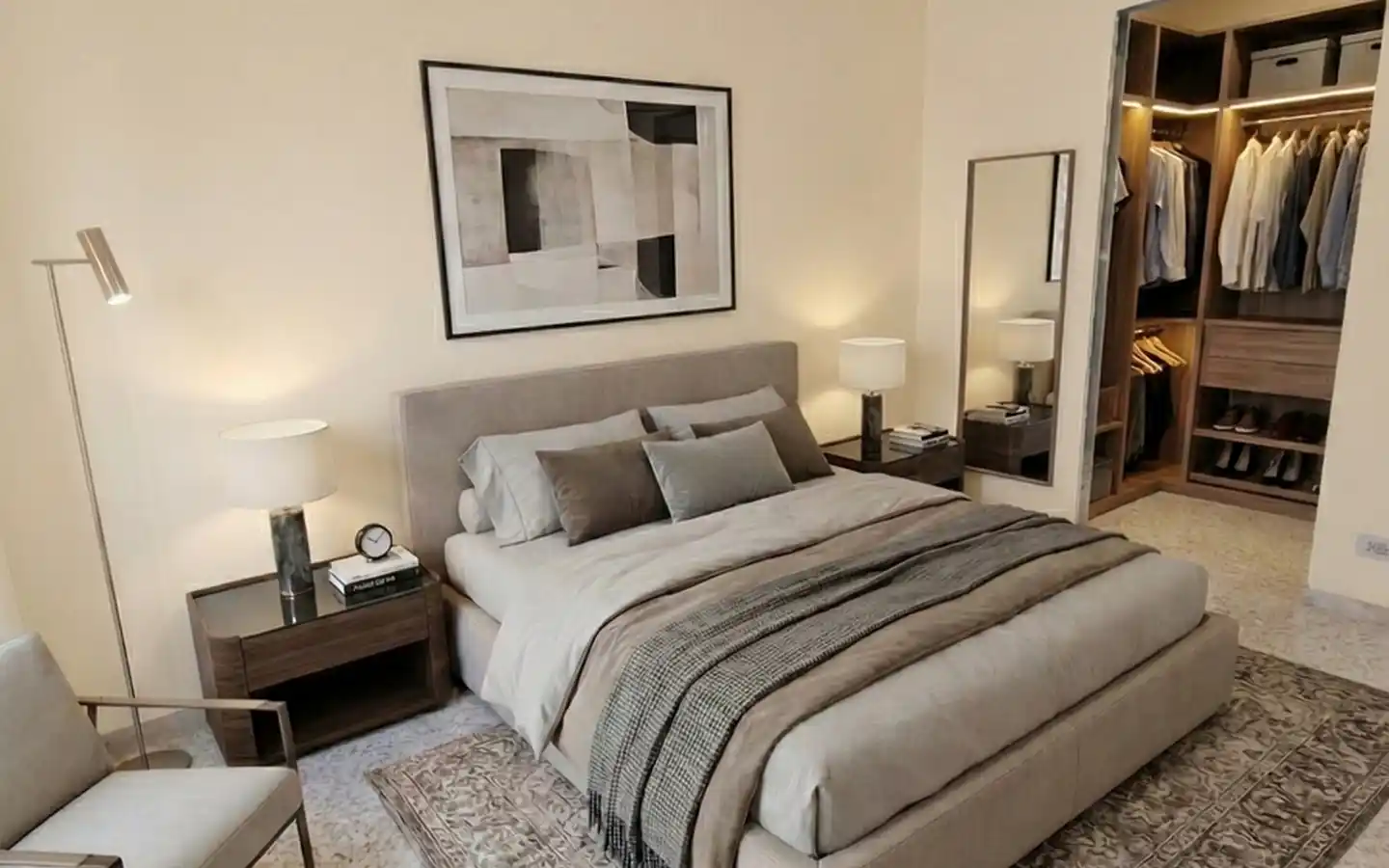 Il se compose d'un espace de vie avec kitchenette, de deux chambres dont une avec dressing privé, d'une salle de bains avec hammam et d'une grande pièce de rangement.
