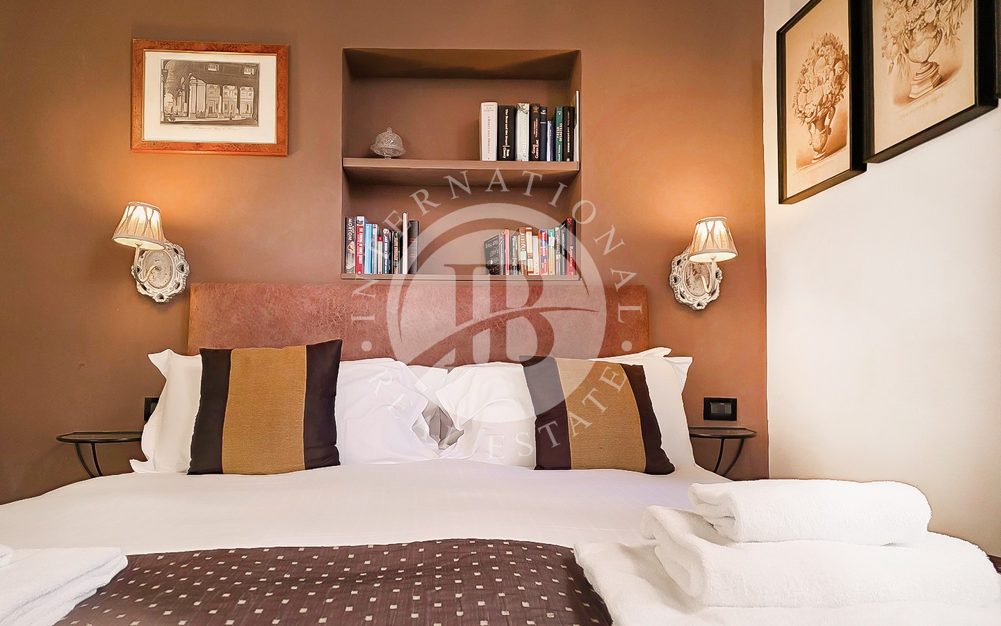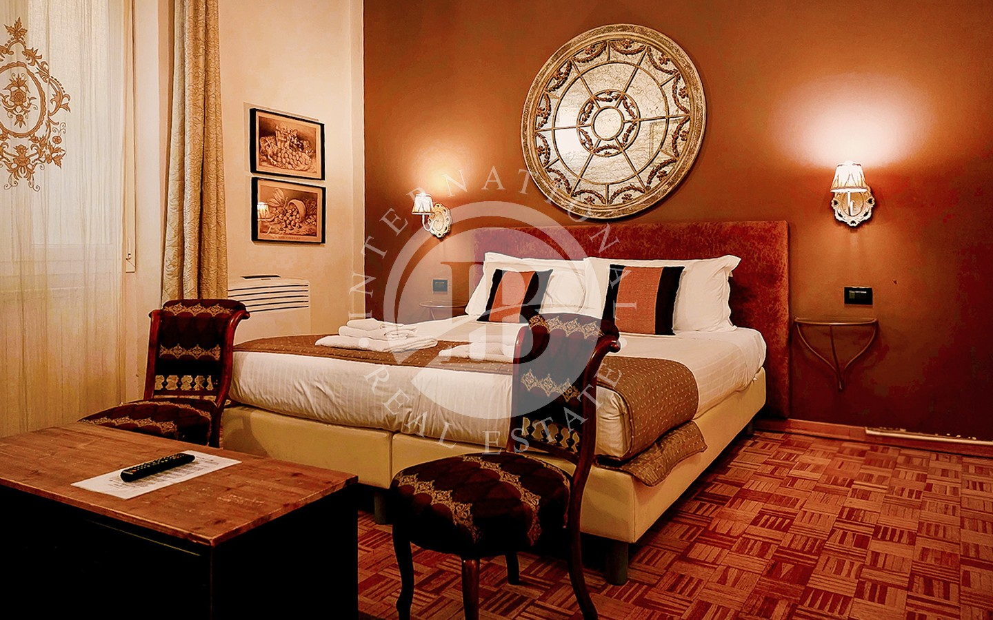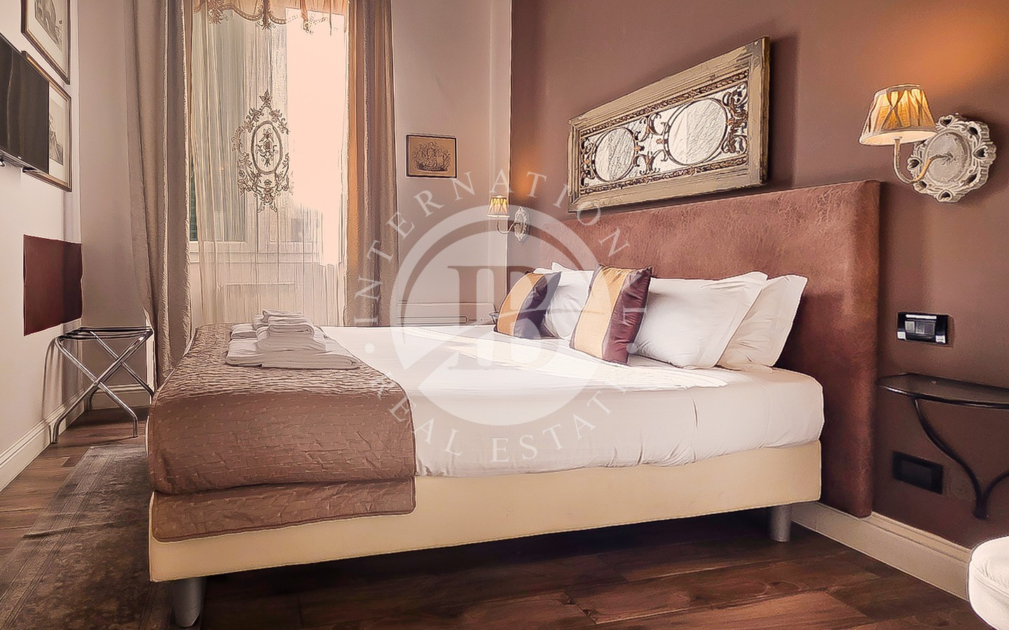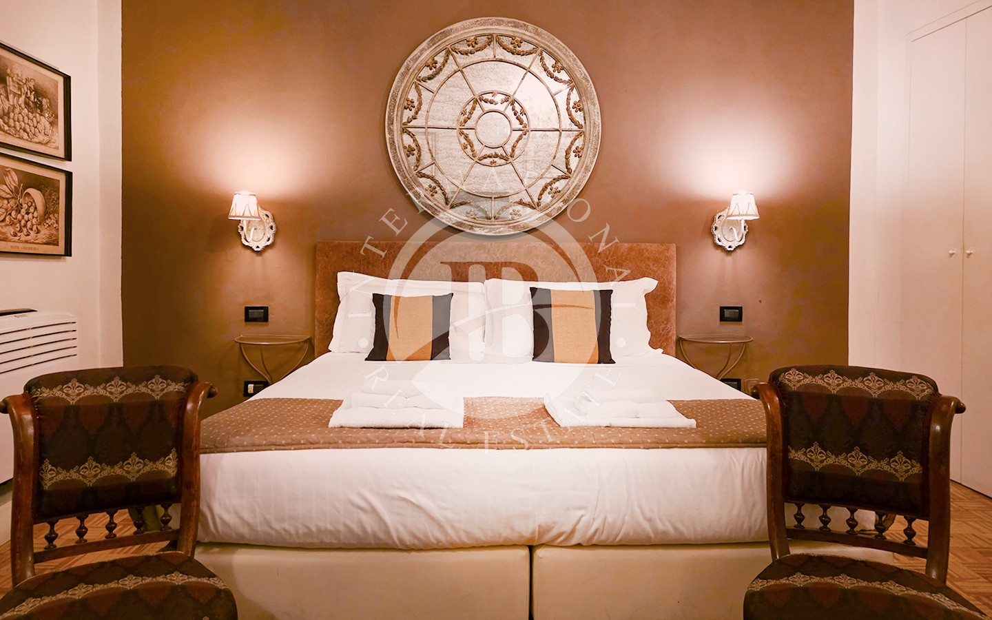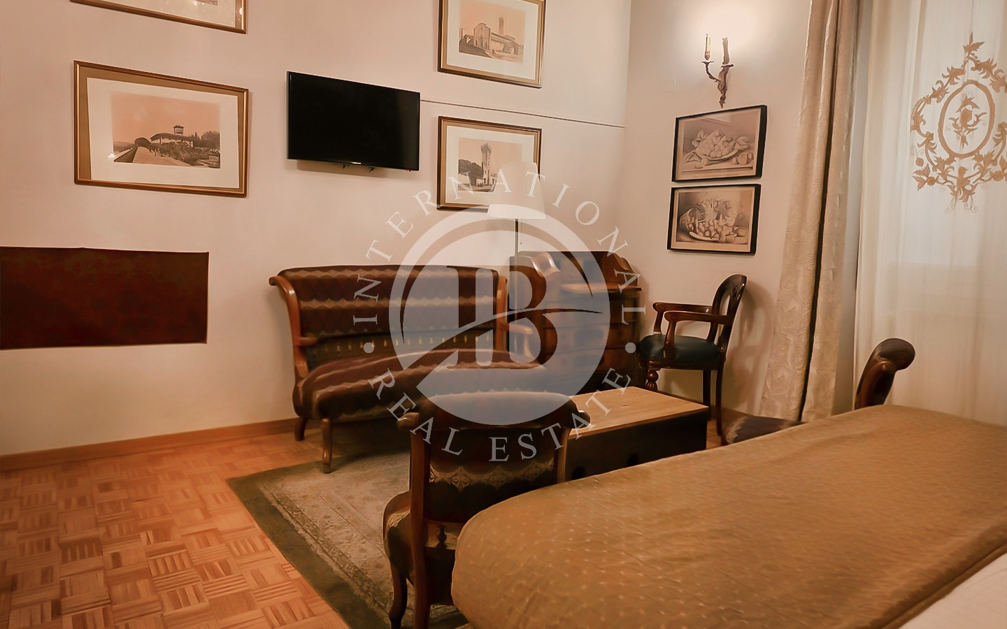 Les intérieurs se distinguent par leur élégance intemporelle, rehaussée par des plafonds à caissons en bois d'origine et des antiquités soigneusement sélectionnées. L'appartement comprend six chambres, chacune avec salle de bains privée, télévision, minibar et coffre-fort, conçues pour garantir un maximum de confort et d'intimité.