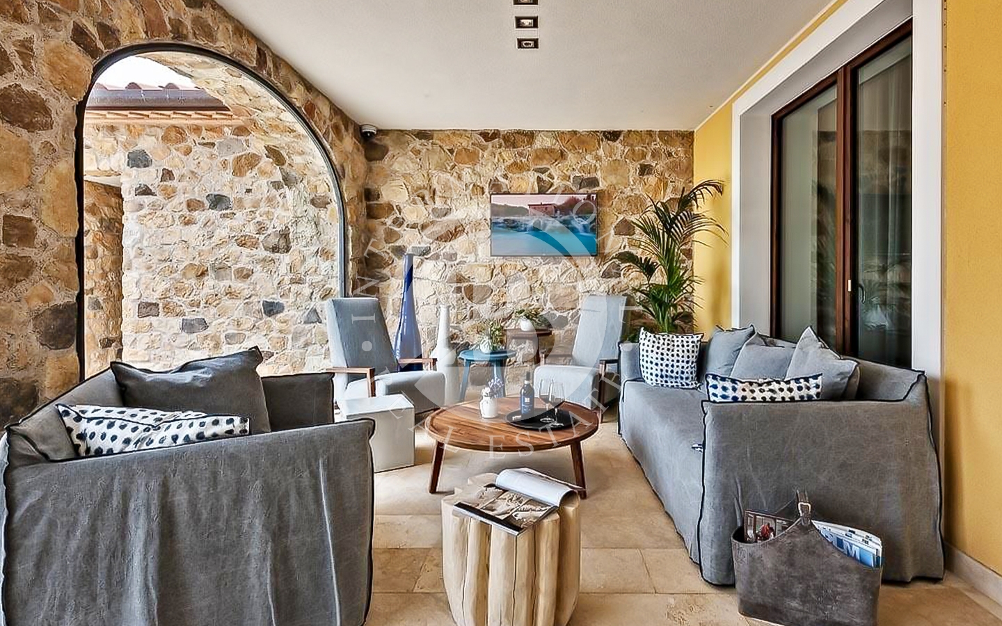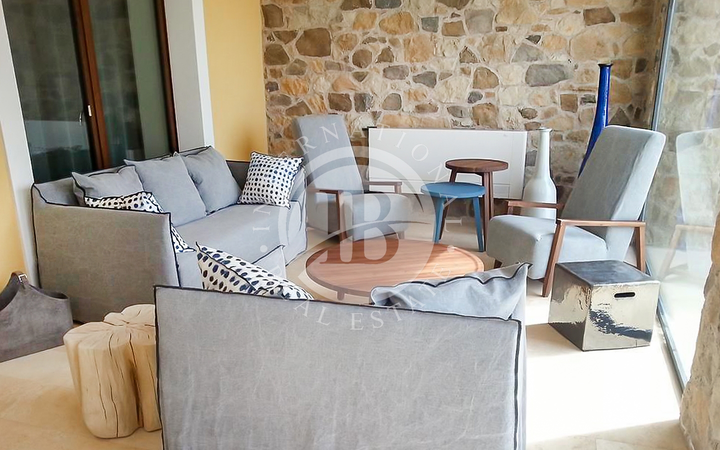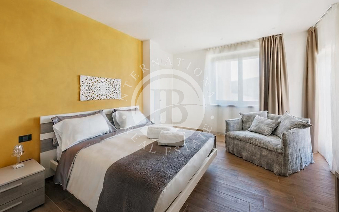 ompleto d’aria e vista panoramica sul Giglio. L’ accogliente salone in veranda si affaccia sulla piscina. Dal piazzale in travertino si accede a due suite indipendenti con bagno. Al primo piano, raggiungibile da una comoda scala o da ascensore-montacarichi, sono presenti due lussuosi e ampi appartamenti.