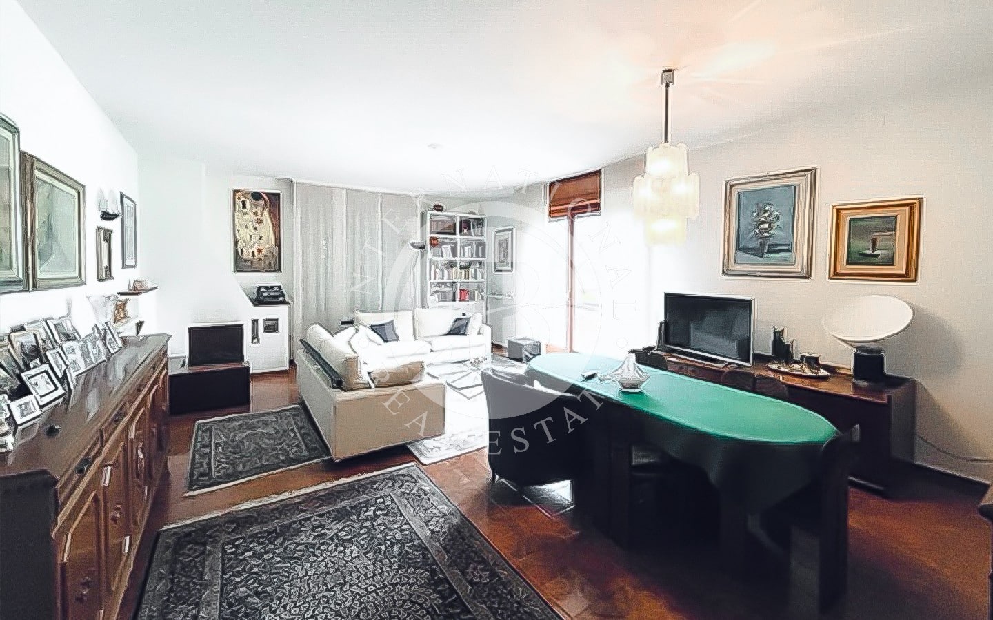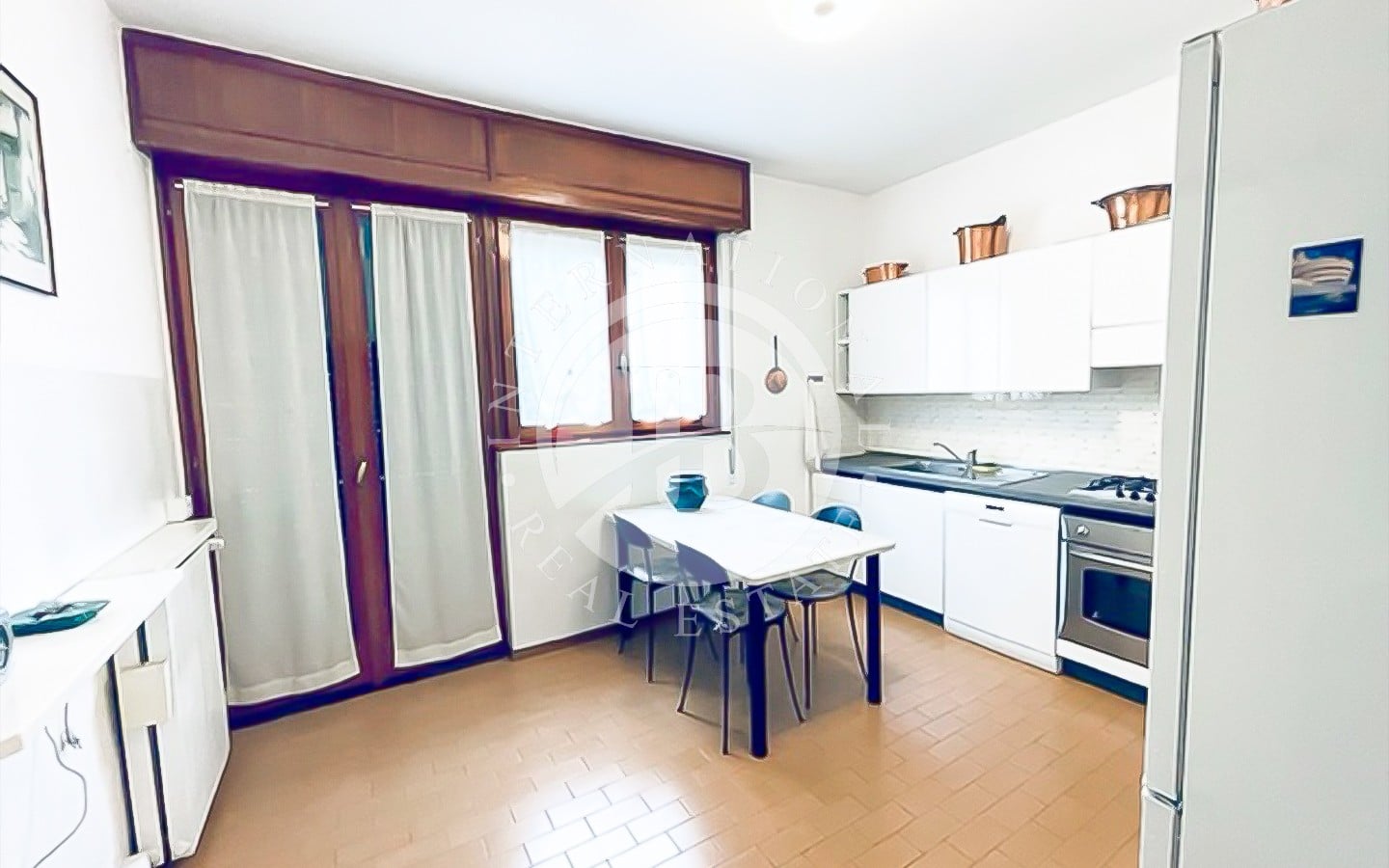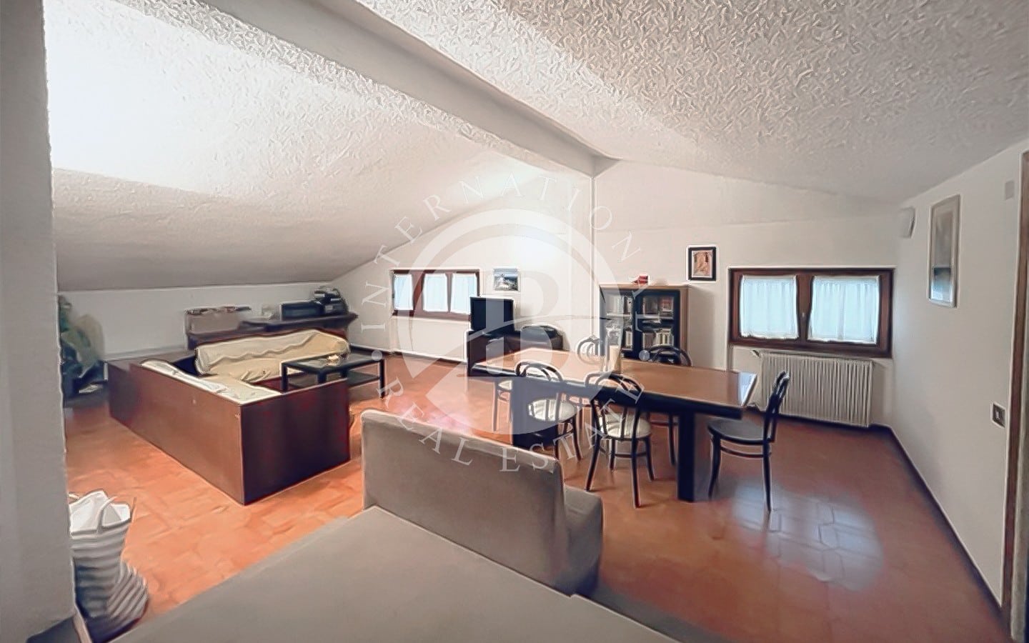 cala interna che collega i piani superiori. Al primo piano, un ampio disimpegno conduce a un soggiorno panoramico con balcone, una cucina, un ripostiglio, due camere matrimoniali e un bagno. Il piano mansardato offre un cucinotto, un soggiorno, una camera, una cameretta, un ripostiglio, un disimpegno e un bagno.