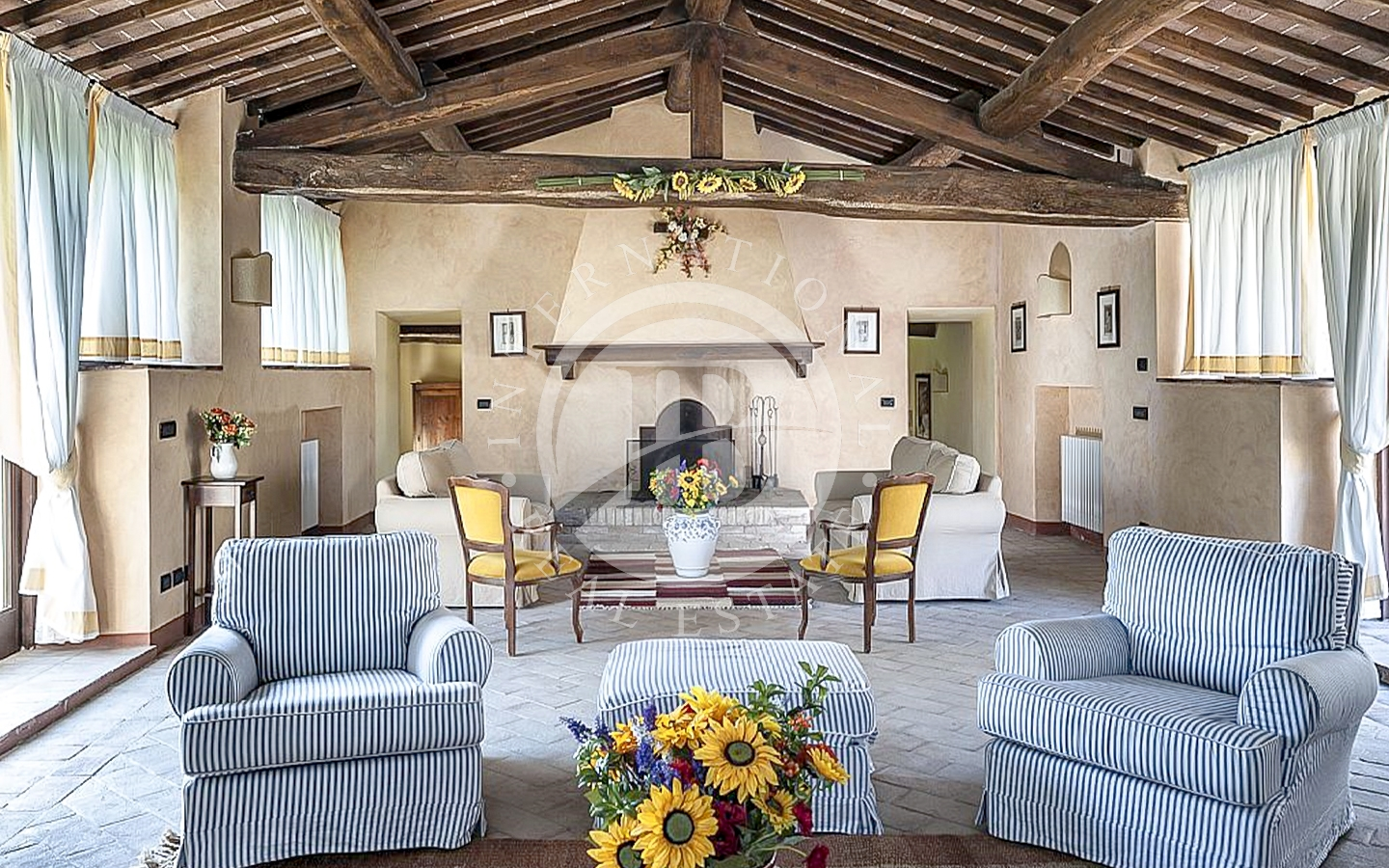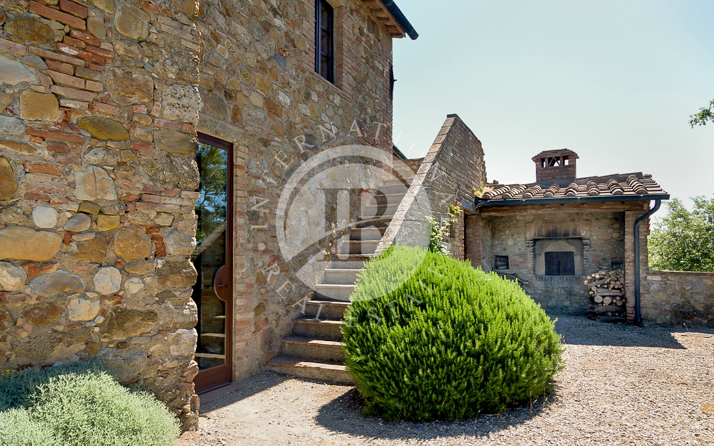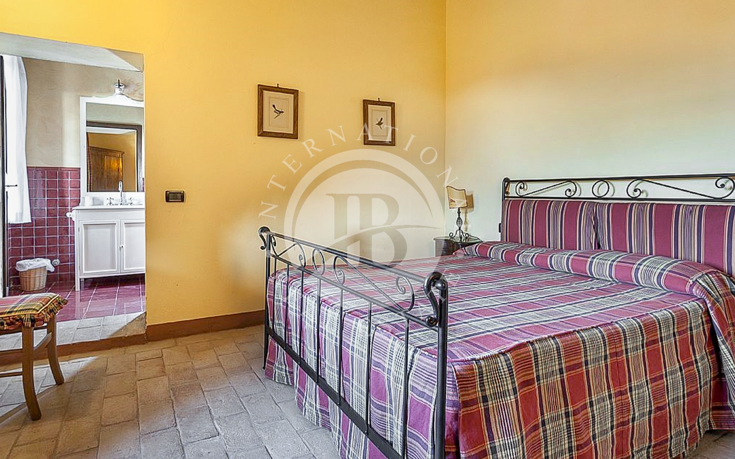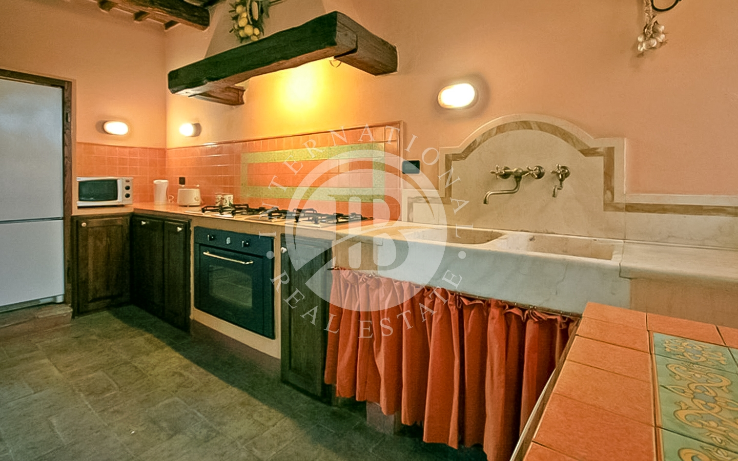 Accanto al corpo principale, la dependance di circa 290 mq rappresenta un’abitazione autonoma e accogliente, con soggiorno con camino, cucina, due camere matrimoniali con bagno privato e spazi esterni esclusivi. Gli interni, caratterizzati da travi in legno a vista, pavimenti in cotto e pietra naturale, sono stati ristrutturati con estrema cura, mantenendo intatto il fascino rurale toscano e arricchiti da arredi di antiquariato locale.