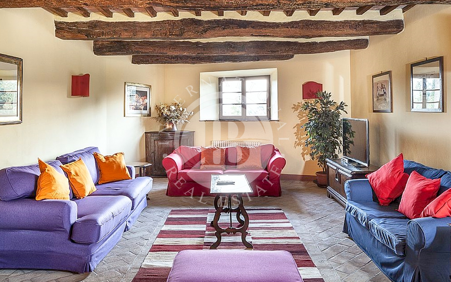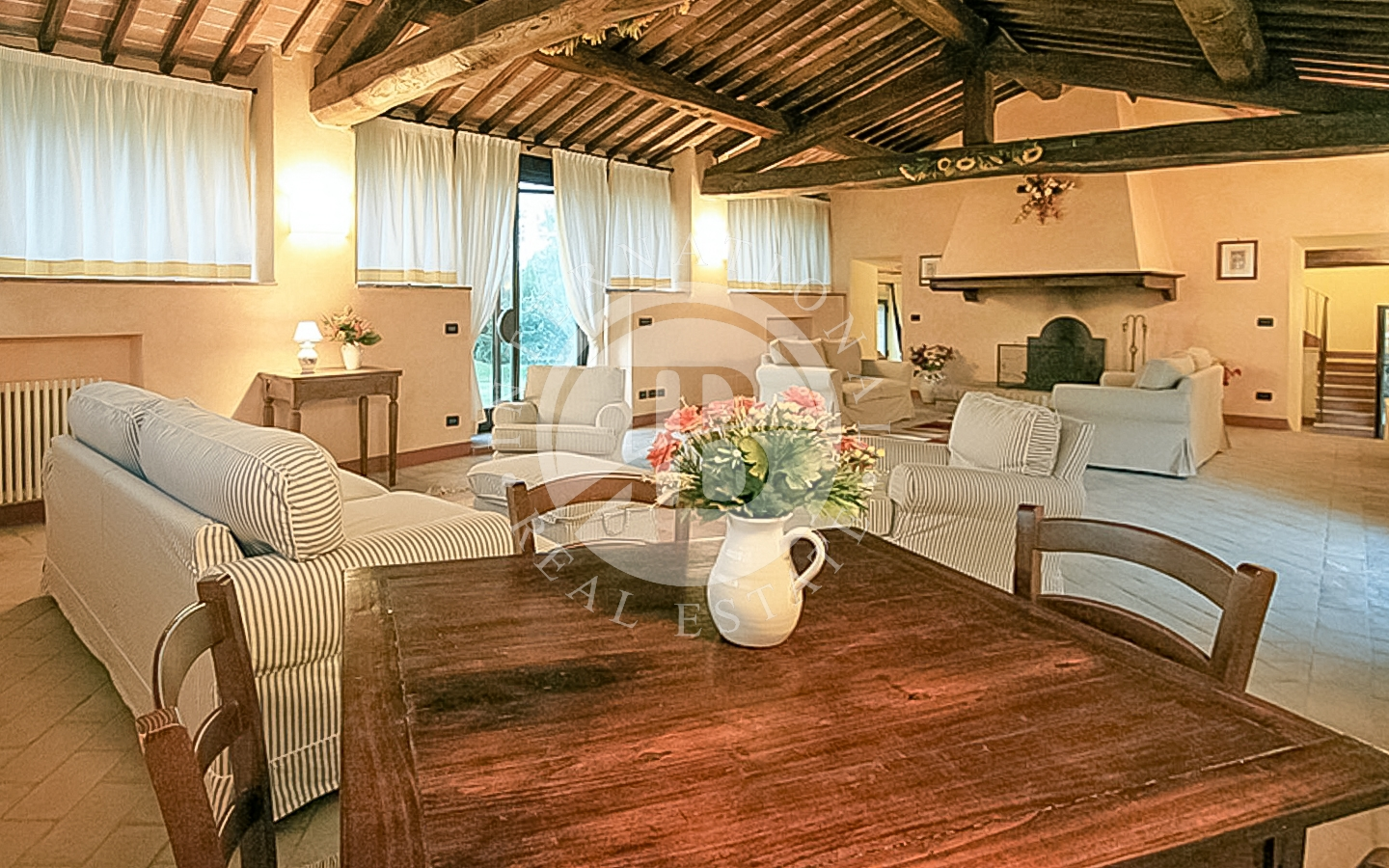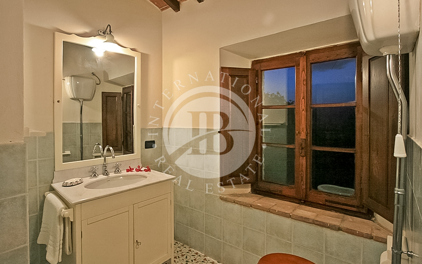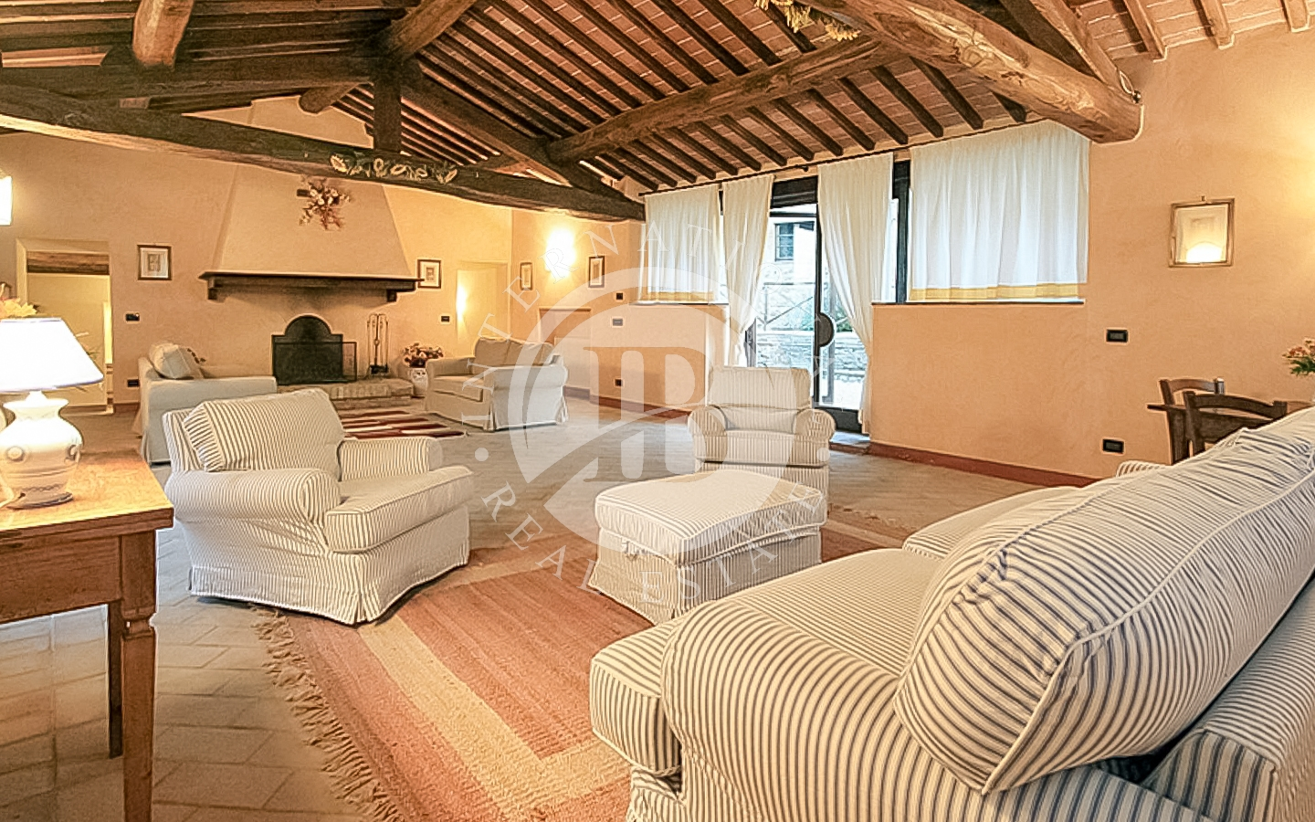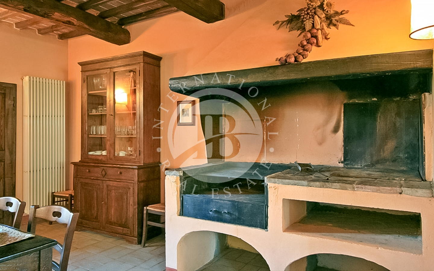 Accanto al corpo principale, la dependance di circa 290 mq rappresenta un’abitazione autonoma e accogliente, con soggiorno con camino, cucina, due camere matrimoniali con bagno privato e spazi esterni esclusivi. Gli interni, caratterizzati da travi in legno a vista, pavimenti in cotto e pietra naturale, sono stati ristrutturati con estrema cura, mantenendo intatto il fascino rurale toscano e arricchiti da arredi di antiquariato locale.