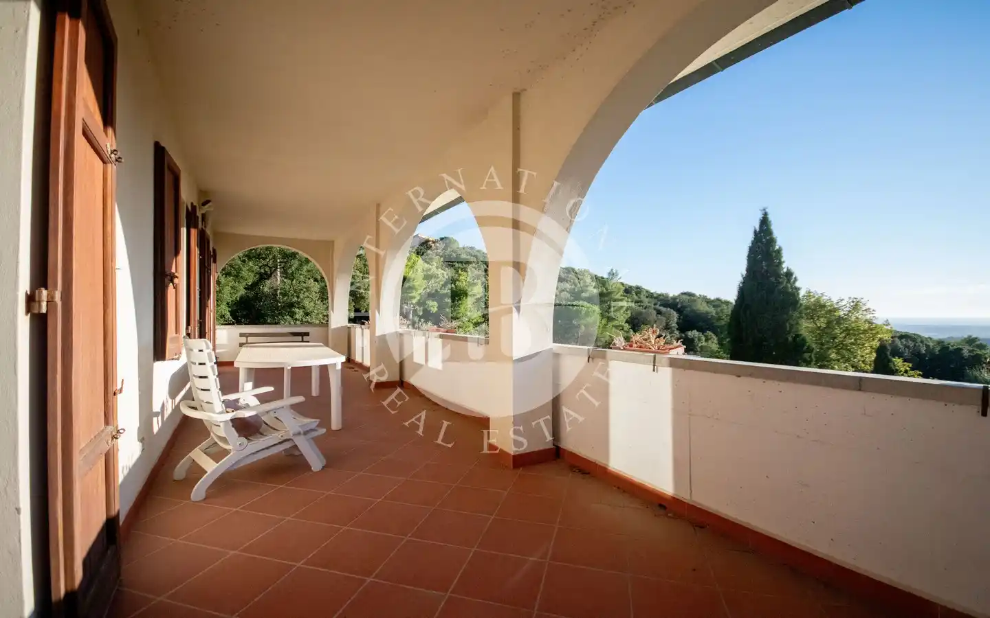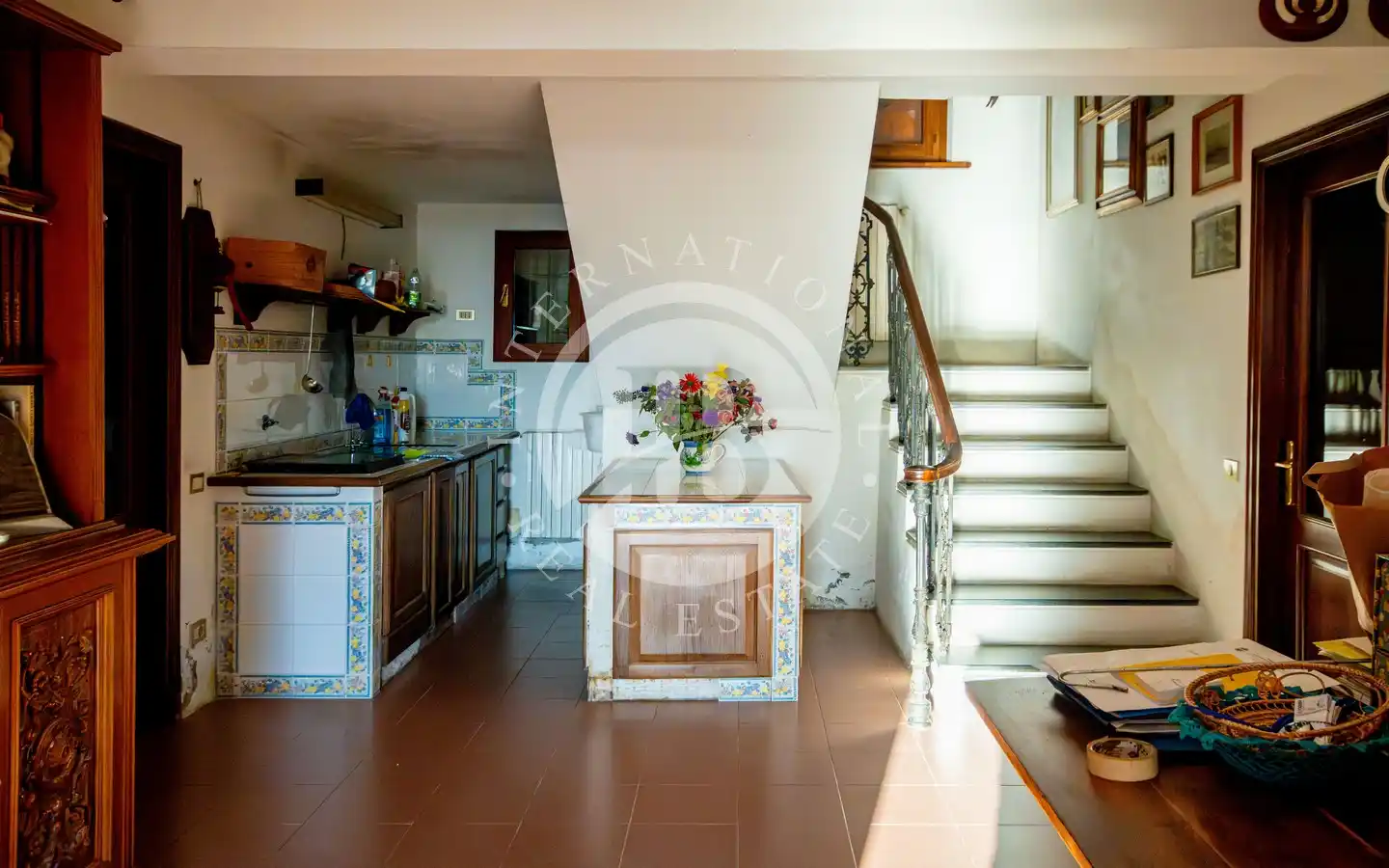o terra si trovano un salone di rappresentanza con accesso diretto a una terrazza di 30 mq con vista mare, una cucina abitabile con terrazza di 25 mq, uno studio, disimpegno e bagno. Il piano primo ospita quattro camere matrimoniali e due bagni, mentre il piano sottotetto comprende tre vani con bagno, attualmente organizzati in due camere e uno studio con vista panoramica.