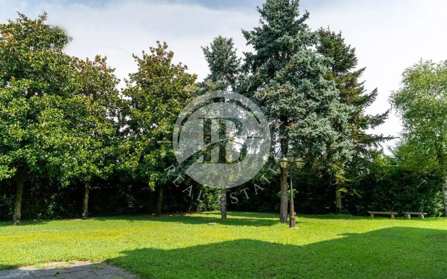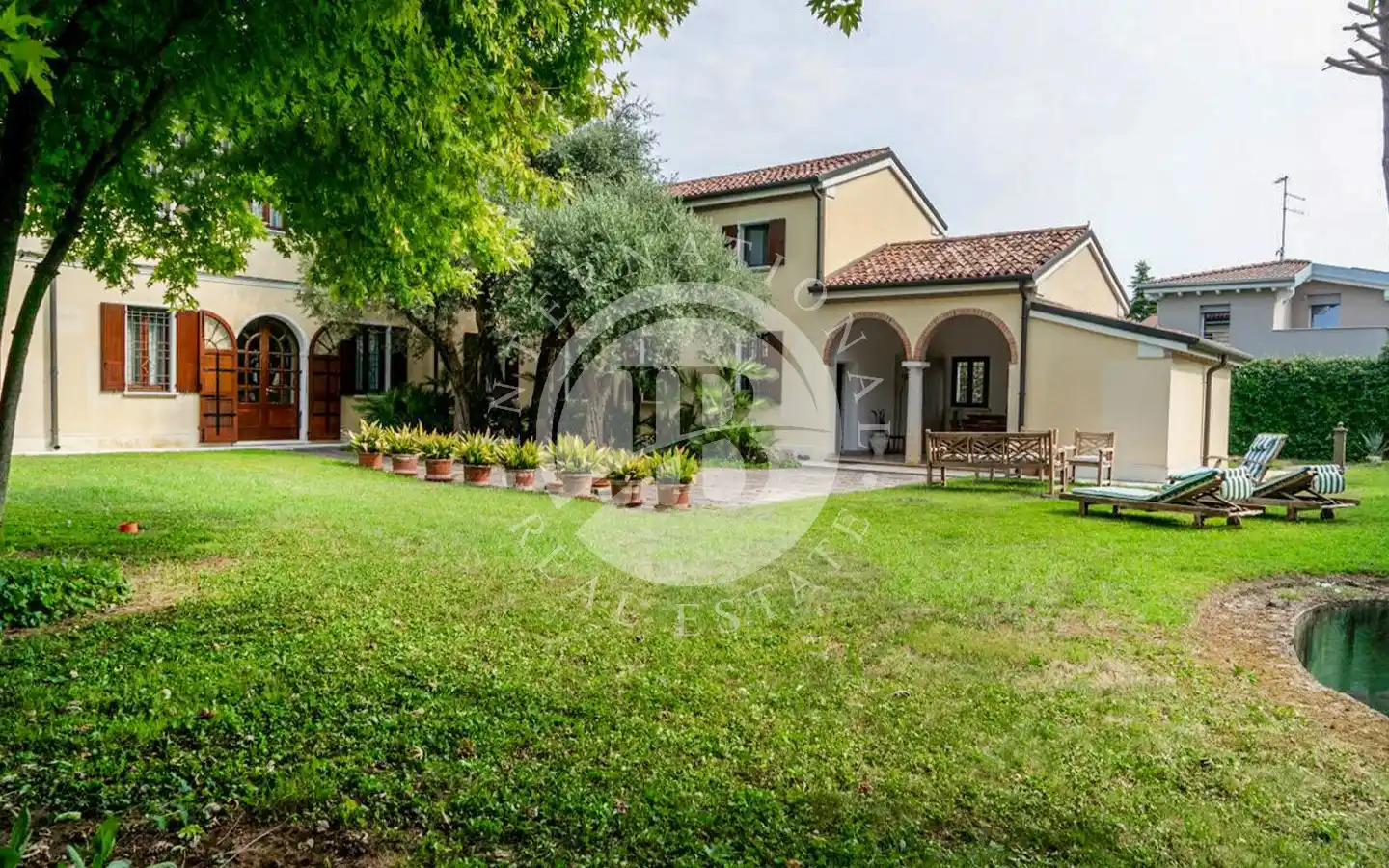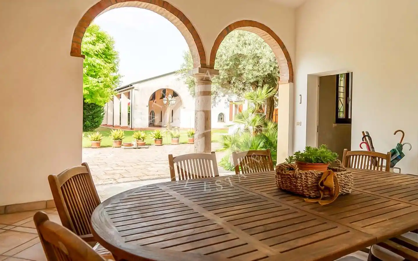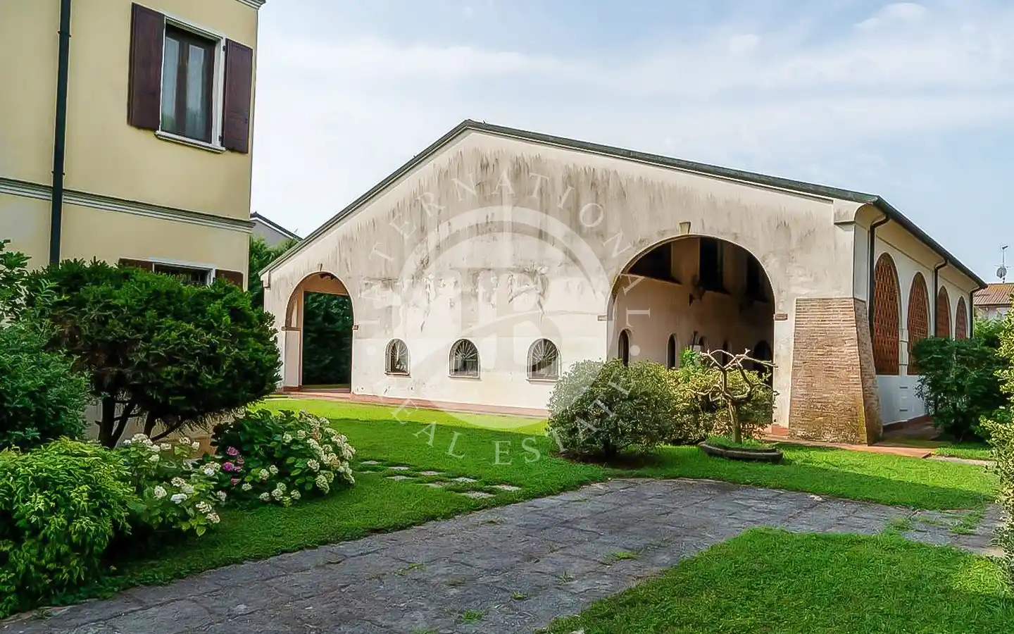 uce alla proprietà, circondata da circa 3.000 mq di terreno con alberi secolari e vegetazione rigogliosa. L’area esterna comprende una tettoia coperta per più auto, una barchessa caratteristica con doppi portici eleganti, oltre a una grande piscina completa di spogliatoi e servizi dedicati.