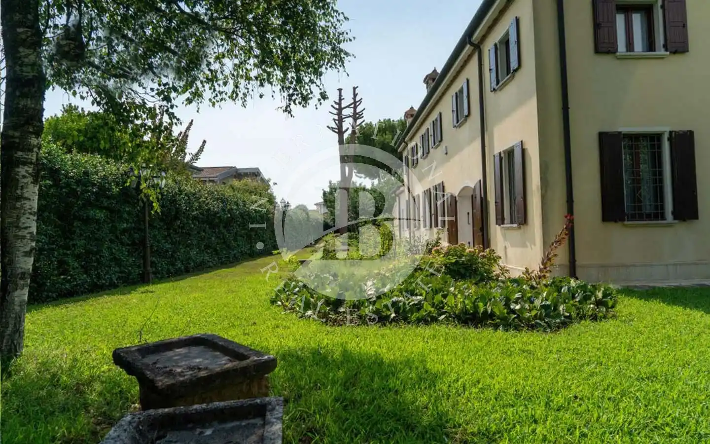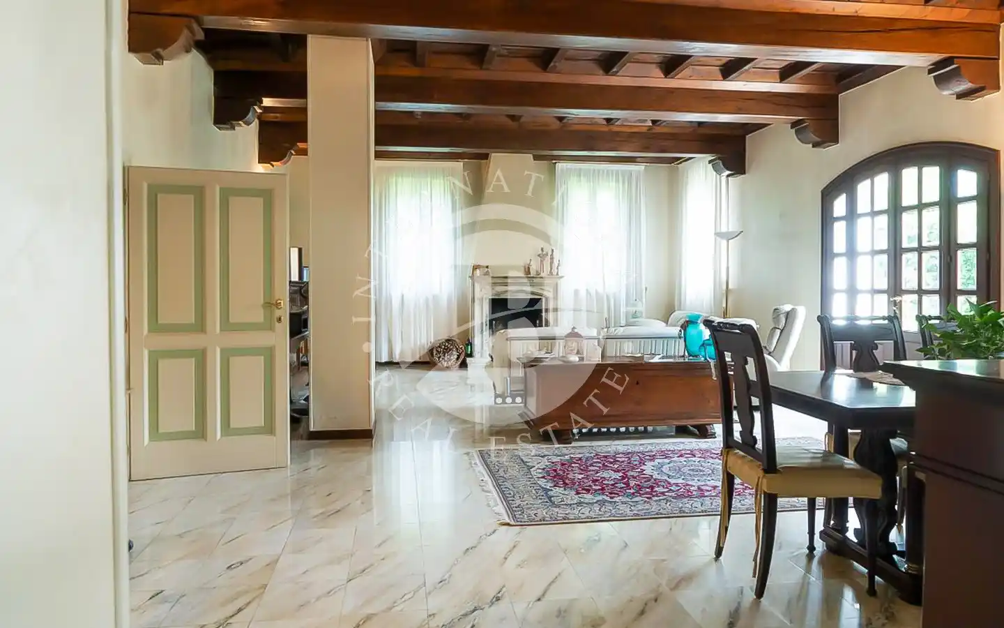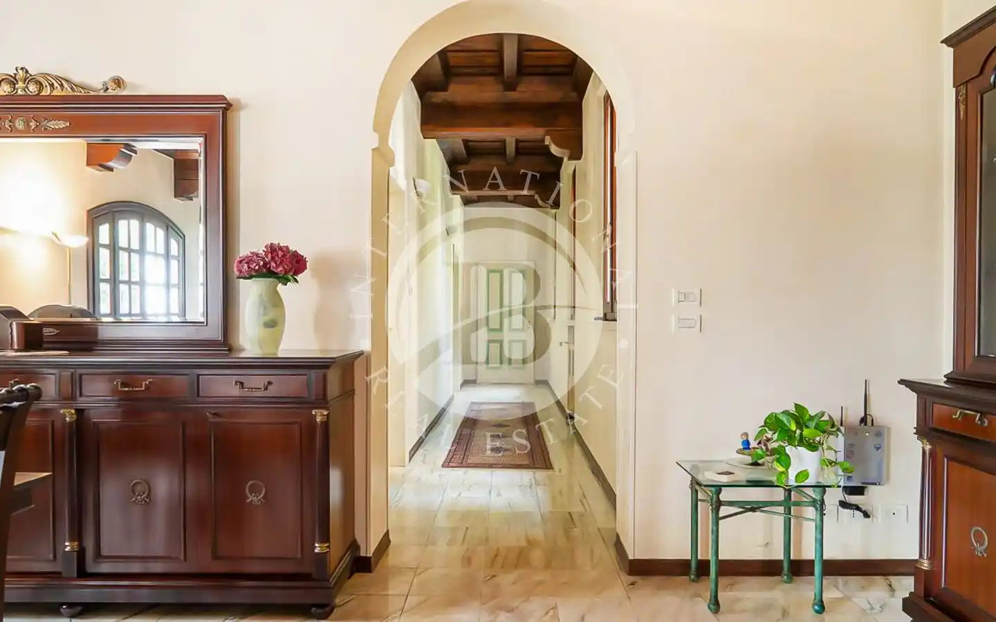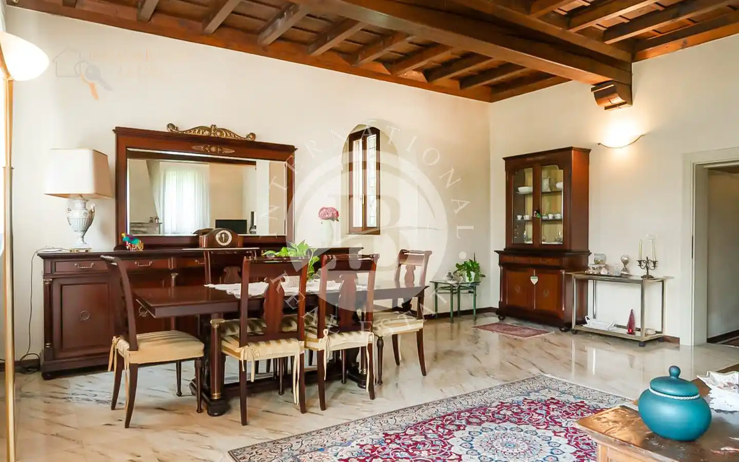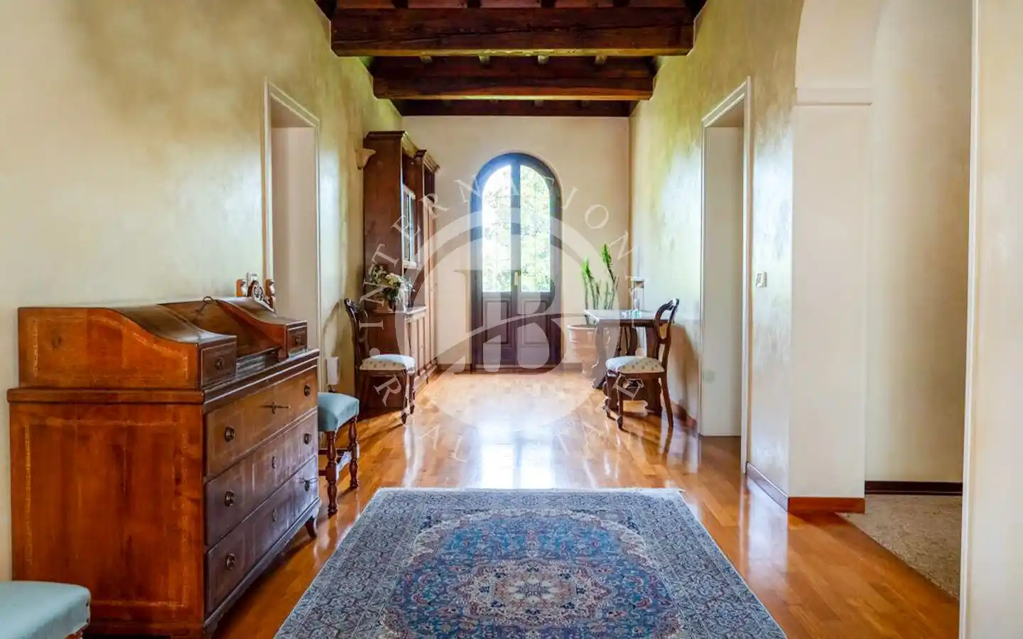 uce alla proprietà, circondata da circa 3.000 mq di terreno con alberi secolari e vegetazione rigogliosa. L’area esterna comprende una tettoia coperta per più auto, una barchessa caratteristica con doppi portici eleganti, oltre a una grande piscina completa di spogliatoi e servizi dedicati.