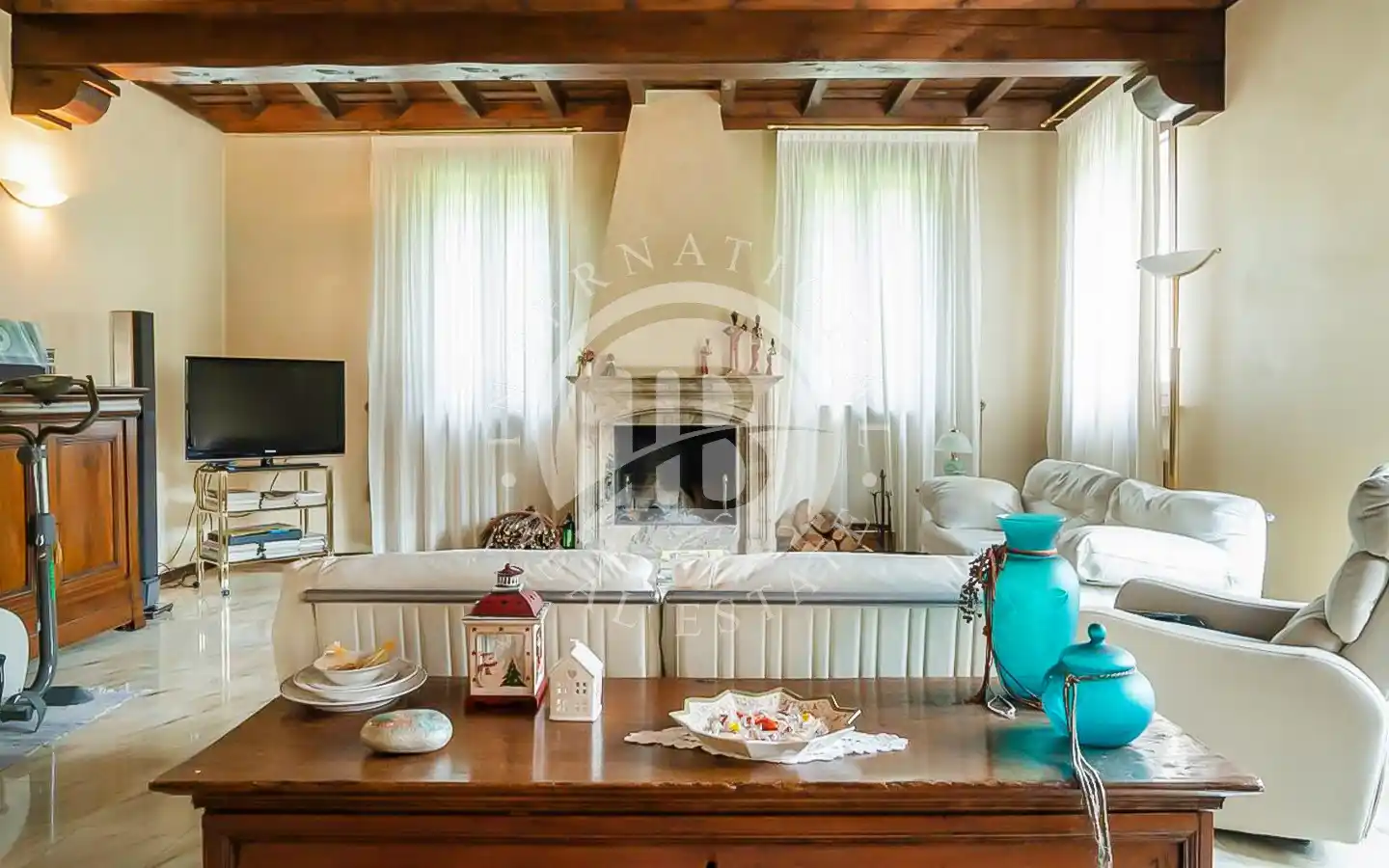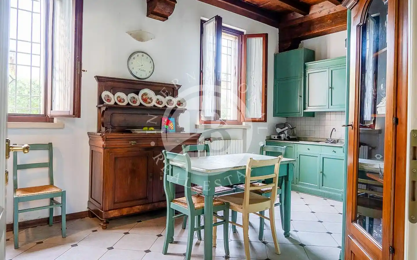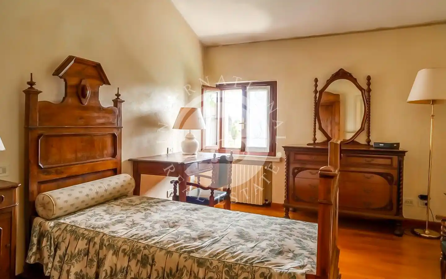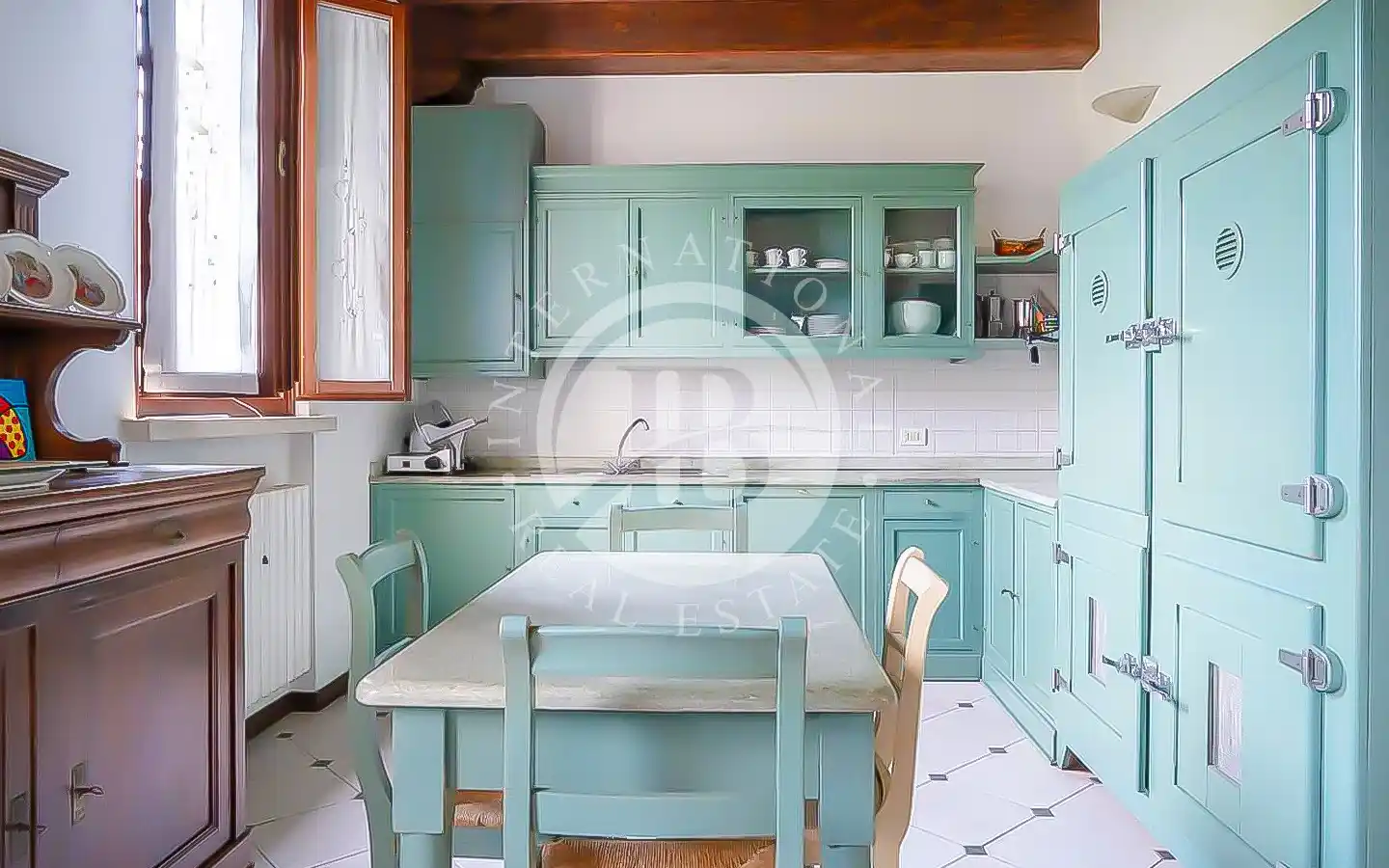 uce alla proprietà, circondata da circa 3.000 mq di terreno con alberi secolari e vegetazione rigogliosa. L’area esterna comprende una tettoia coperta per più auto, una barchessa caratteristica con doppi portici eleganti, oltre a una grande piscina completa di spogliatoi e servizi dedicati.