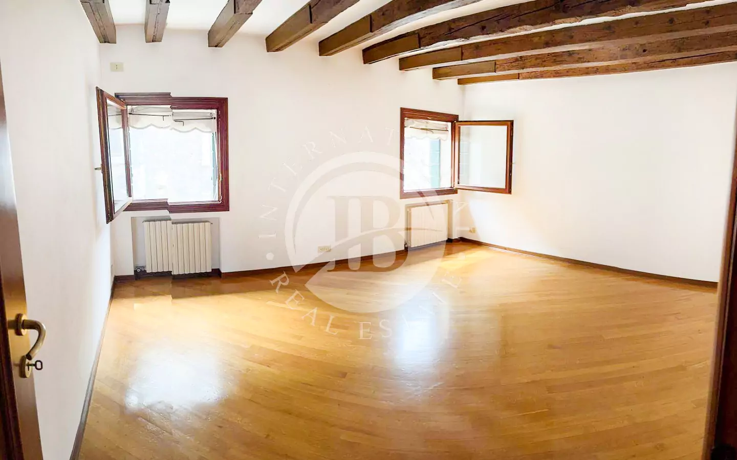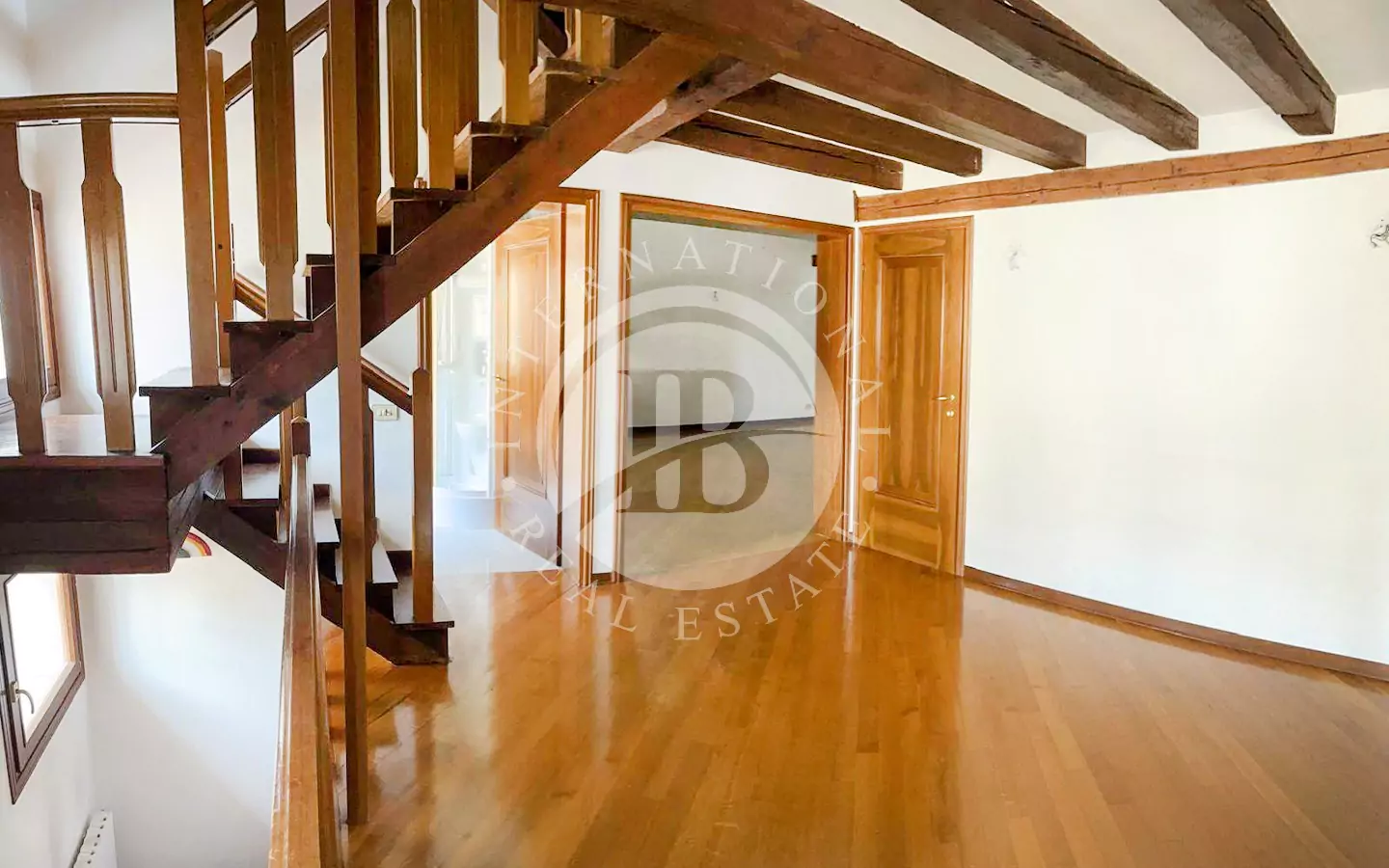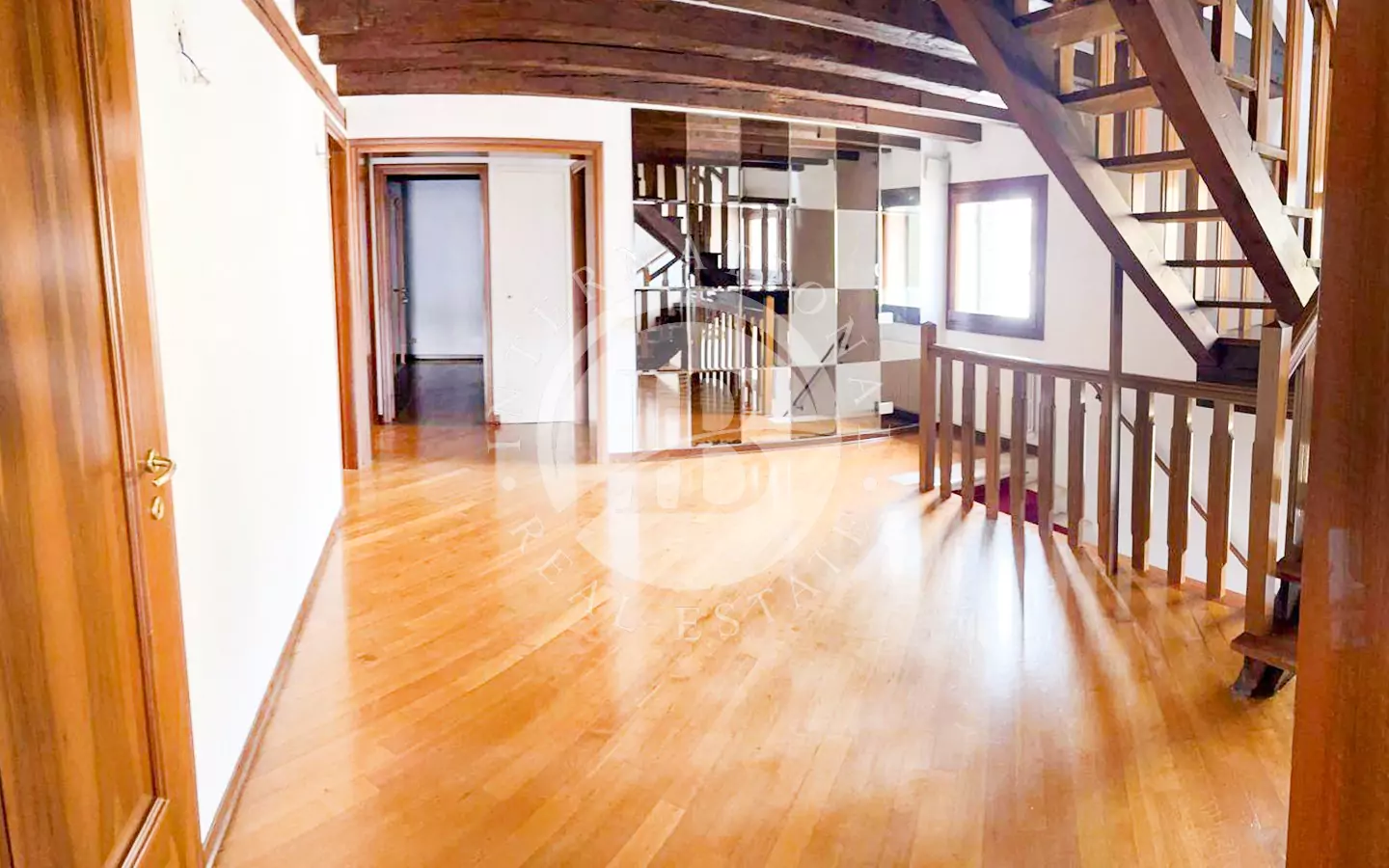 e ingresso, un salone con caminetto che dona calore e atmosfera, una cucina a vista perfettamente integrata nella zona giorno, quattro camere da letto, tre bagni, pavimenti in parquet e caratteristiche travi a vista che valorizzano l’autenticità veneziana degli spazi.