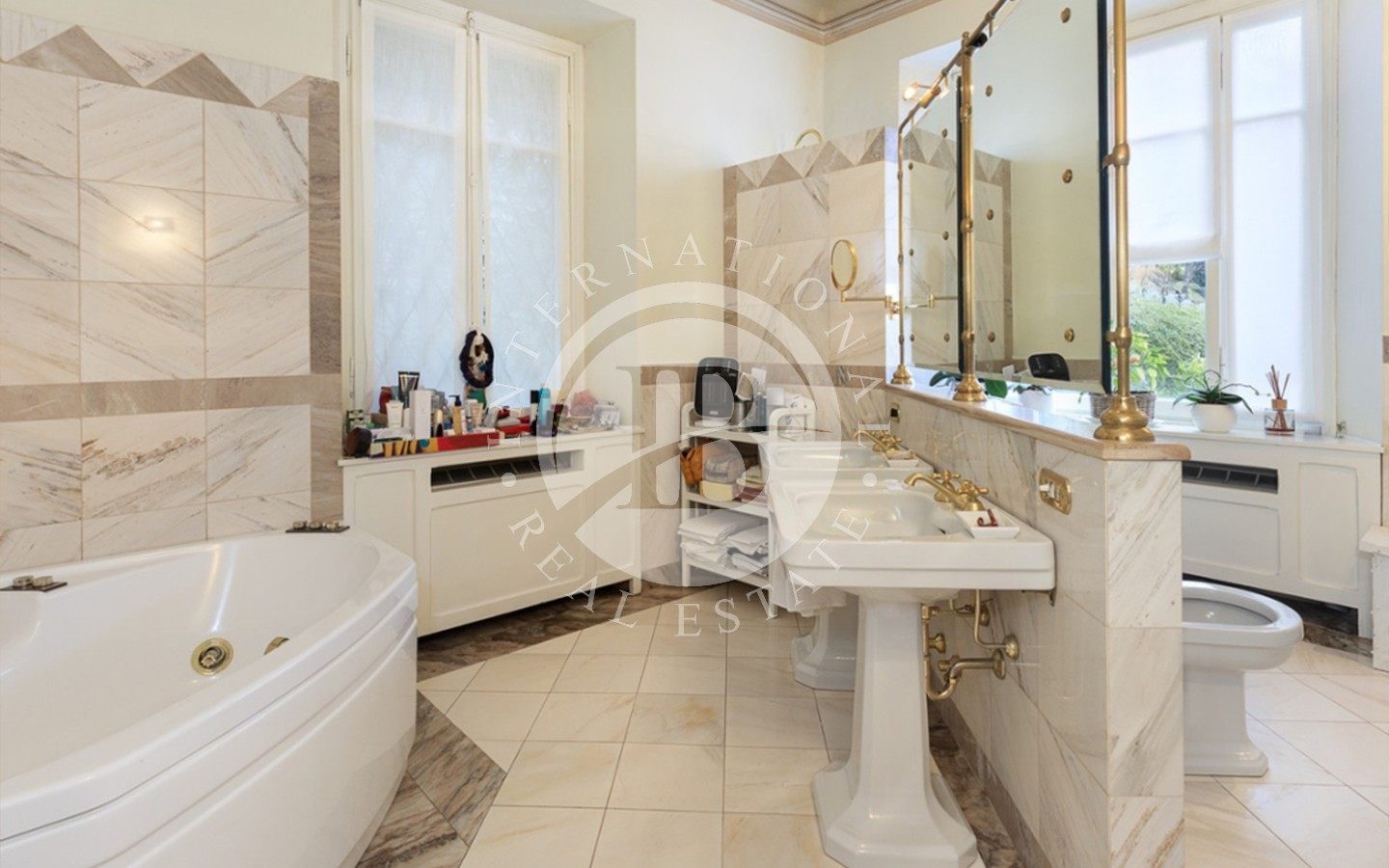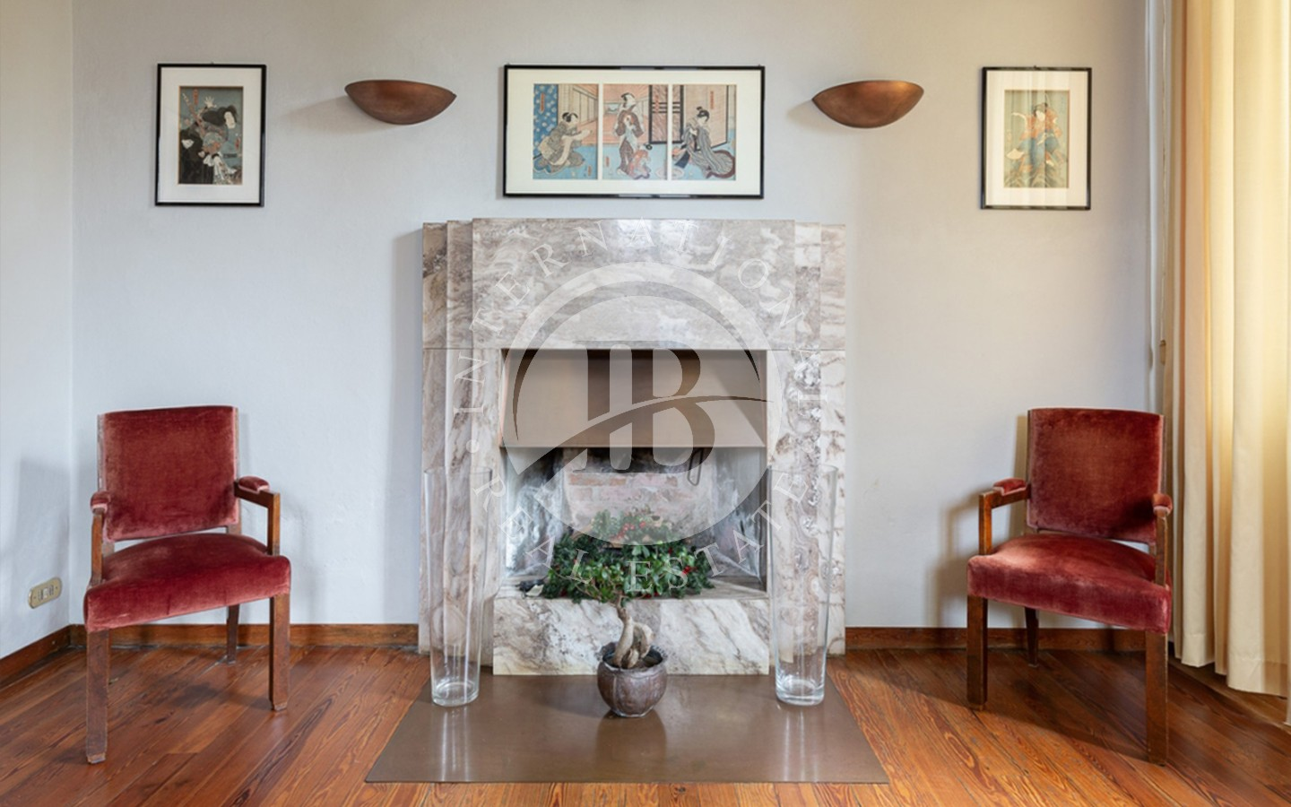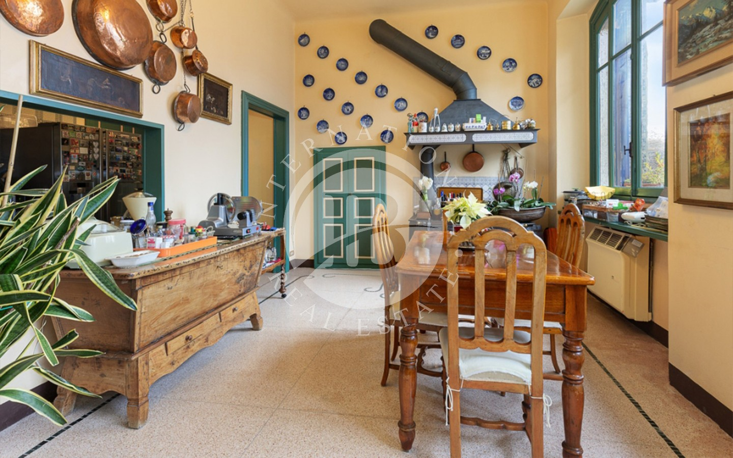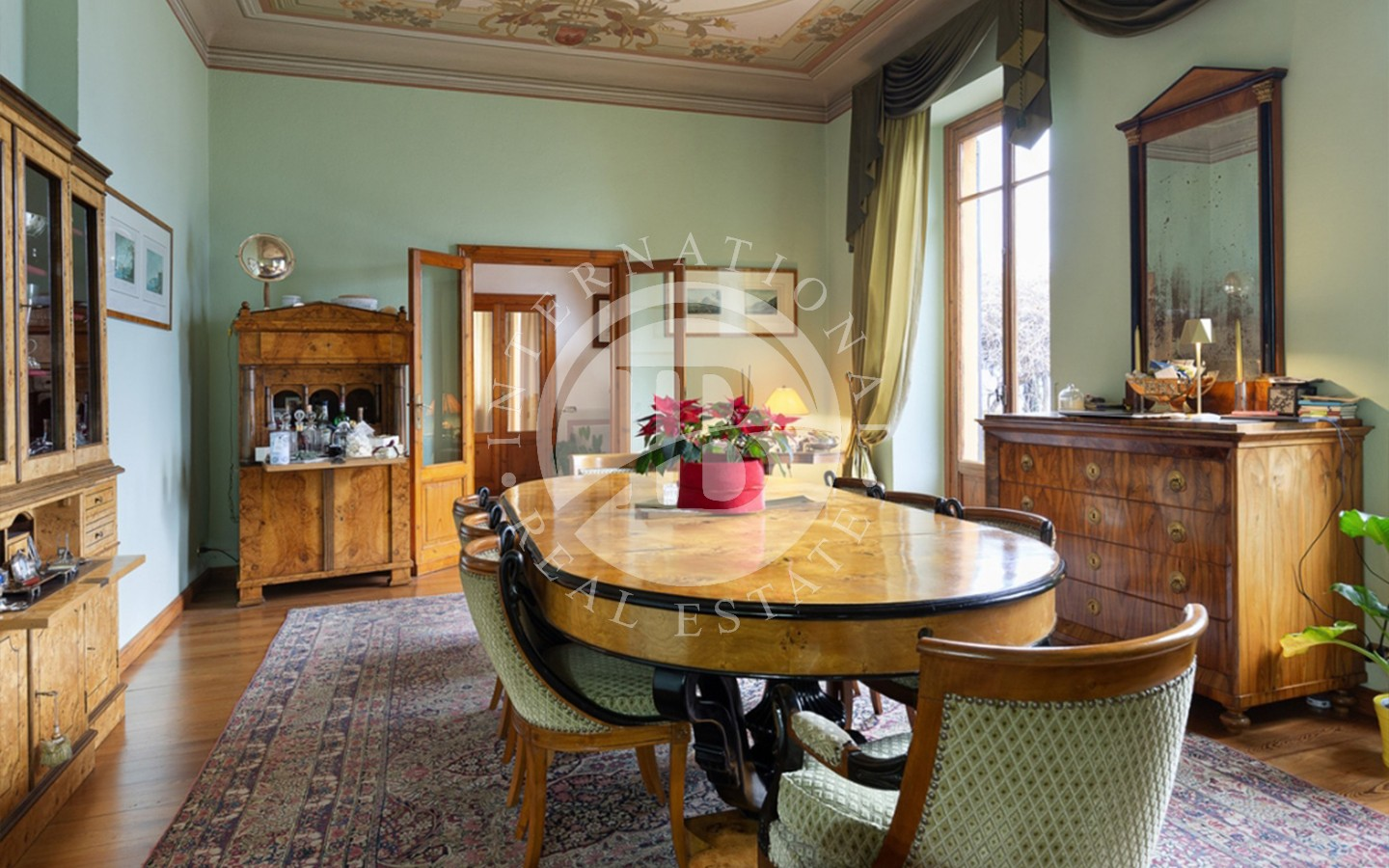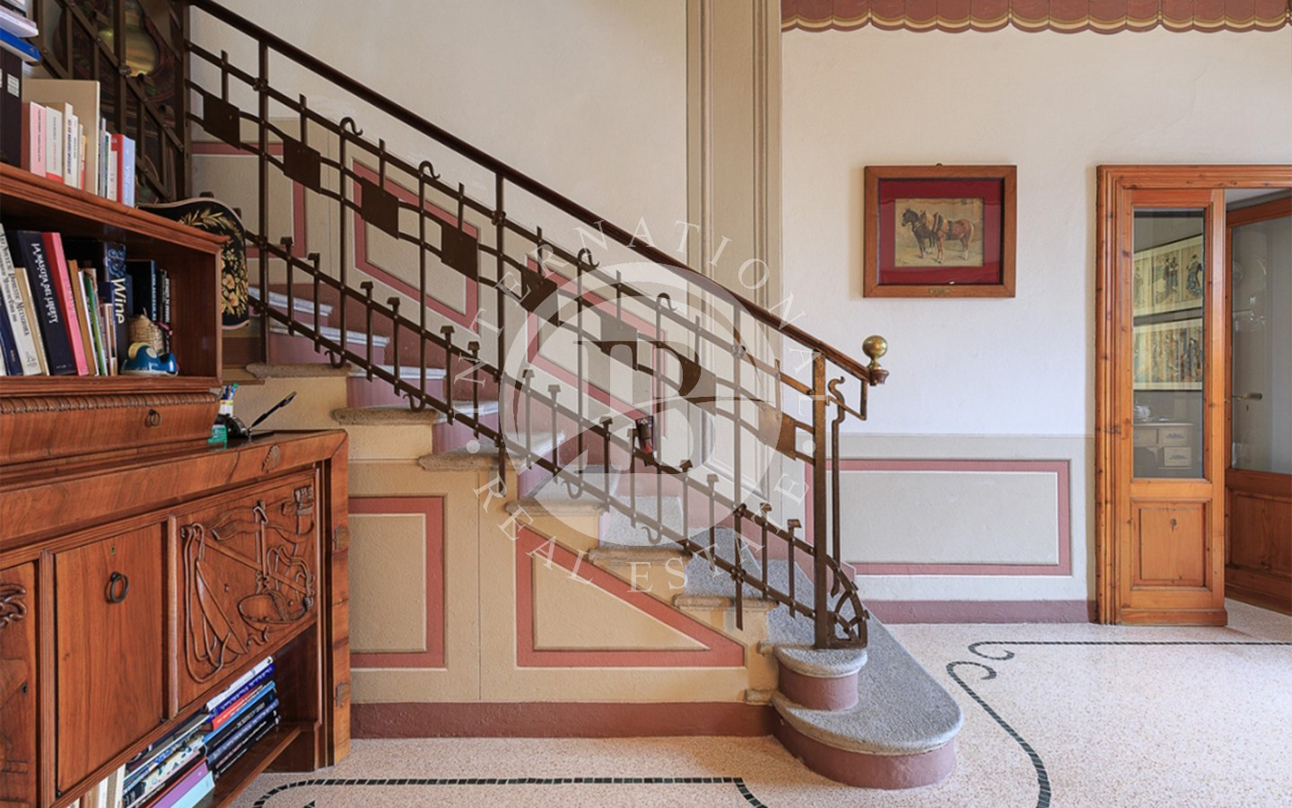 Interiøret er utsmykket med fine materialer som parkett, synlig stein, marmor og raffinerte smijernsdetaljer, i harmoni med de originale elementene og de tidstypiske dekorasjonene som gir rommene en varm, raffinert og tidløs atmosfære.