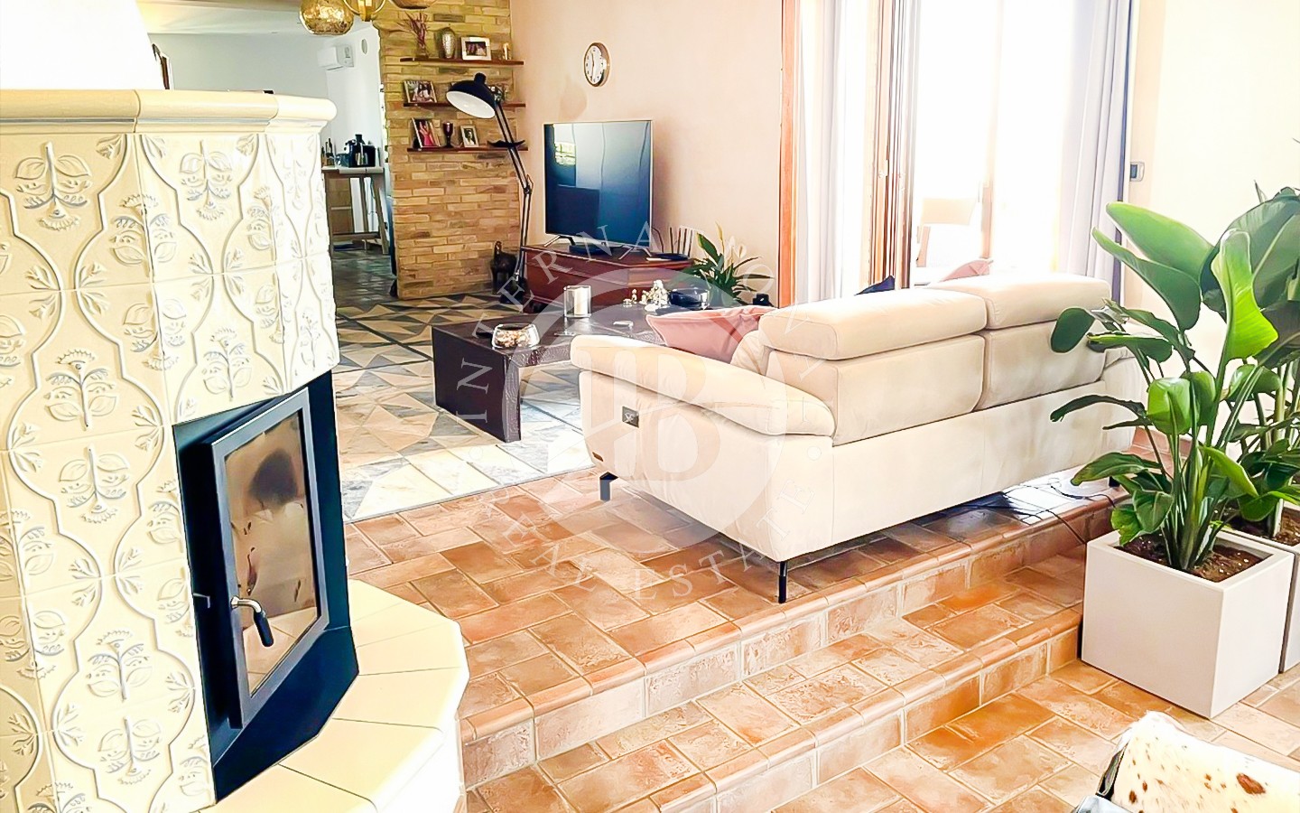 scala interna. Al piano terra si accede tramite un ingresso che conduce a un’ampia zona giorno con elegante stufa in maiolica, cucina a vista, disimpegno, un bagno e una camera da letto. Il primo piano ospita tre camere da letto e due bagni, di cui uno en-suite nella camera padronale.