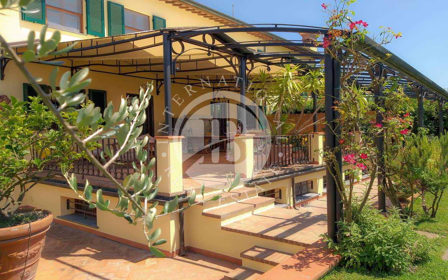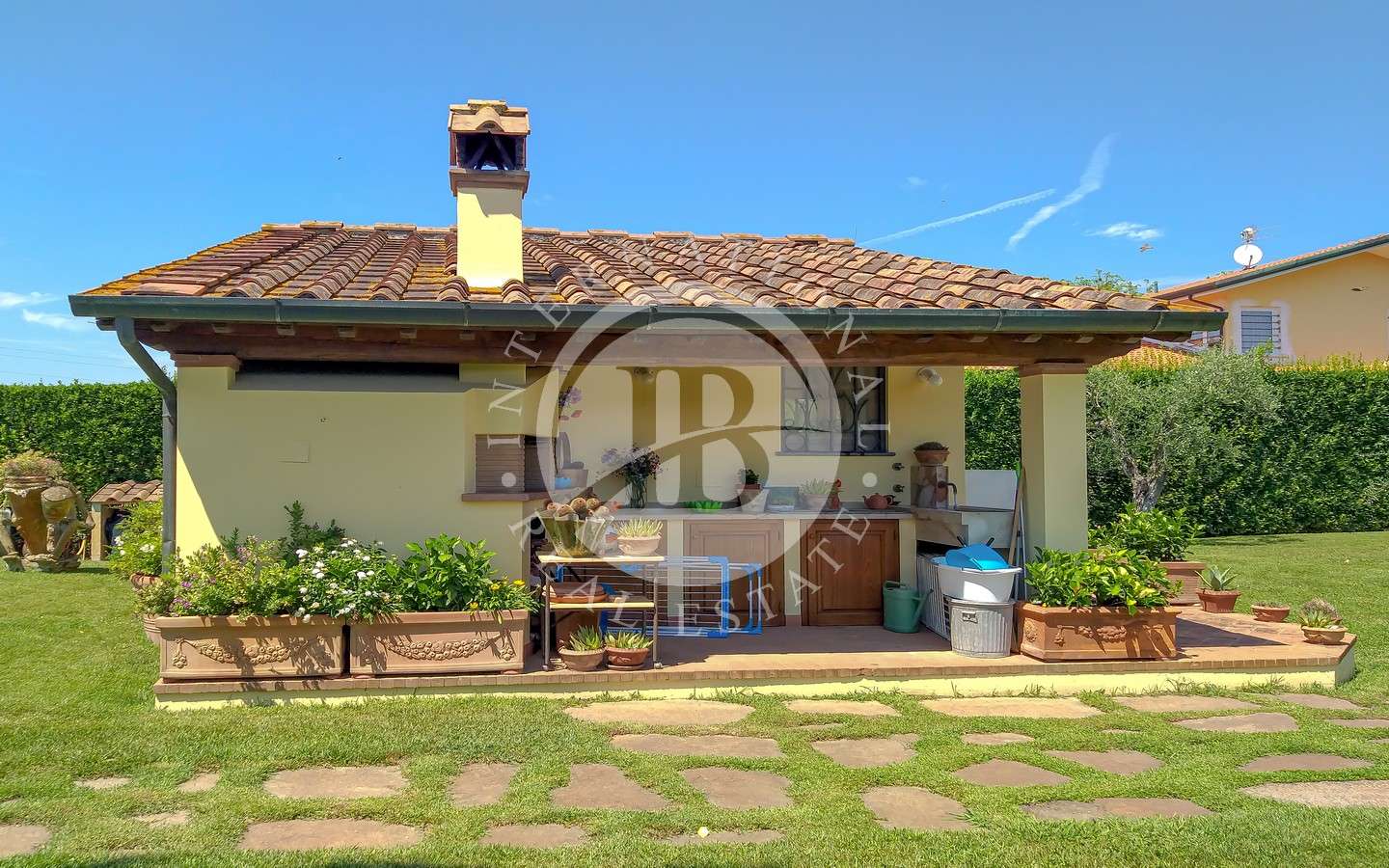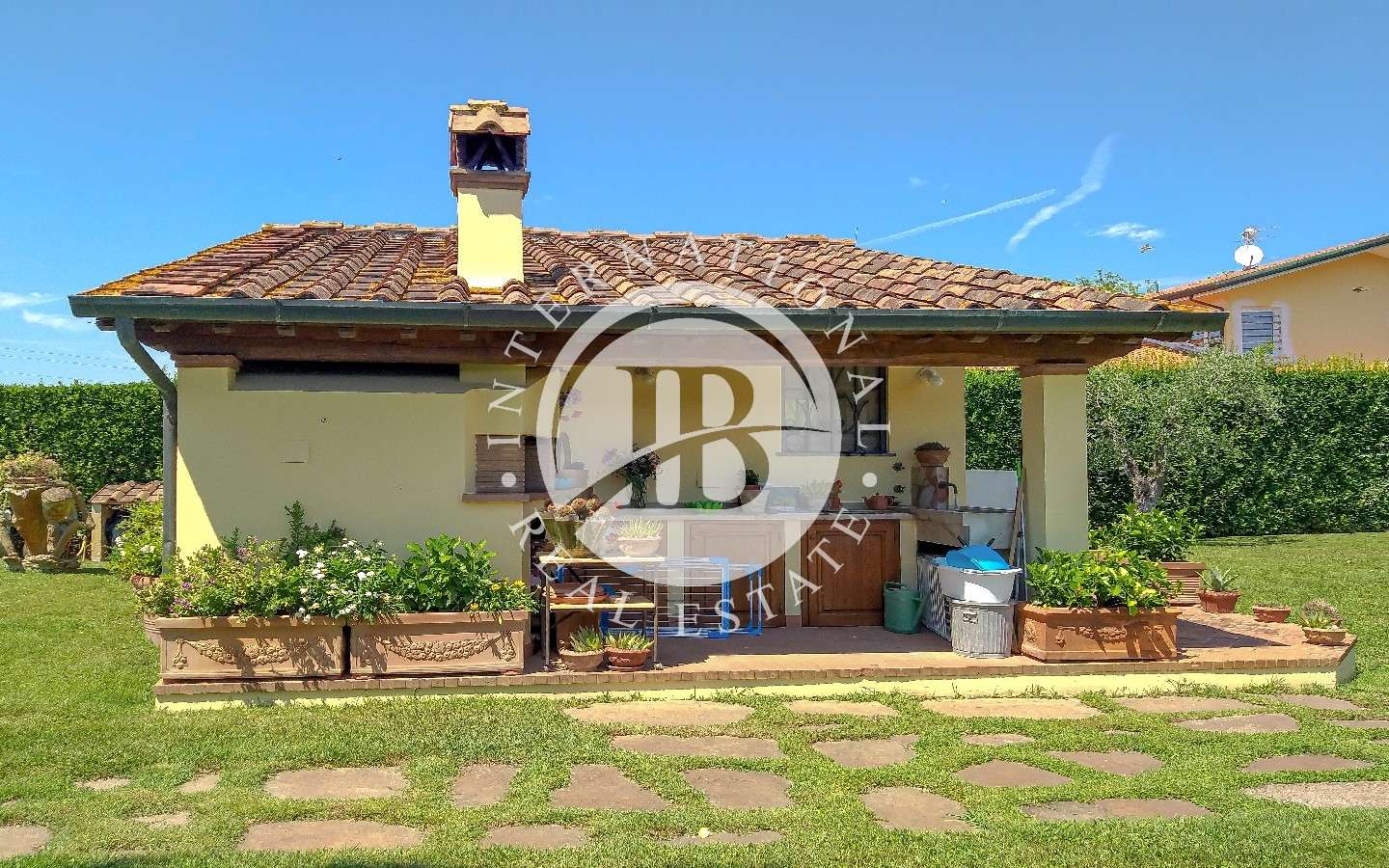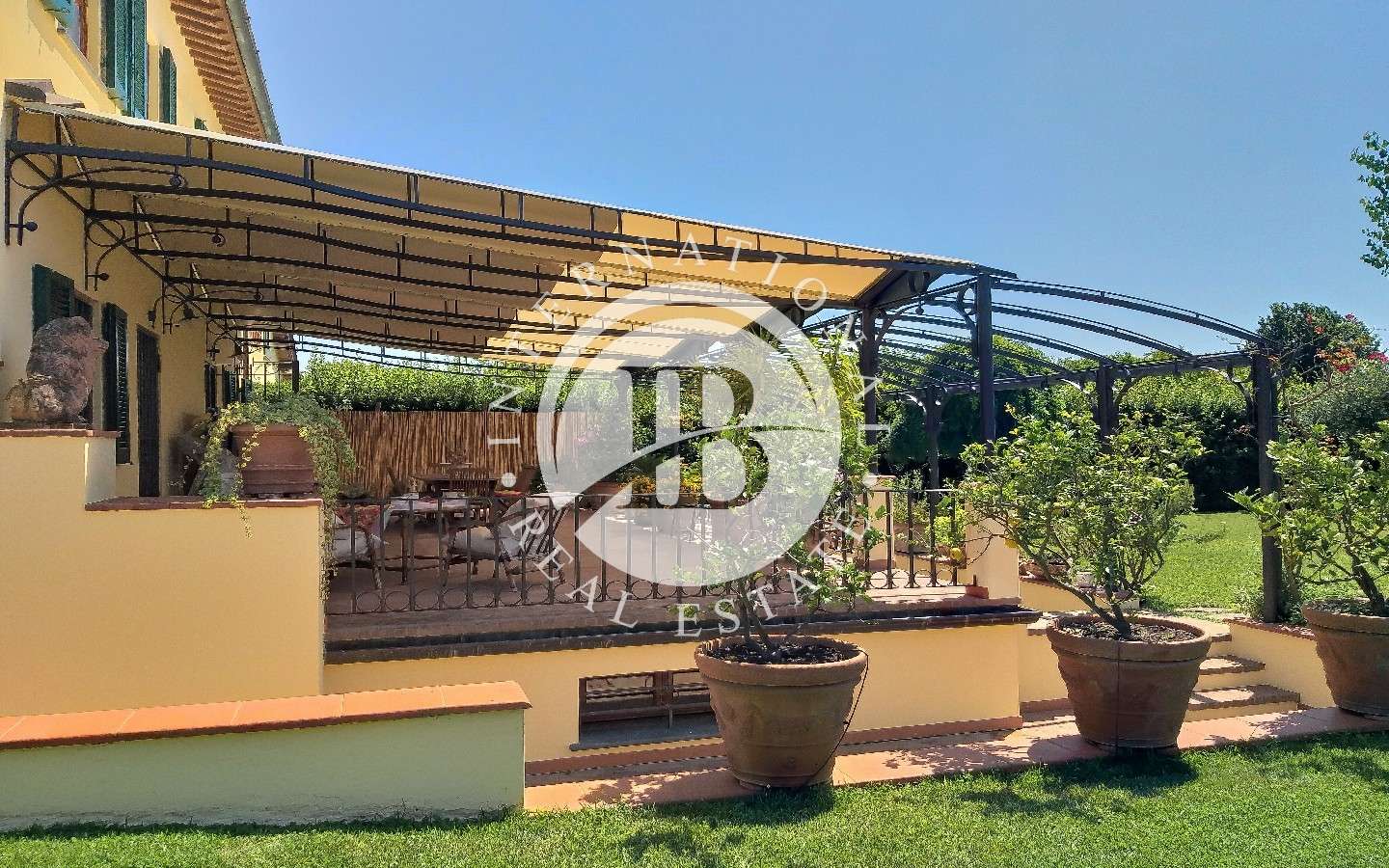 Davanti alla proprietà, un grande portico per splendide cene e pranzi all'aperto affacciato su giardino con piscina e una dependance che ospita una camera da letto con bagno e possibilità di creare una cucina.