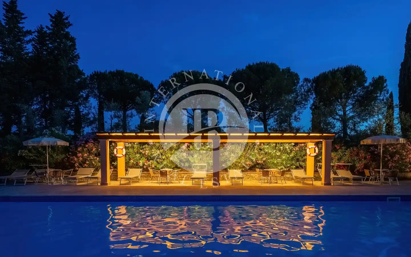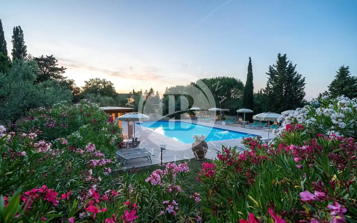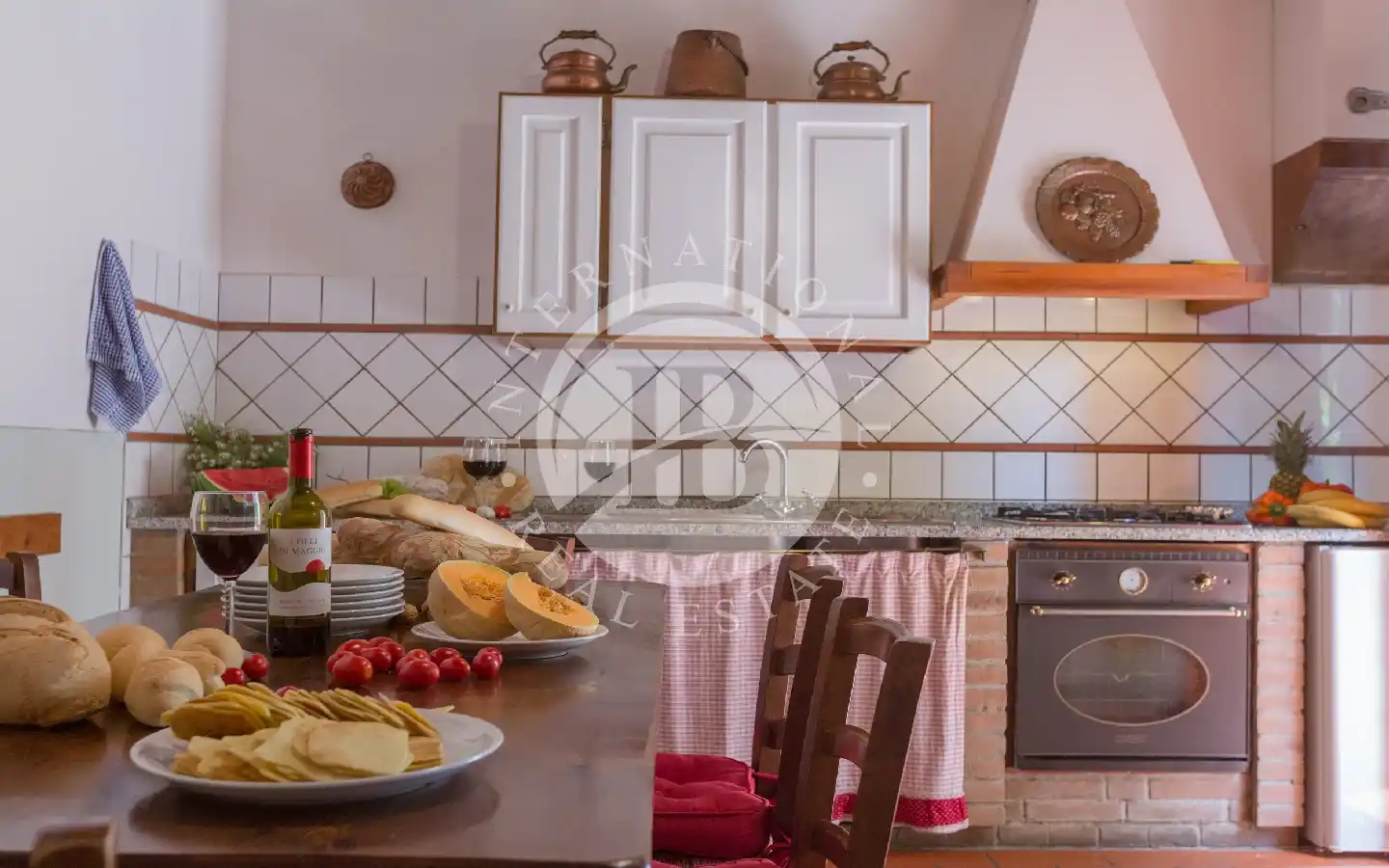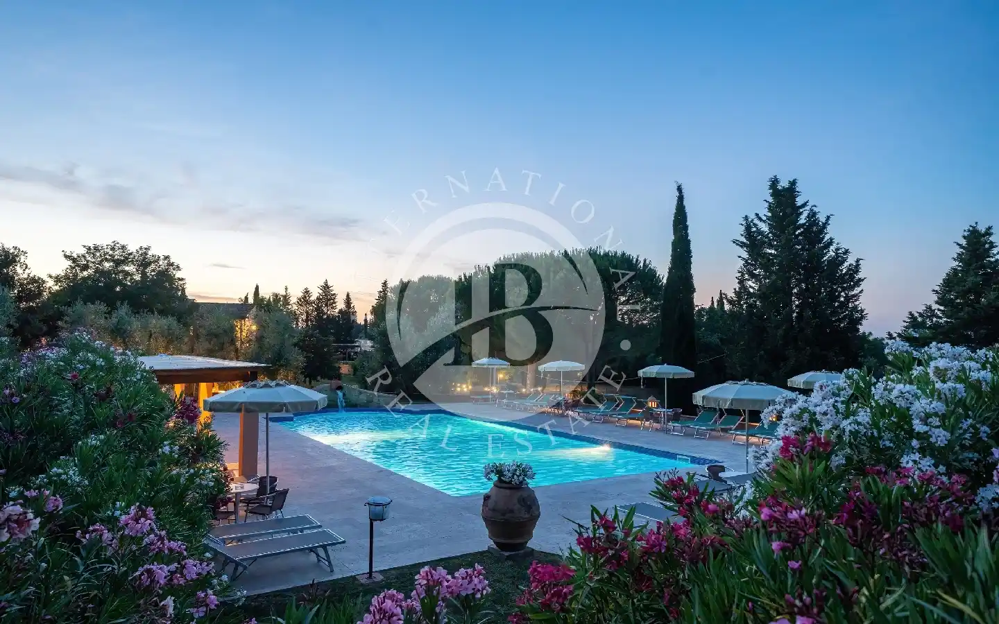 li di 80 mq ciascuno. Questi ultimi, ideali per famiglie numerose e gruppi di amici desiderosi di condividere spazi in totale privacy, offrono un'atmosfera accogliente e autentica. Il complesso immobiliare è immerso in un giardino di 6.500 mq, arricchito da oleandri e ulivi, dove emerge in posizione panoramica una magnifica piscina di notevoli dimensioni (20 x 8), dotata di un ampio solarium attrezzato e una zona relax con idromassaggio. Ogni appartamento gode di un gazebo con barbecue riservato, mentre il parcheggio per le auto è coperto. L'edificio principale rappresenta un tipico casale toscano risalente al 1800, caratterizzato da elementi originali come il pavimento in cotto, le travi in legno e il camino a legna, che conferiscono un'atmosfera confortevole e autentica all'ambiente. Il complesso è dotato di impianto di riscaldamento e condizionamento, e dispone di pannelli fotovoltaici da 10 Kw, garantendo una gestione moderna ed efficiente dell'energia.