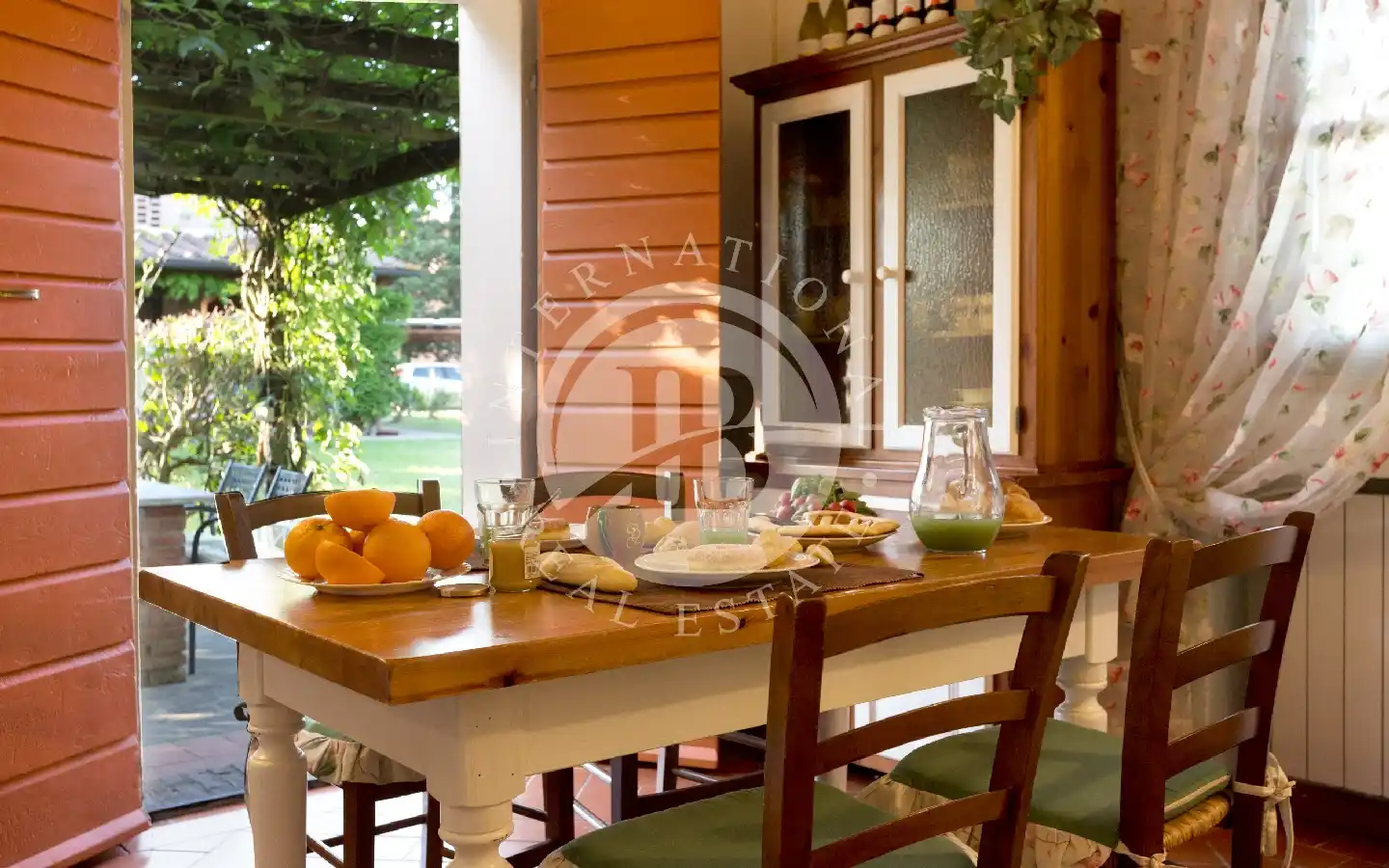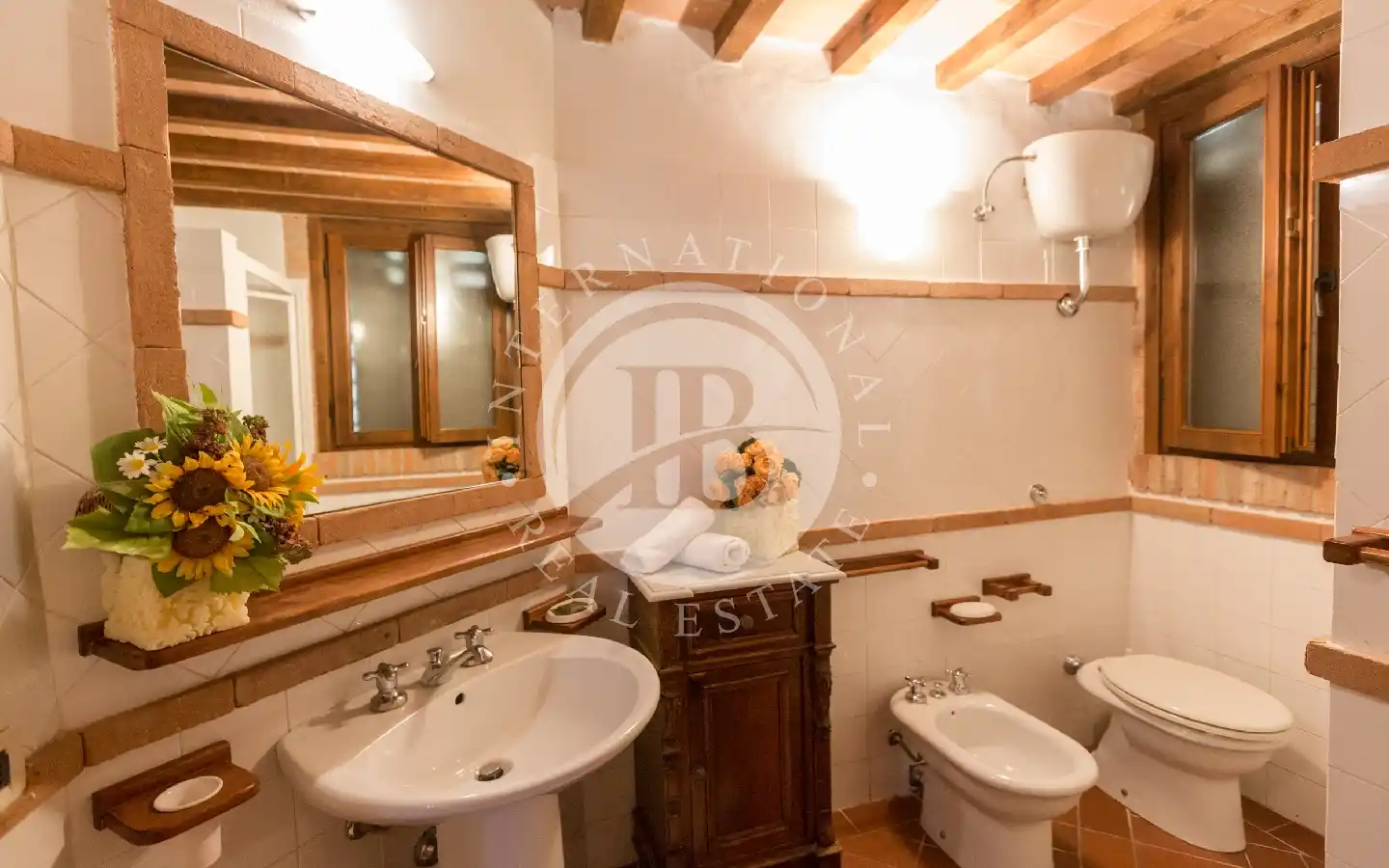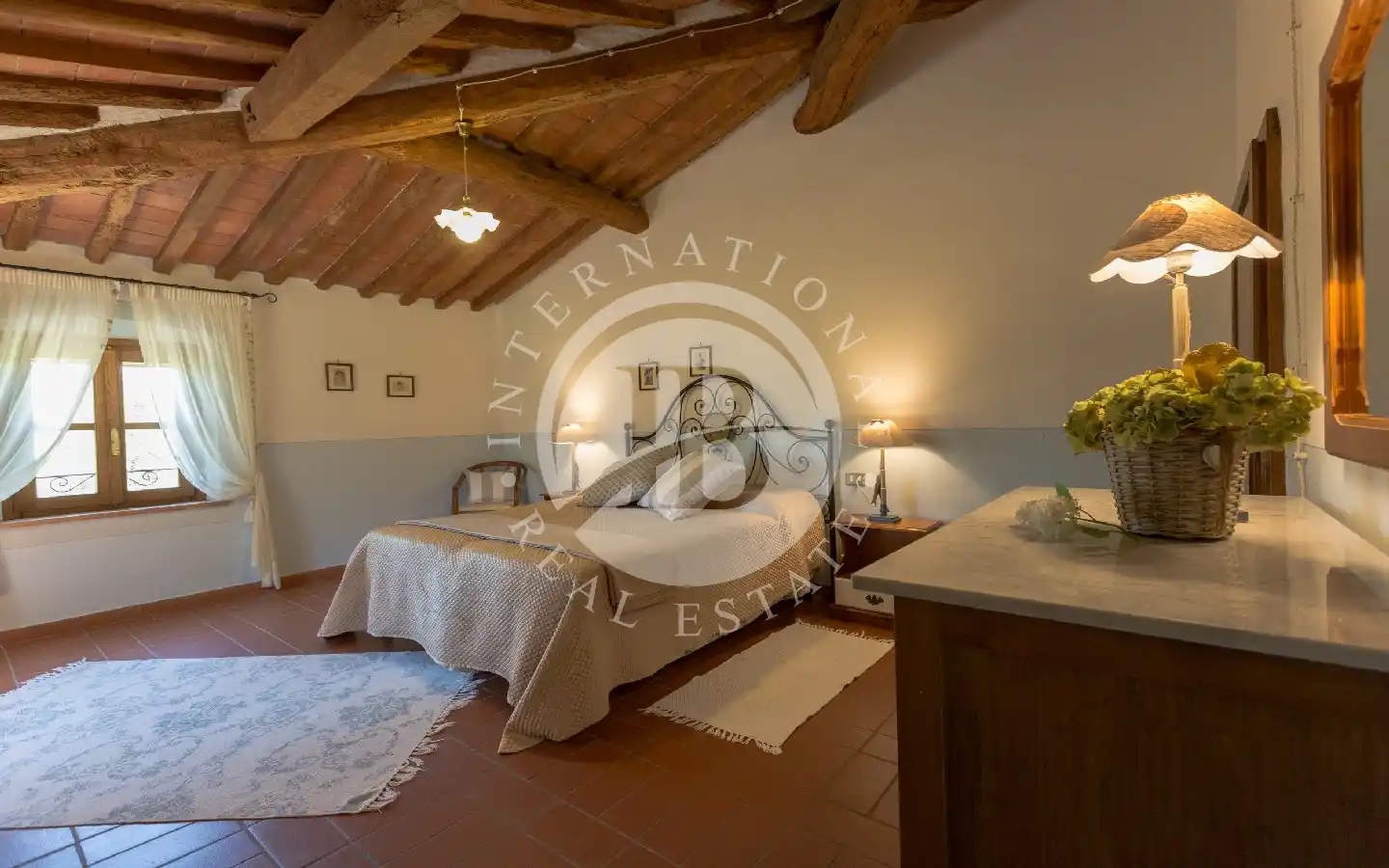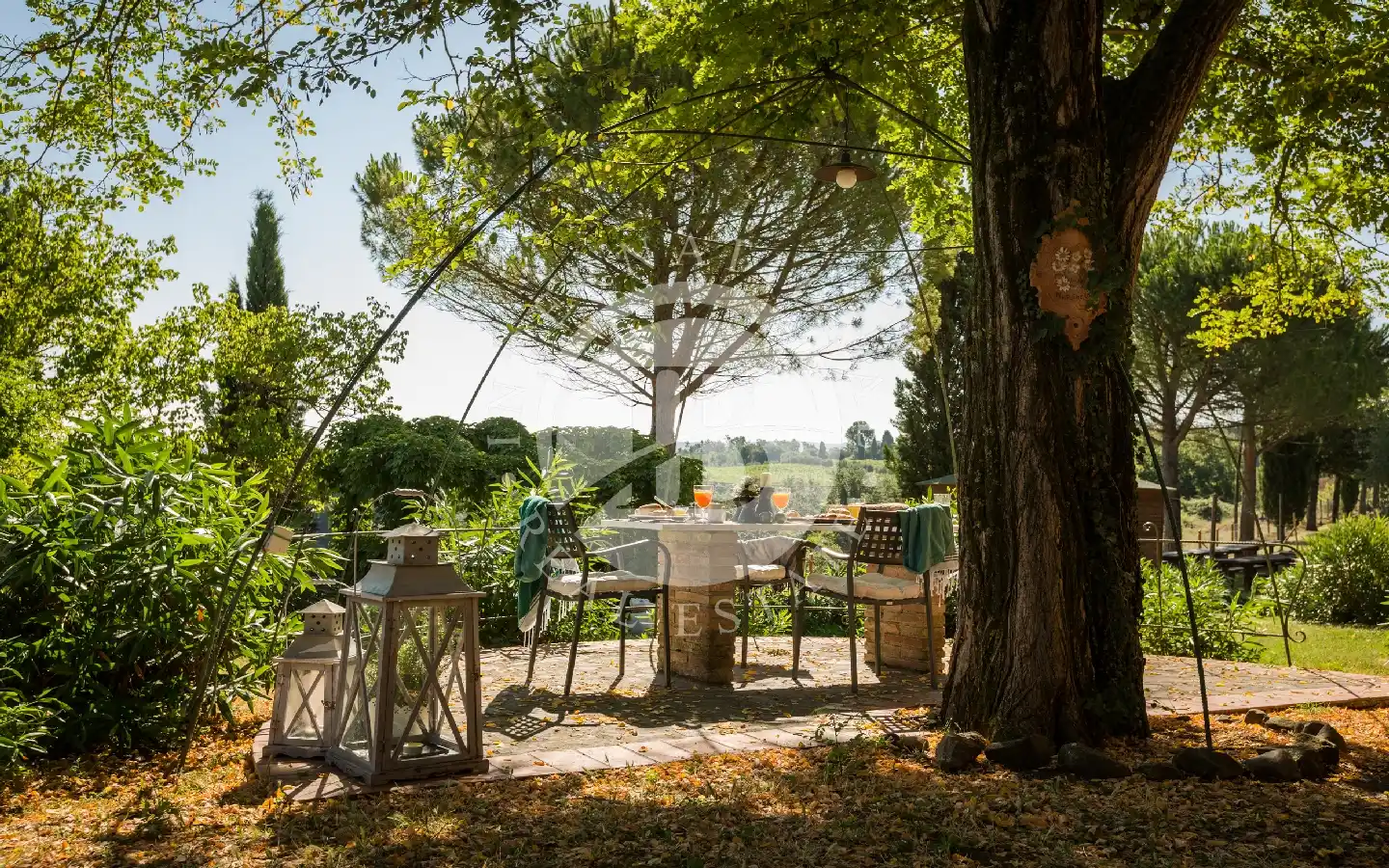 li di 80 mq ciascuno. Questi ultimi, ideali per famiglie numerose e gruppi di amici desiderosi di condividere spazi in totale privacy, offrono un'atmosfera accogliente e autentica. Il complesso immobiliare è immerso in un giardino di 6.500 mq, arricchito da oleandri e ulivi, dove emerge in posizione panoramica una magnifica piscina di notevoli dimensioni (20 x 8), dotata di un ampio solarium attrezzato e una zona relax con idromassaggio. Ogni appartamento gode di un gazebo con barbecue riservato, mentre il parcheggio per le auto è coperto. L'edificio principale rappresenta un tipico casale toscano risalente al 1800, caratterizzato da elementi originali come il pavimento in cotto, le travi in legno e il camino a legna, che conferiscono un'atmosfera confortevole e autentica all'ambiente. Il complesso è dotato di impianto di riscaldamento e condizionamento, e dispone di pannelli fotovoltaici da 10 Kw, garantendo una gestione moderna ed efficiente dell'energia.