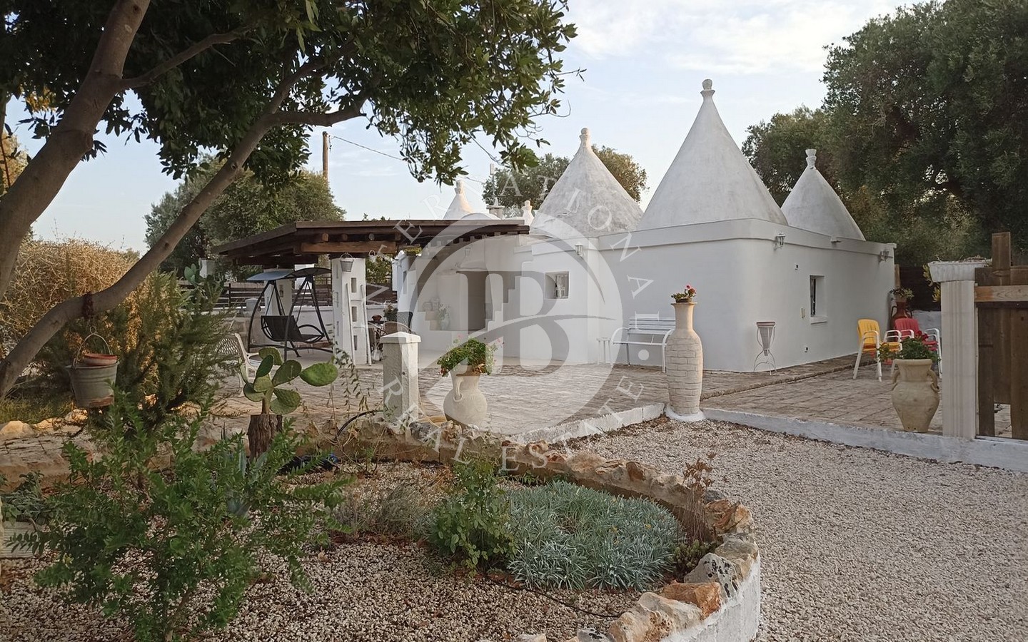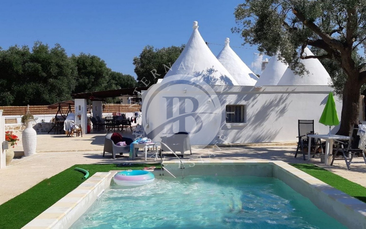 All'esterno, la proprietà dispone di un patio antistante che si affaccia su un'area barbeque, perfetta per pranzi e cene all'aperto. Il cortile, ben curato, ospita una piscina che invita a momenti di relax e svago. Il terreno circostante, di circa 8.000 mq, è piantumato con ulivi secolari, contribuendo a creare un'atmosfera di pace e serenità.