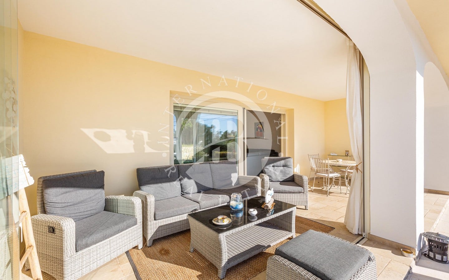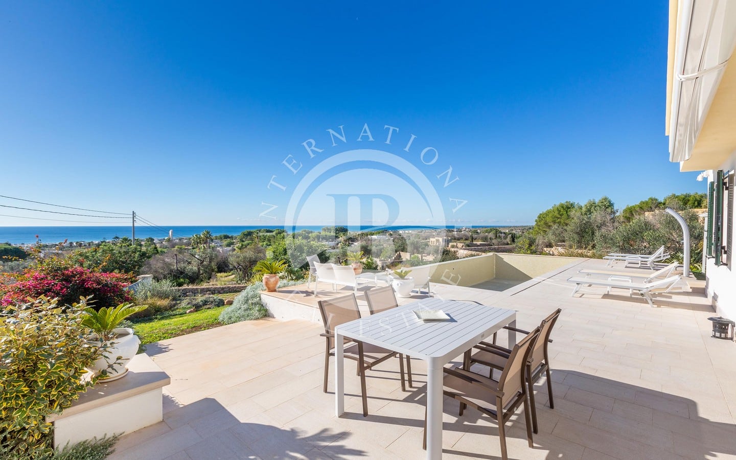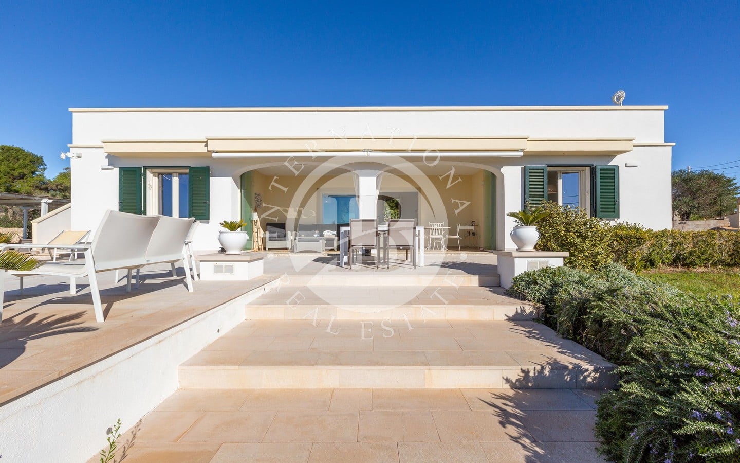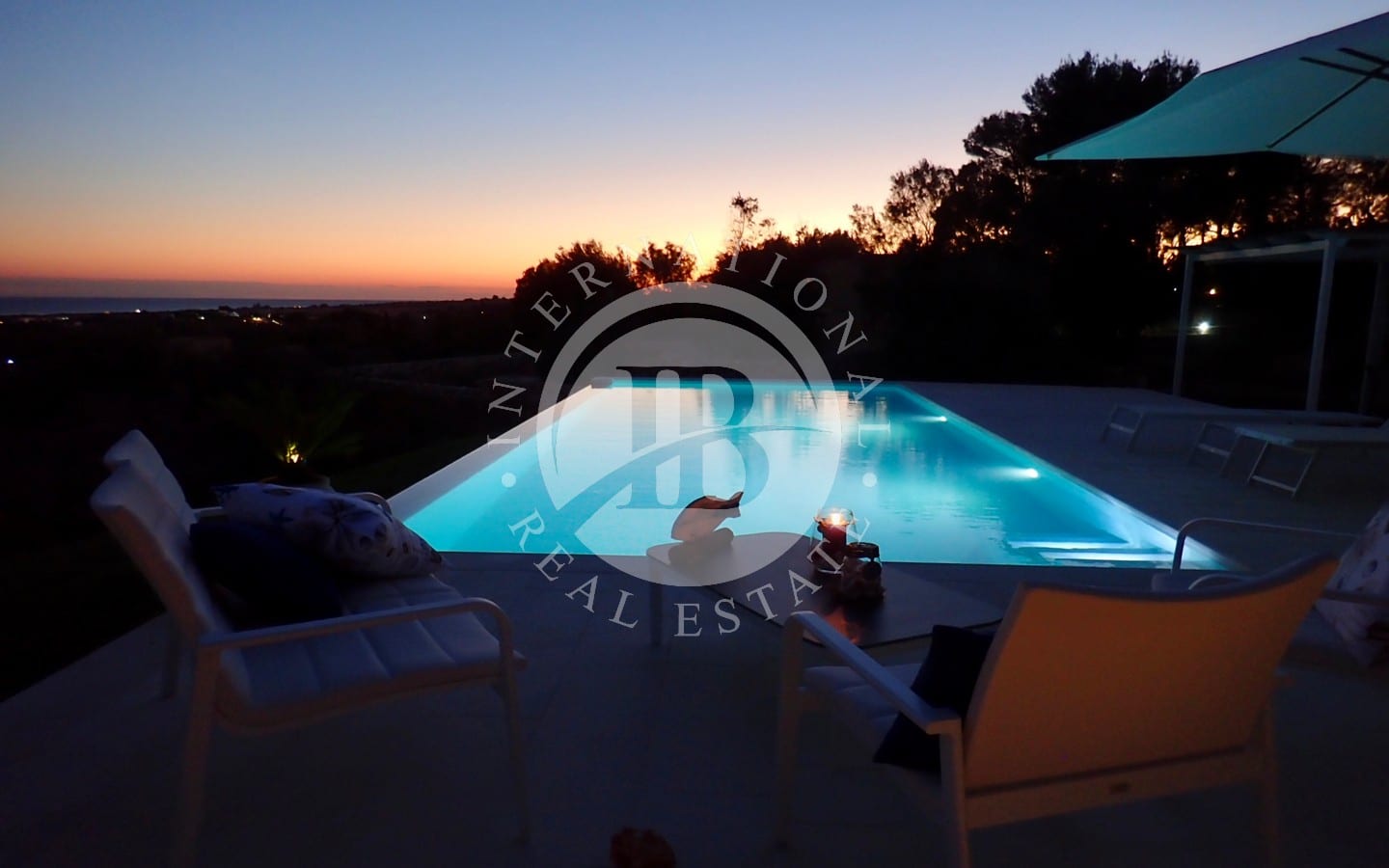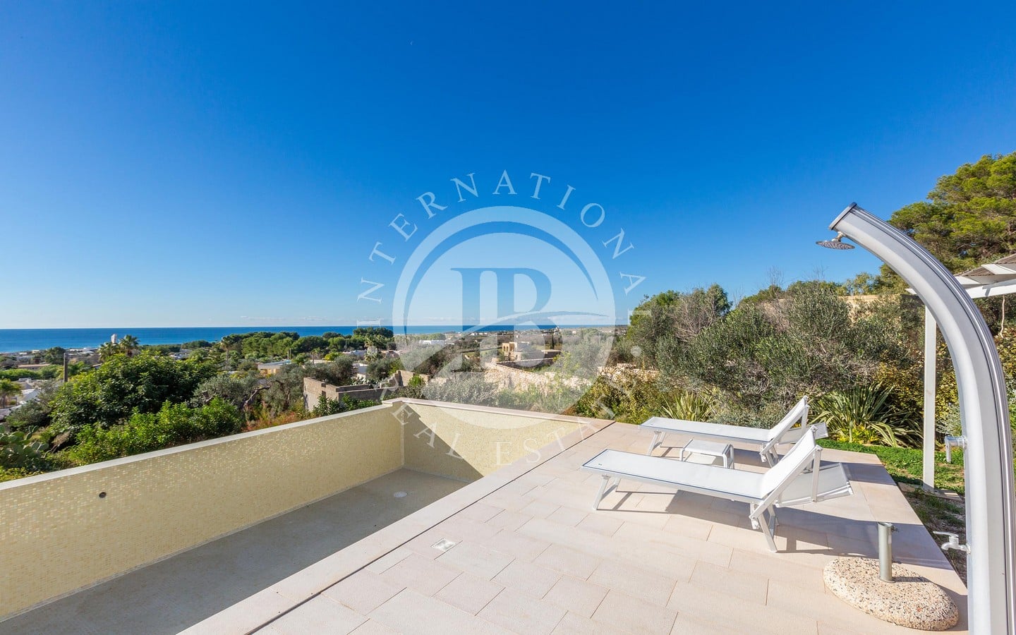 Il porticato di 25 mq, protetto da tende e vetrate a scomparsa, permette di vivere gli esterni durante tutto l’anno, mentre la piscina a sfioro di 40 mq, incorniciata dal giardino curato, rappresenta il luogo ideale per rilassarsi ammirando il panorama marino.
