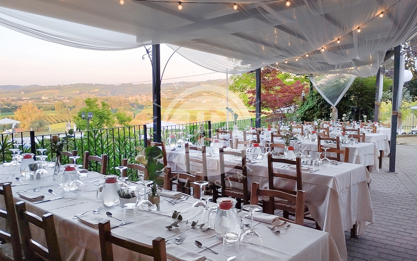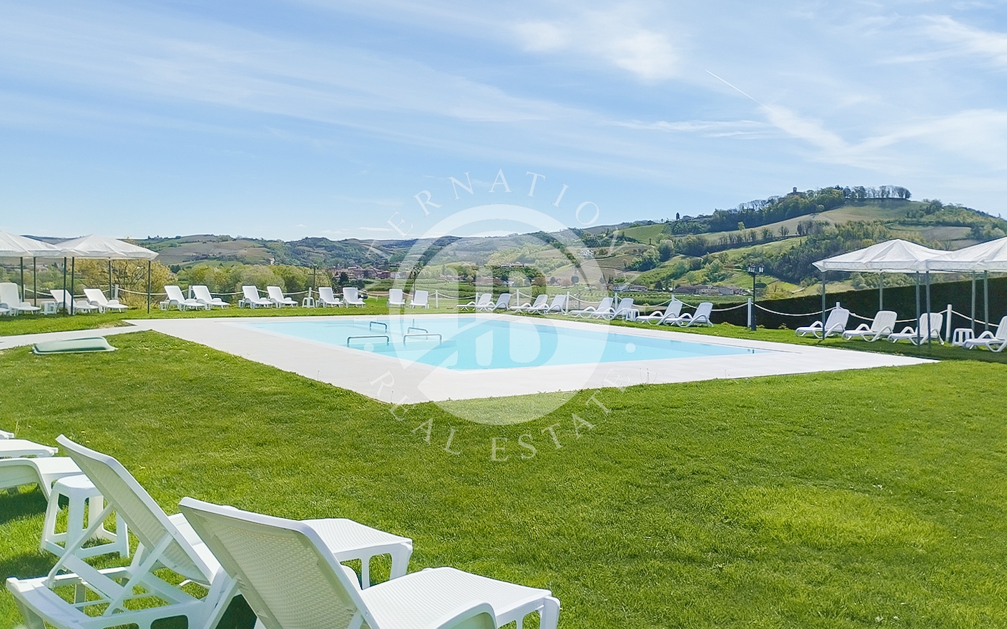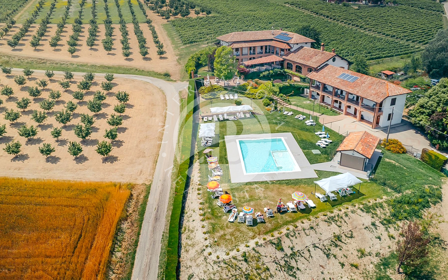 All'esterno, un elegante dehor regala una vista spettacolare sulle colline del Monferrato, mentre la piscina è immersa nel verde di un giardino. Sul retro della proprietà si trovano i vigneti, di Barbera DOCG e di Chardonnay.