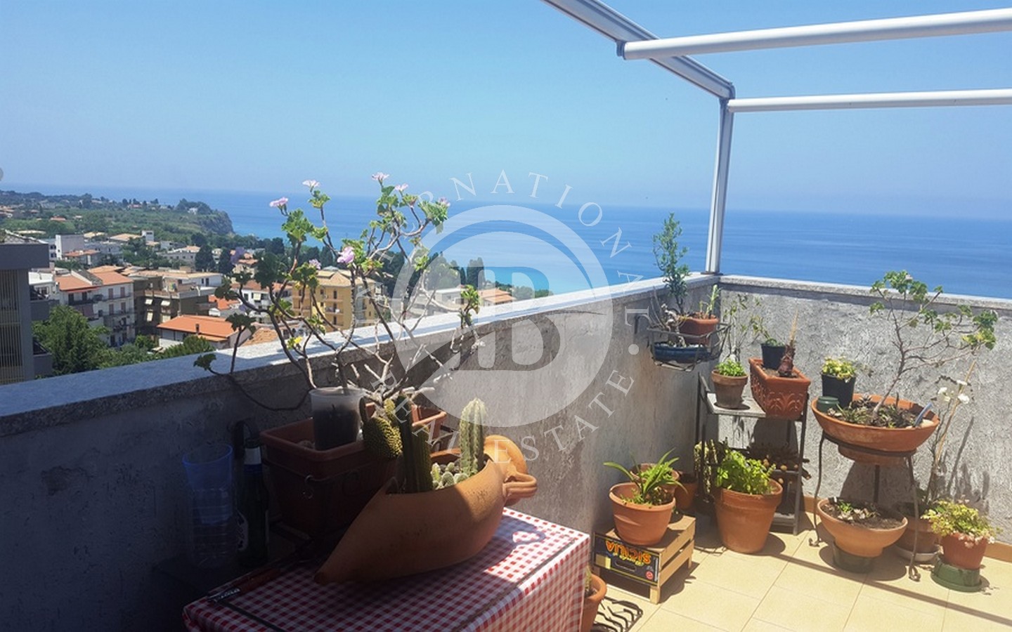 bero e panoramico garantisce che l'immobile sia quasi completamente soleggiato dal sorgere del sole al tramonto. L'appartamento misura 110 mq, a cui si aggiungono 30 mq di terrazzo panoramico con una vista esclusiva sulle isole Eolie e sul Golfo di Lamezia Terme. Le finiture interne includono pavimenti in piastrelle di marmo e infissi in legno douglas rigatino. Il riscaldamento è autonomo, con caldaia a gas metano.