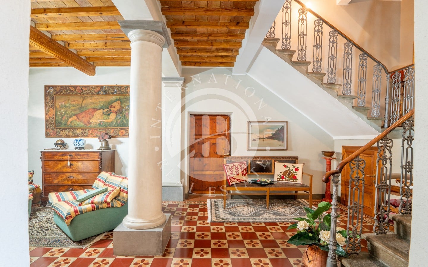 Il piano terra, con un ingresso ampio ed elegante, mette in risalto colonne e pavimenti piastrellati che conducono a una scala a vista. La prima unità abitativa comprende una grande sala da pranzo, salotto, cucina, due camere matrimoniali e un camino in funzione. Una predisposizione esistente permette di realizzare un bagno aggiuntivo al piano terra. Al mezzanino troviamo un bagno di servizio e una lavanderia.