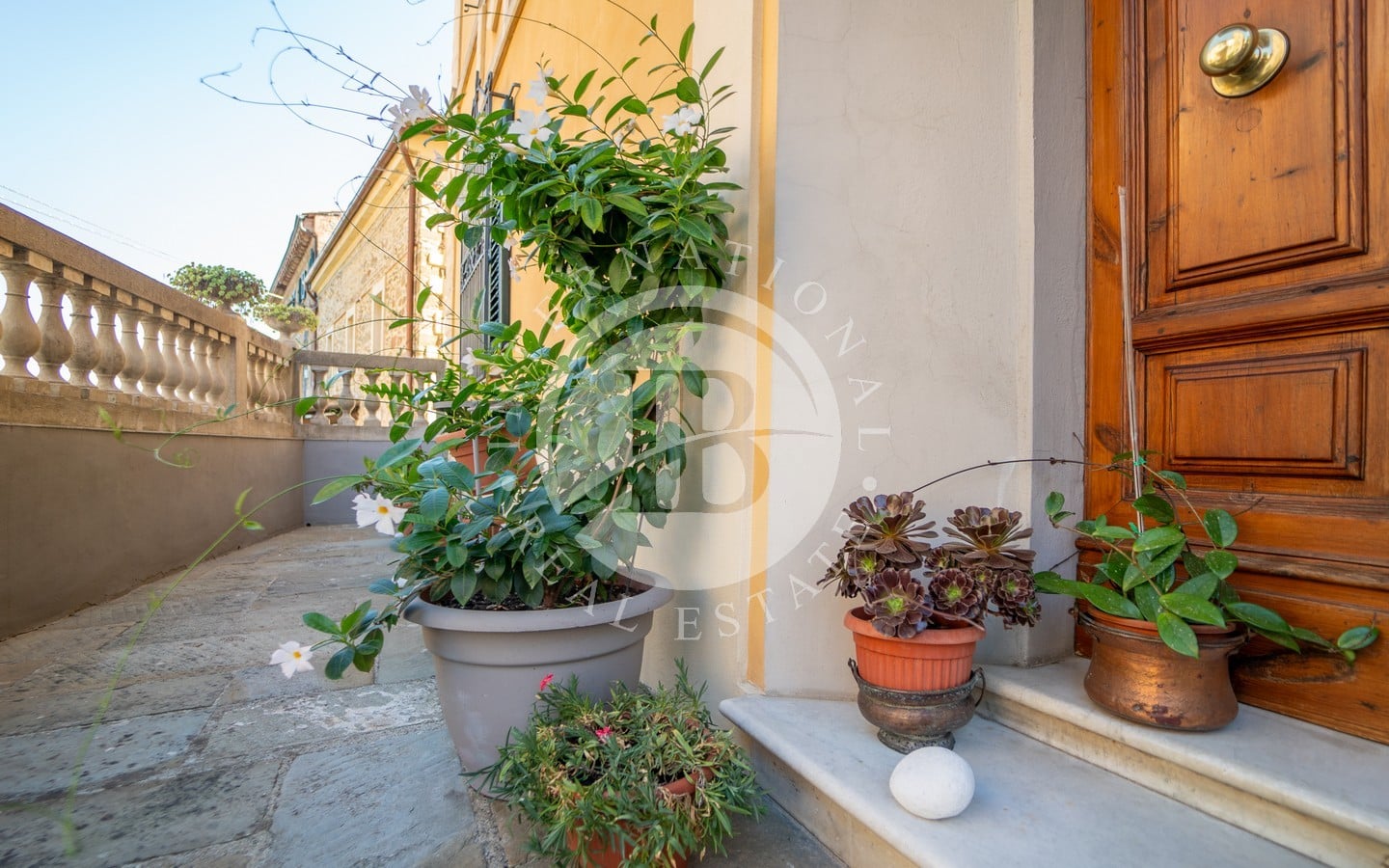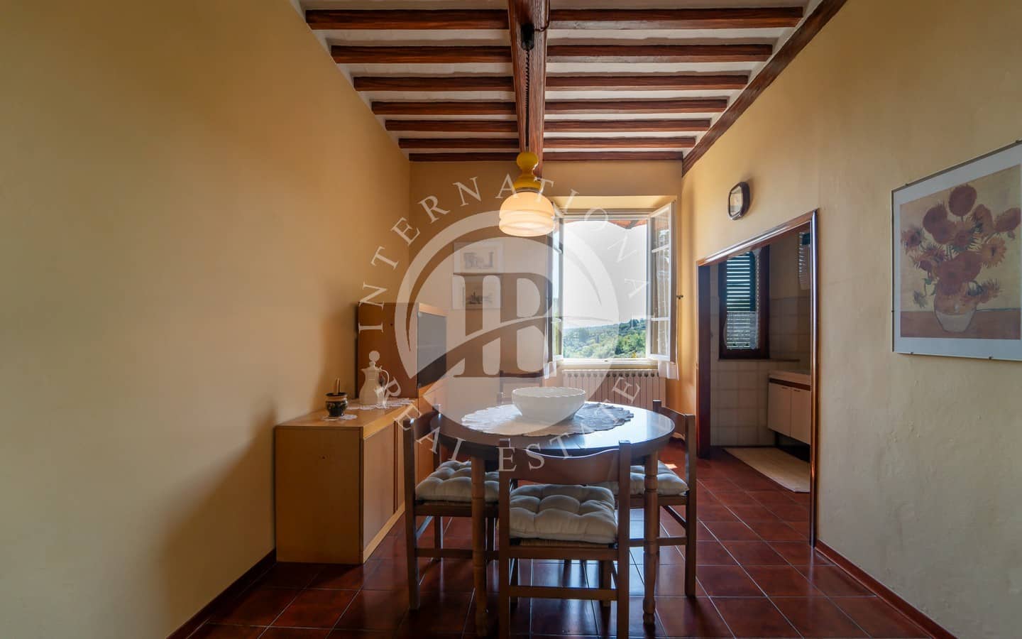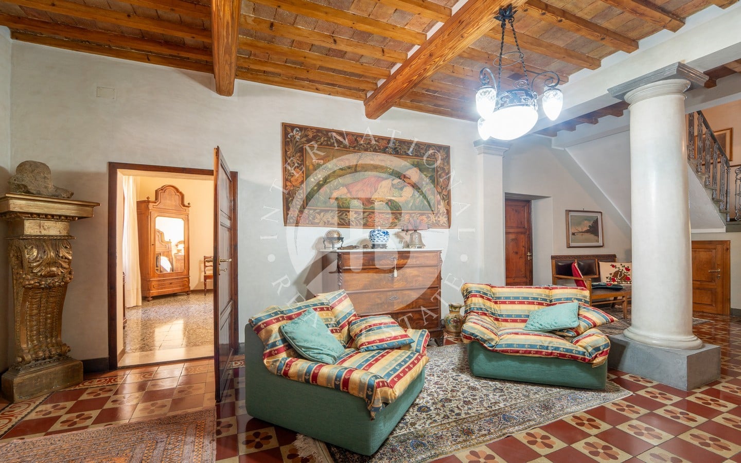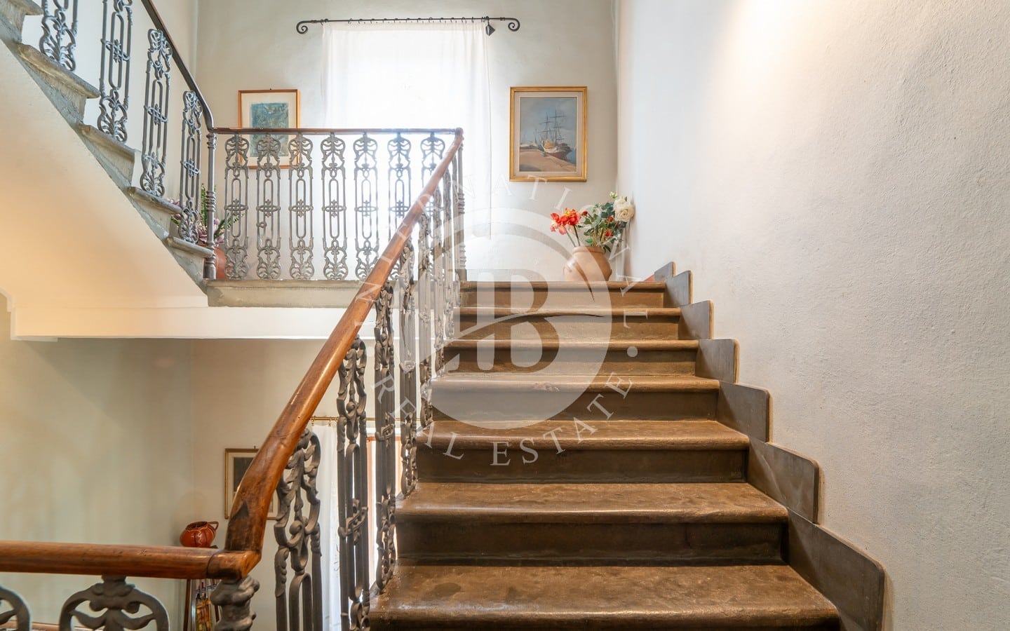 Il primo piano ospita un appartamento composto da cucina, sala da pranzo, tre camere da letto e un bagno. Al secondo piano, il terzo appartamento si distingue per uno stile più moderno, con rifiniture eleganti e dettagli curati. La cucina su misura in pregiato legno di castagno, il grande camino e il balcone panoramico che si affaccia sulle colline toscane sono alcuni dei tratti distintivi di questa unità. Due camere da letto, uno studio e un bagno completano questo piano.