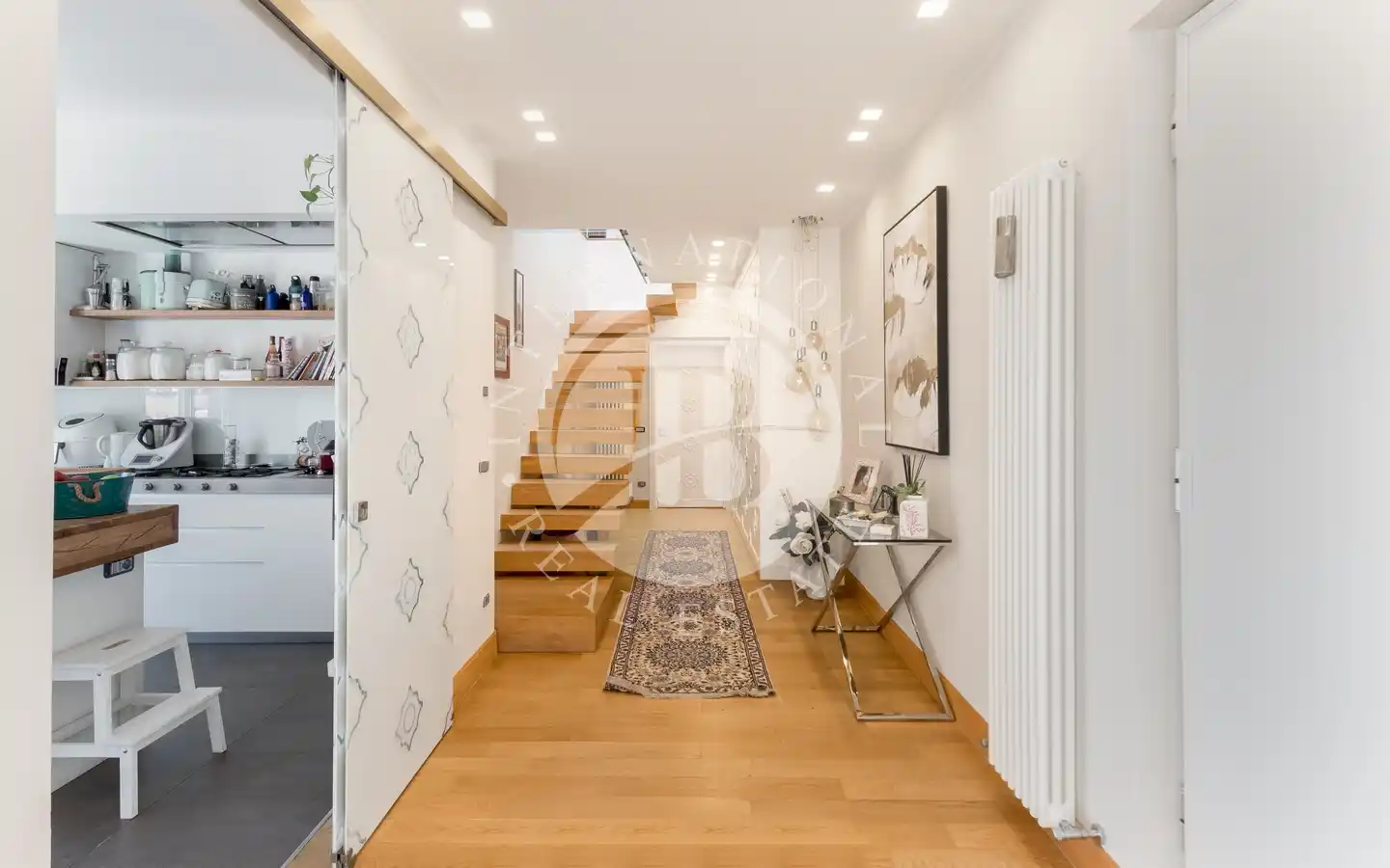 La cucina, moderna e perfettamente attrezzata, si affianca alla master bedroom con cabina armadio e bagno en-suite. Completano il livello una seconda camera, un bagno e una pratica lavanderia.