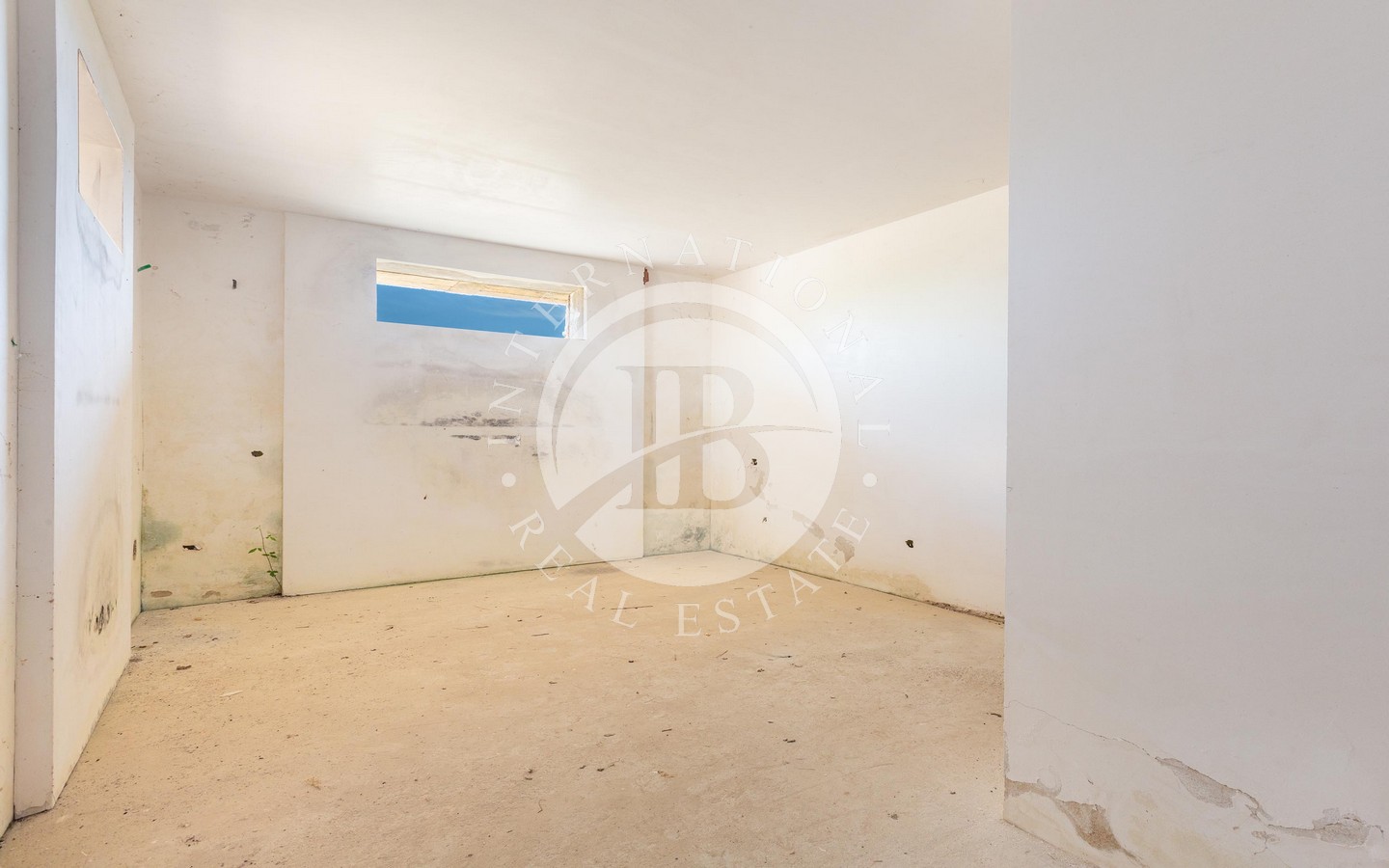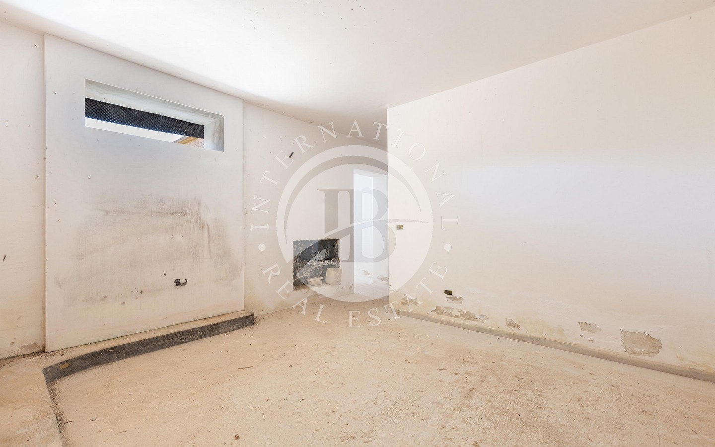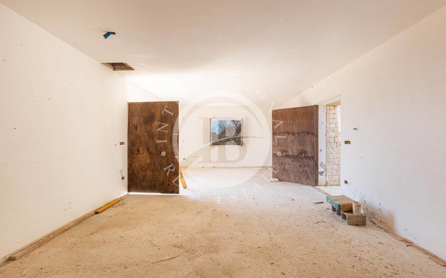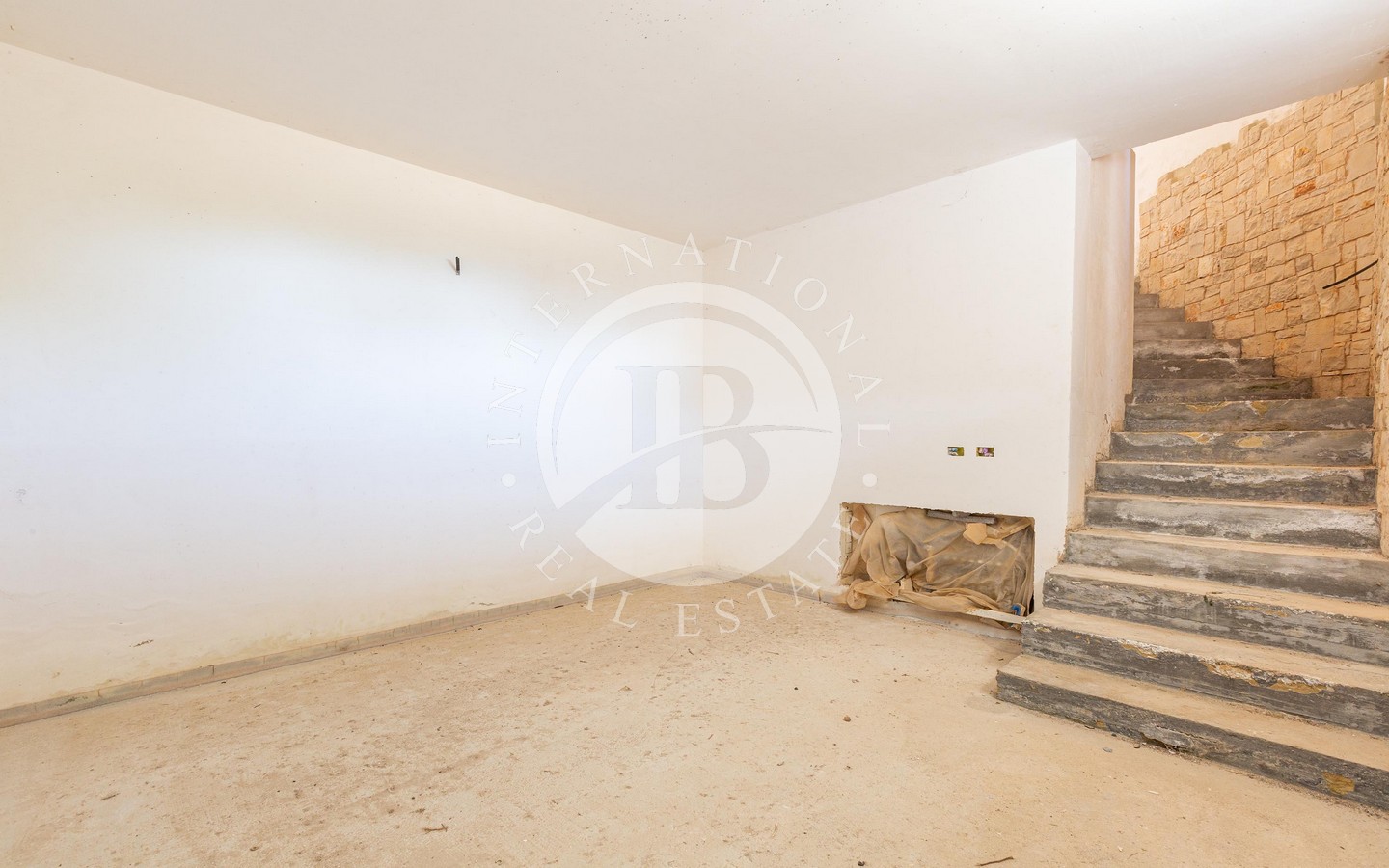 minoso soggiorno, un bagno di servizio, un angolo cucina e uno spazioso living. Le scale interne conducono al piano inferiore, dove si trova la zona notte con una master bedroom dotata di cabina armadio e bagno en suite, una camera doppia, un bagno completo e un'area relax trasformabile in una terza camera da letto. Gli interni, pur essendo in stato rustico avanzato, sono predisposti per un impianto di riscaldamento e raffrescamento a pavimento, garantendo comfort tutto l'anno.