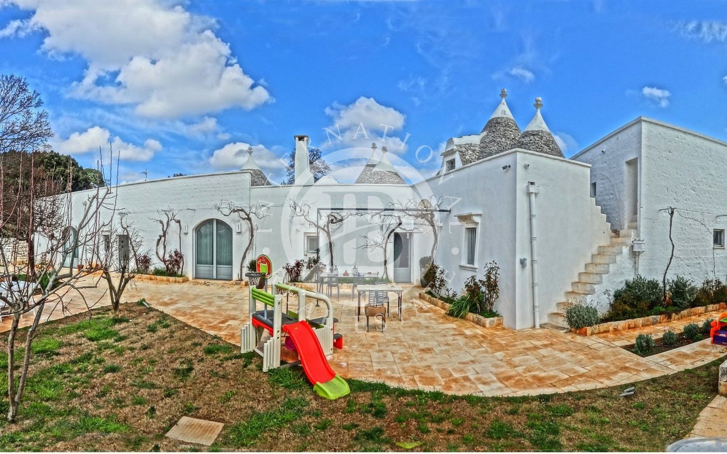 Questo casale masseria panoramico è composto da un corpo principale ristrutturato con trulli, offrendo 5 camere da letto, ampi spazi comuni e 4 bagni, oltre a un cortile lastricato in pietra.