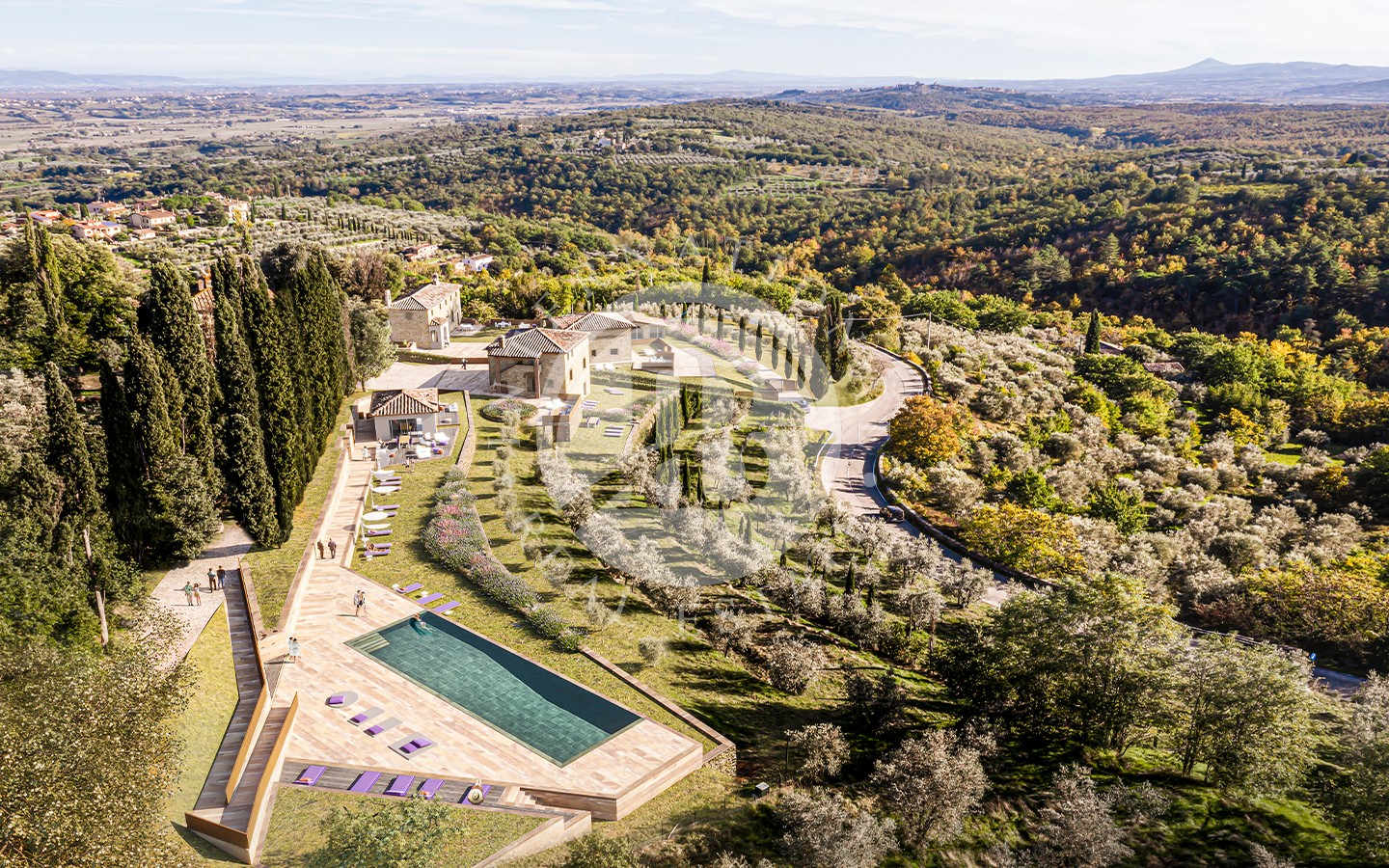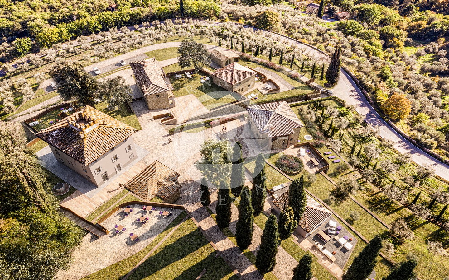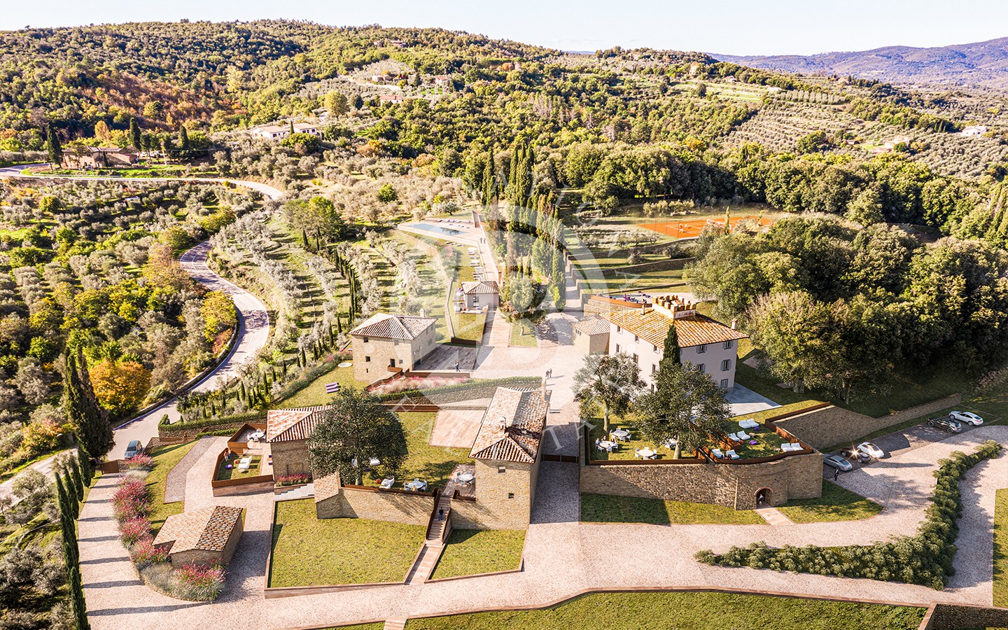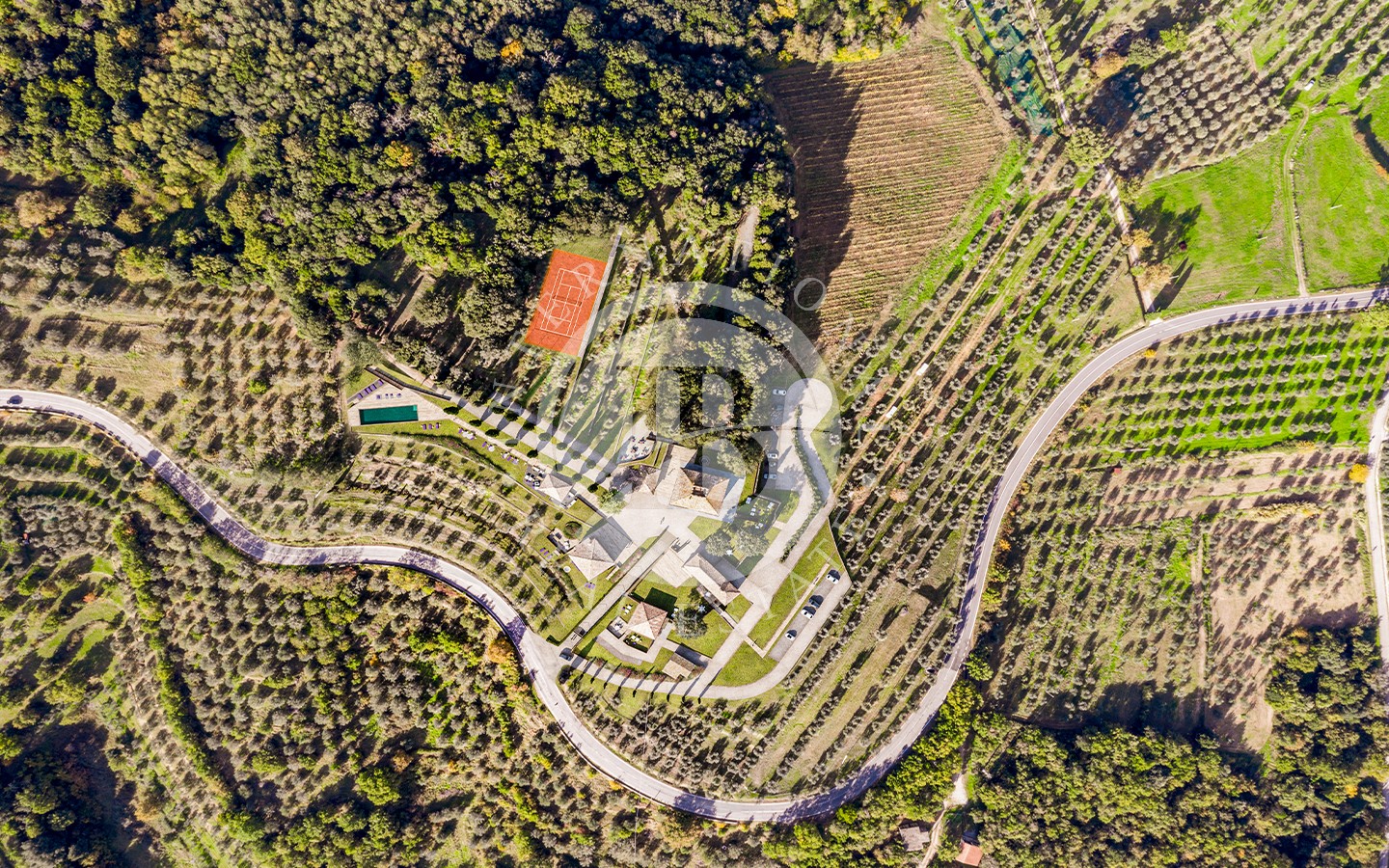 I sette ettari di terreno che circondano il complesso regalano una sensazione di tranquillità e isolamento. Gli spazi esterni sono studiati per il massimo del relax e del divertimento: da una piscina immersa nel verde, a un campo da tennis regolamentare, fino a un ampio parco ideale per le passeggiate nella natura. La presenza di una limonaia e un uliveto aggiunge un tocco di charme rurale a questa magnifica proprietà.