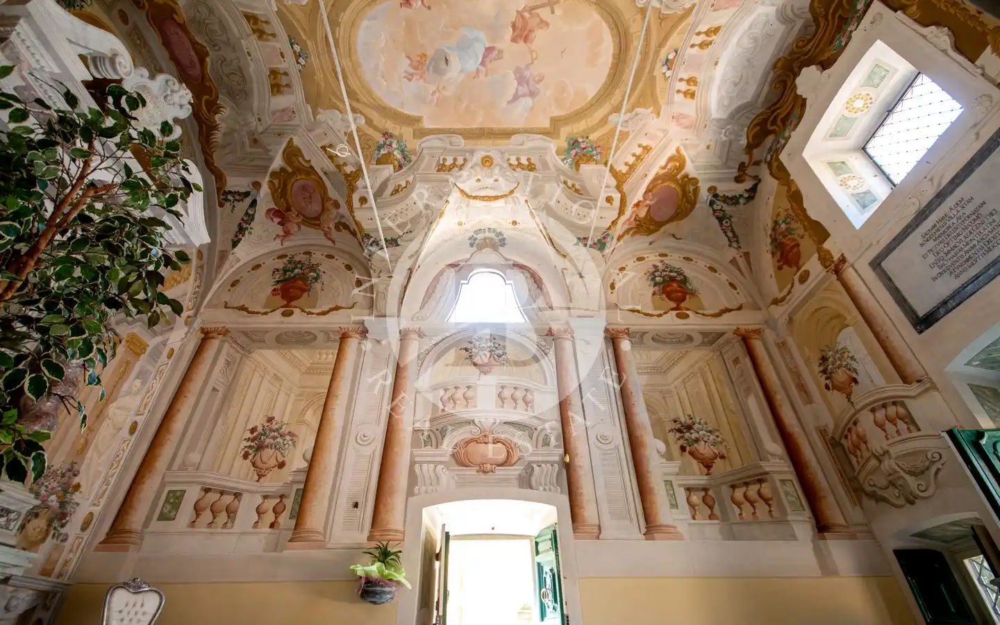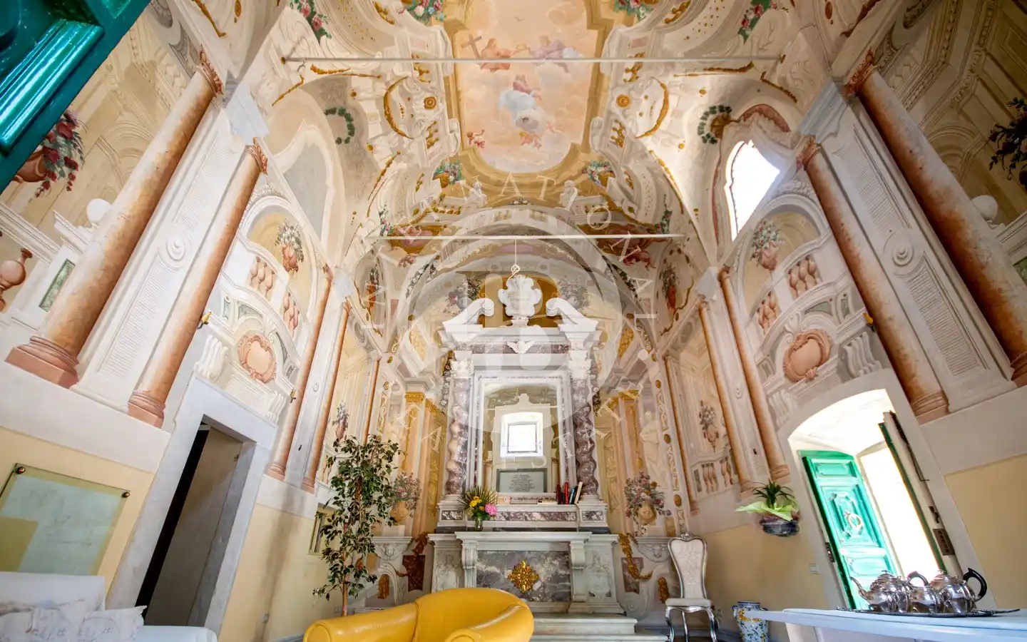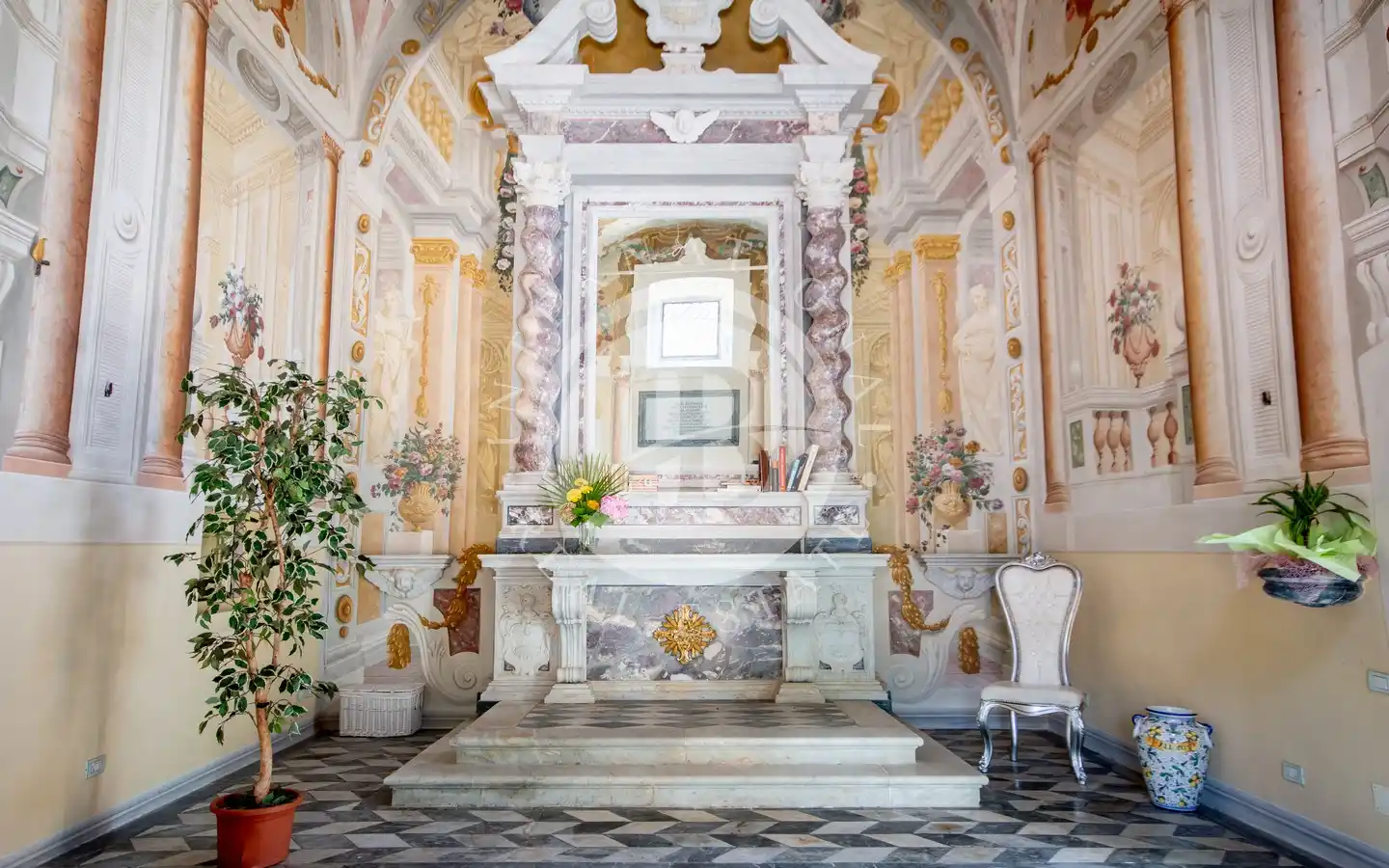 al pittore settecentesco Pietro Paolo Scorsini, autore anche degli affreschi di Palazzo Pfanner a Lucca. A impreziosire ulteriormente l’interno vi è un altare in marmo bianco con intarsi policromi e decorazioni dorate, che rende lo spazio un autentico scrigno d’arte già predisposto per accogliere una cucina.